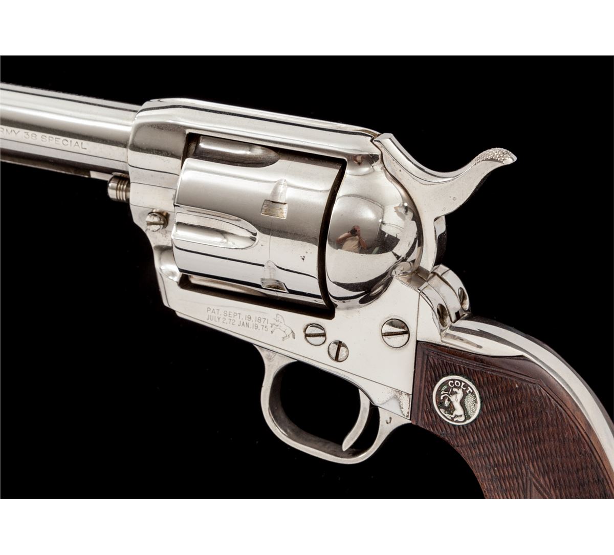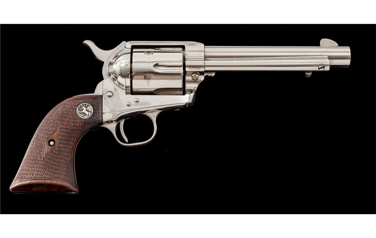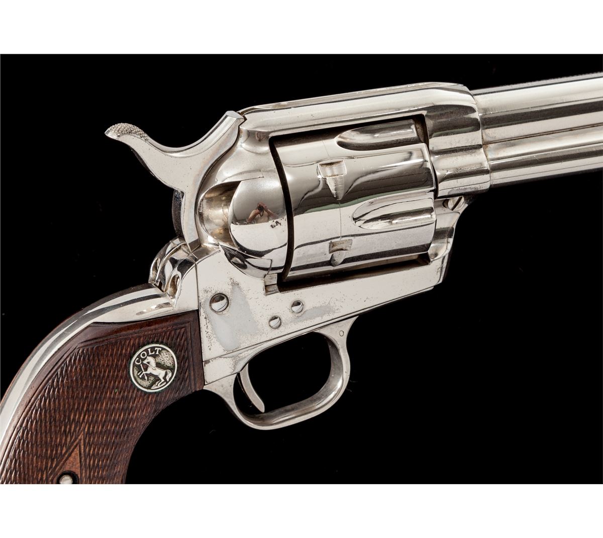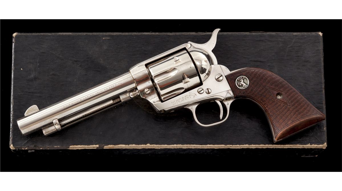 Colt 2nd Generation Single Action Army Revolver, #19244SA, .38 Spec. cal., 5-1/2'' barrel, nickel finish, checkered walnut grips with pre-war Colt medallions. In unnumbered period correct Colt black box. Mfg'd 1958. Condition is excellent showing minor discoloration to right side of frame as thinning to nickel and small area to left side of triggerguard. Cylinder with light index mark. Grips and action are crisp, bore is bright. Box with thinning and losses along forward edge of lid; good end label. No visible serial number to bottom of box. Est.: $1,800-$2,400. (C&R/PPT)