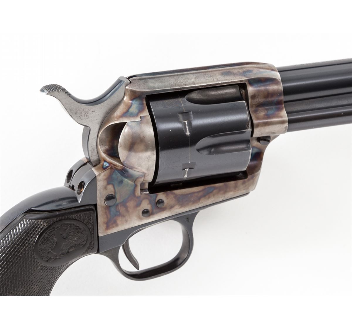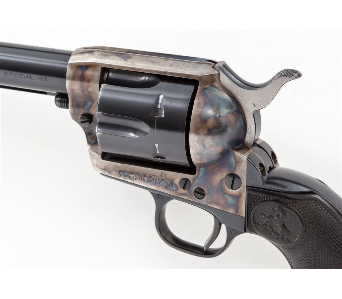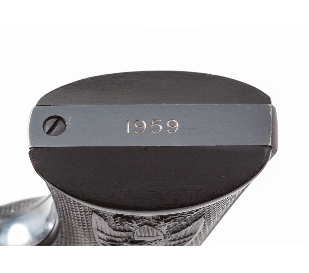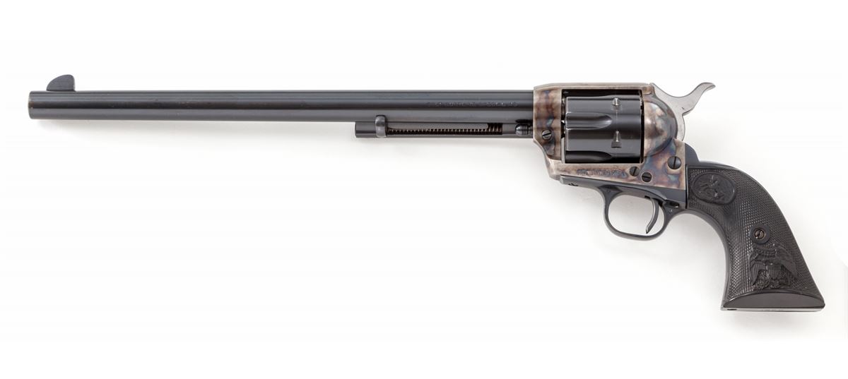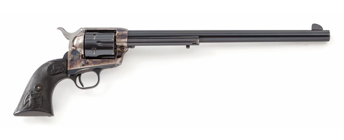 Arvo Ojala inscribed Colt 2nd Generation Buntline Special Single Action Revolver, with #19300SA, .45 Colt cal., 12'' barrel, blue and case hardened finish, factory checkered hard rubber grips with American eagles. Butt neatly pantographed ''1959'', and backstrap inscribed ''Arvo Ojala'' (1920-2005), who was a famous Hollywood technical advisor on the subject of quickdraw with a revolver. His most famous role was the unnamed man shot in the opening sequences of ''Gunsmoke''. His fastdraw holster rigs are legendary to this day. Among the TV and film stars taught by Arvo were James Arness, Robert Culp, James Garner, Kevin Kline, Paul Newman, Hugh O'Brien and Clint Walker. Mfg'd 1959. Condition is excellent retaining approx. 96%+ factory finish with thinning to backstrap and ejector rod housing. Grips with minor flattening with light aberration to grip screw slot. Action is crisp with light index mark to cylinder; bore is bright. Est.: $1,800-$2,400. (C&R/PPT)