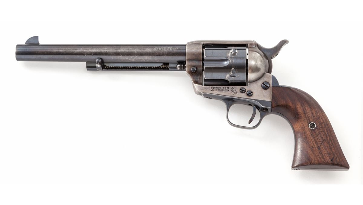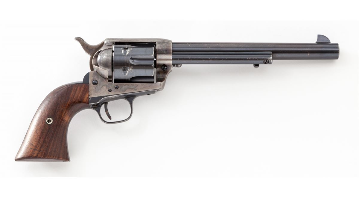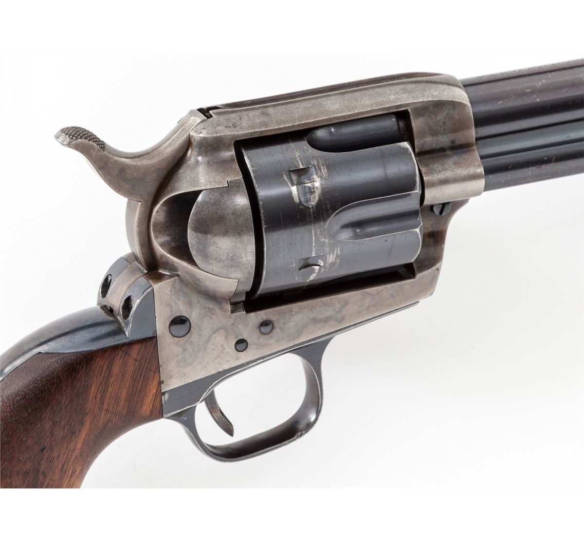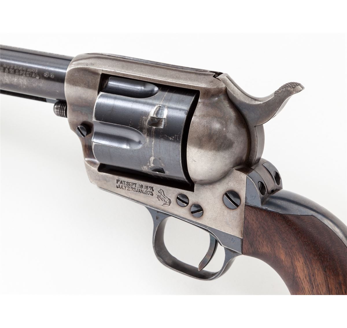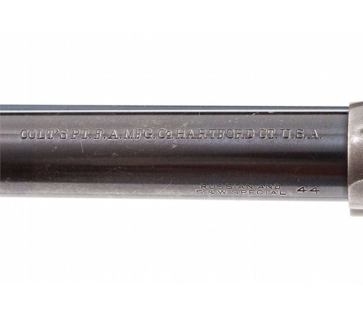 Scarce Colt Single Action Army Revolver, #342797, .44 Russ. & S&W Spec. cal., 7-1/2'' barrel, blue and case colored finish, case hardened serrated trigger, and two-piece walnut grips. Mfg'd 1921. Condition is fine to near excellent retaining approx. 87% blue with even thinning to barrel, and light general wear to cylinder with moderate index marking. Backstrap retains approx. 92% blue with thinning at heel. Frame shows approx. 70% muted case colors, somewhat more pronounced to hammer, with thinning in actioning areas. Grips with oil staining and minor scuffs. Action is crisp, bore is bright. Est.: $4,500-$6,000. (C&R/PPT)