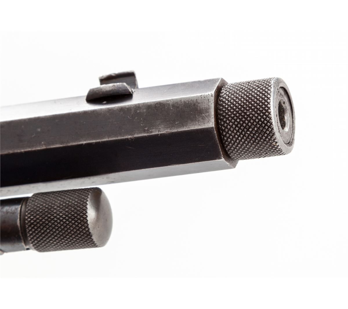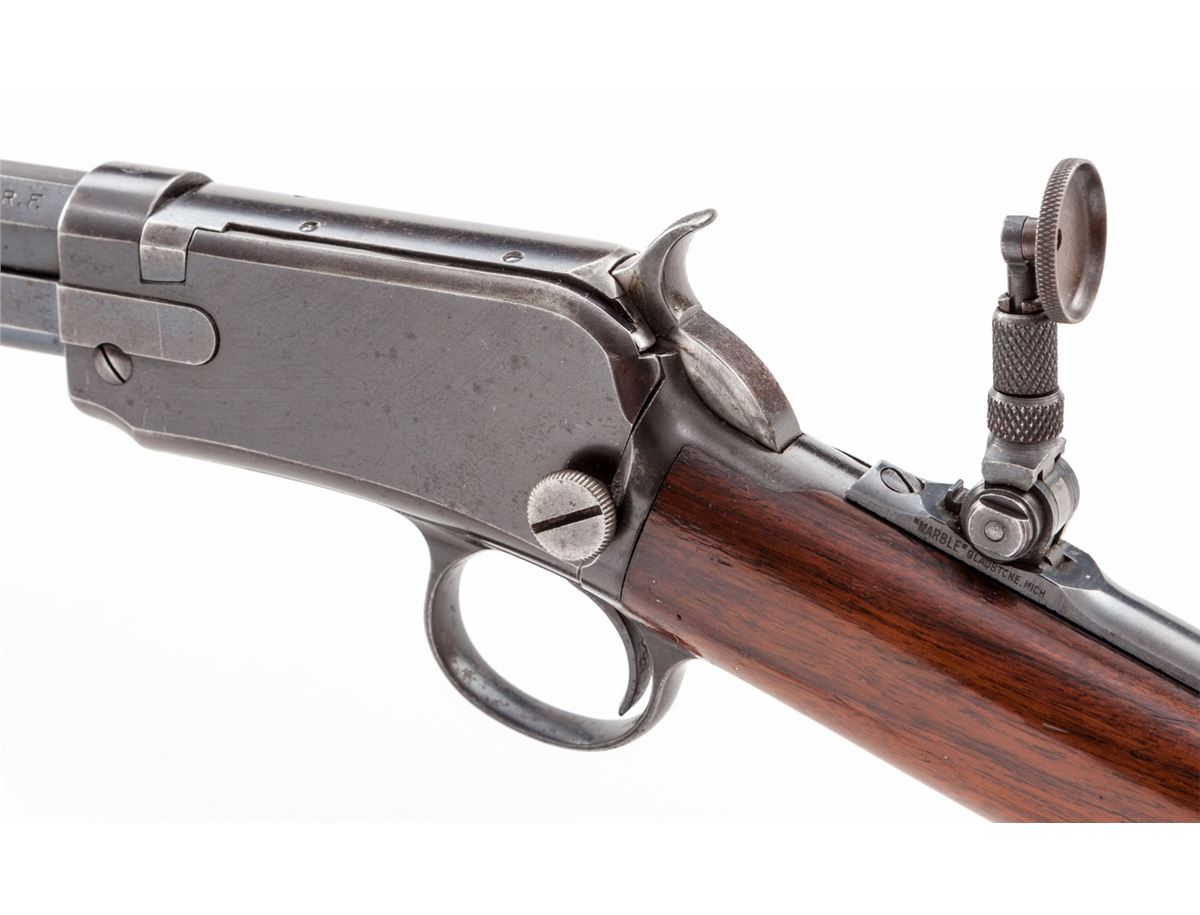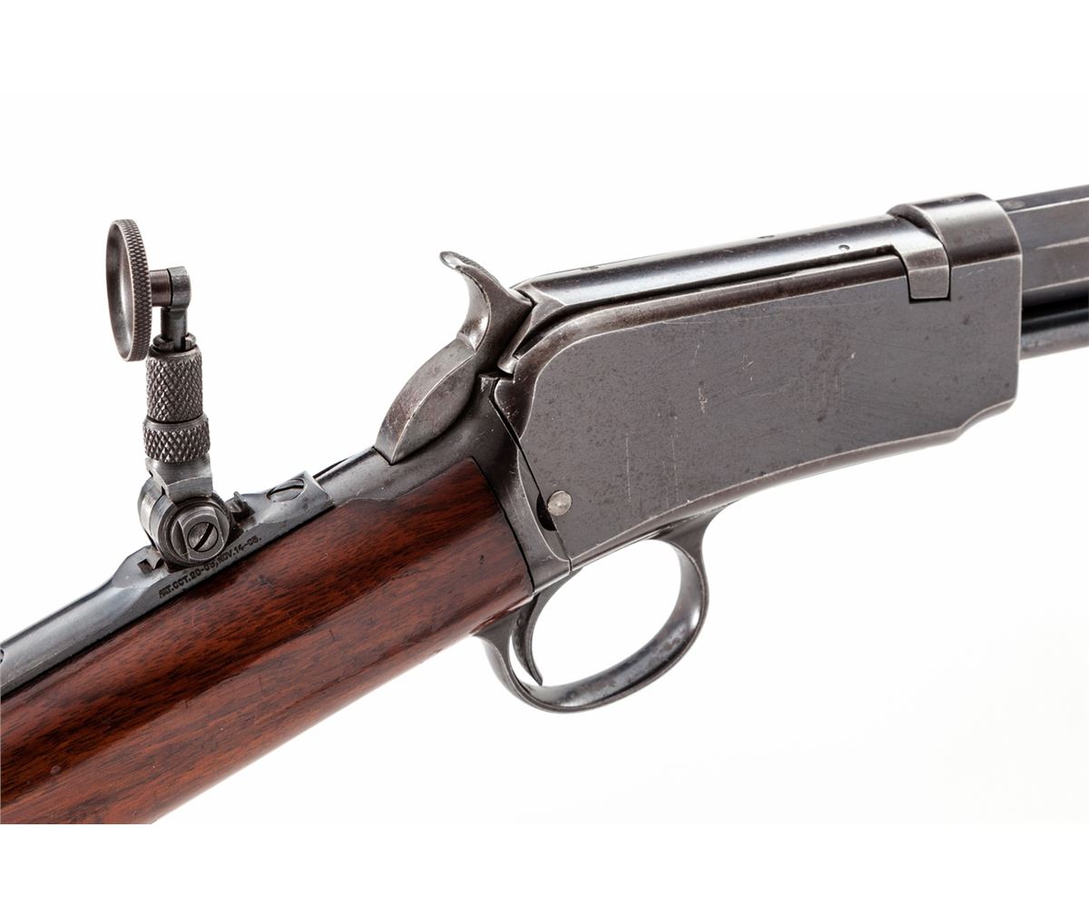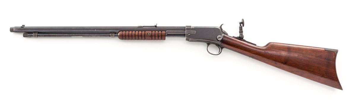 Rare Winchester Model 1890 Boy's Pump Action Rifle, #410752, .22 WRF cal., rare short 20'' octagonal barrel with threaded tip and knurled cover, blue finish, factory 1'' shorter-than-standard buttstock, with Marbles tang sight and standard front and rear sights. Mfg'd 1910. Condition is near excellent retaining approx. 90%-92% factory blue with losses as light general thinning. Stock with minor impressions. Buttplate with approx. 40% moderately toning blue. Action is good, bore is very good. Est.: $7,000-$9,000. (C&R)