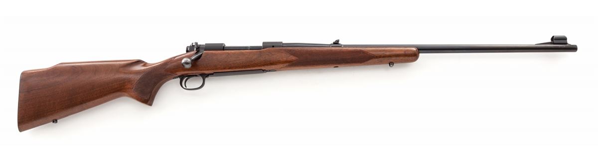 Pre-64 Winchester Model 70 Bolt Action Rifle, #205343, .30-06 cal., 24'' barrel, blue finish, checkered walnut stock, swivel eyelets, with original checkered steel buttplate. Mfg'd 1951. Condition is fine to near excellent showing just light field use as thinning at muzzle and rear receiver ring. Buttplate retains approx. 92% of its original blue. Stock shows very minor marks from handling as light scuffs and micro-scratching. Action remains crisp, bore is bright. Est.: $750-$1,000. (C&R)