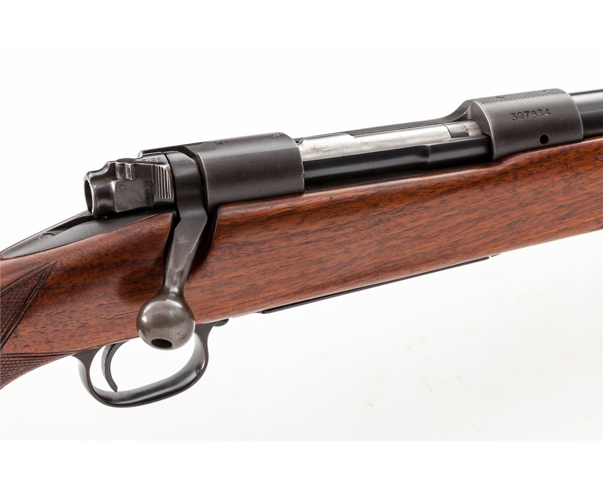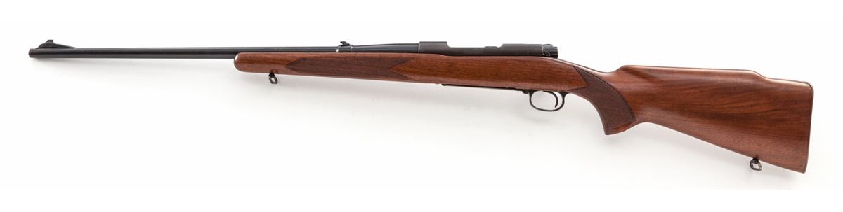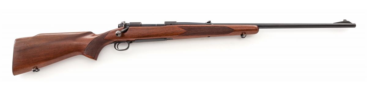 Pre-64 Winchester Model 70 Bolt Action Rifle, #307984, .257 Robts. cal., 24'' barrel, blue finish, checkered walnut stock, sling swivels, with original checkered steel buttplate. Mfg'd 1954. Condition is fine to near excellent showing just light field use as thinning at muzzle and forward receiver ring. Triggerguard also shows minor wear at side edges. Buttplate has toned a silvery gray. Stock with minor marks from handling and some flattening to checks. Action remains crisp, bore is bright. Est.: $1,000-$1,500. (C&R)