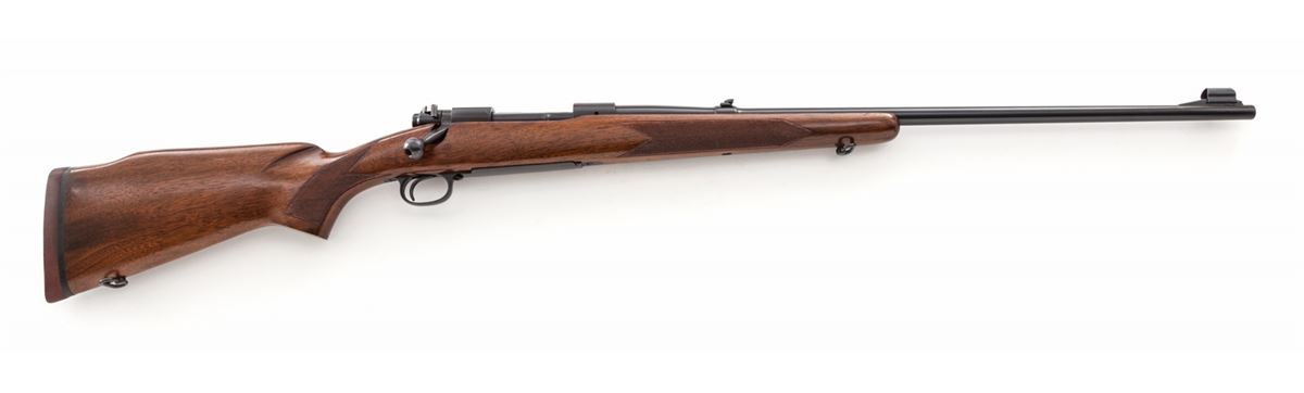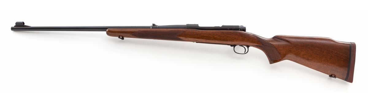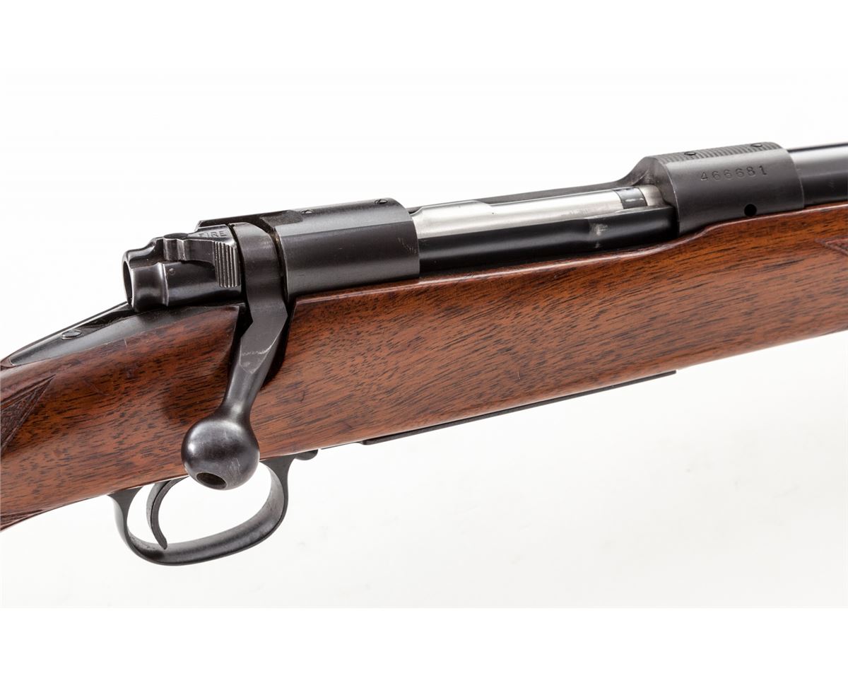 Pre-64 Winchester Model 70 Bolt Action Rifle, #466681, .338 Win. mag. cal., 25'' barrel, blue finish, checkered walnut stock, sling swivels, with factory Winchester red rubber butt pad. Mfg'd 1960. Condition is fine to near excellent showing just light field use. Rubber butt pad is lightly soiled and should easily clean. Stock shows minor marks from handling as light scuffs and micro-scratching. Action remains crisp, bore is bright. Est.: $1,200-$1,800. (C&R)