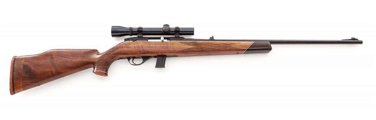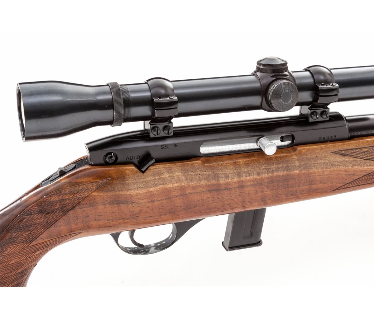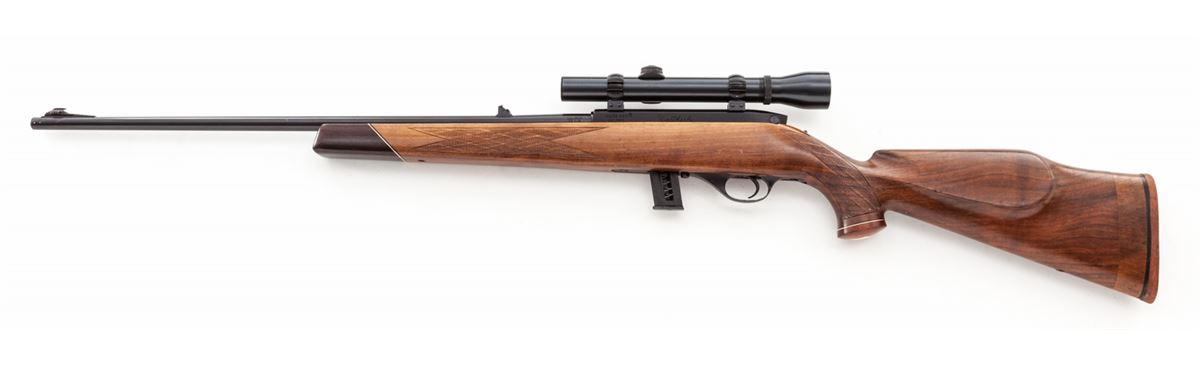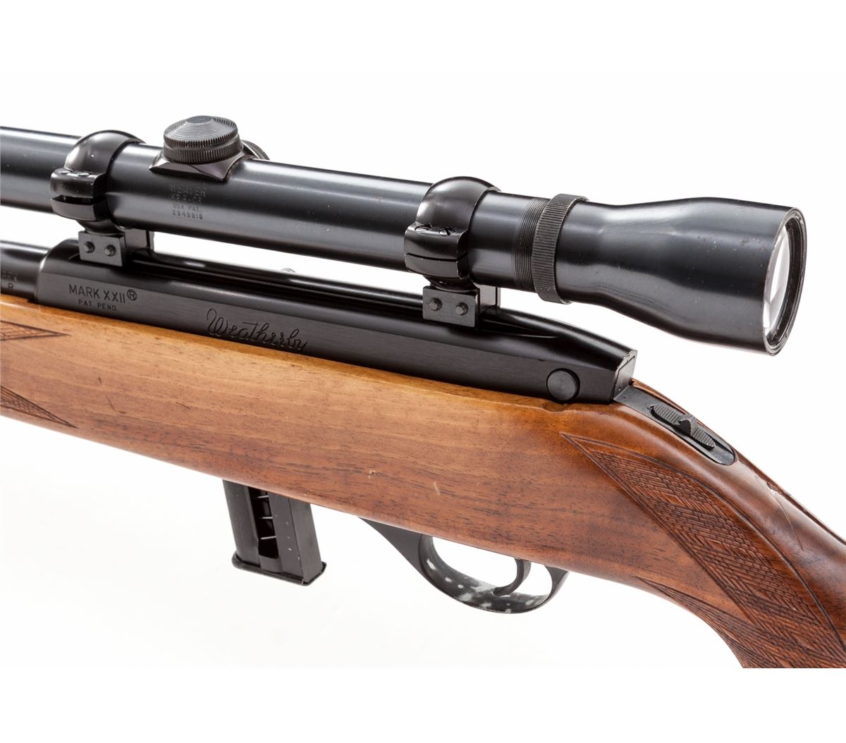 Weatherby MK XXII Semi-Automatic Rifle, #24035, .22 LR cal., 24'' barrel, blue finish, skipline checkered cheekpiece extended walnut stock, with Weaver K2.5 scope. Condition is fine. Metal surfaces retain approx. 97% finish with losses towards muzzle. Stock with scuffs and scratches and thinning to anodized finish inside triggerguard. Sling swivels have been removed. Action is crisp, bore is bright, scope optics are clear. Est.: $350-$500. (Modern)