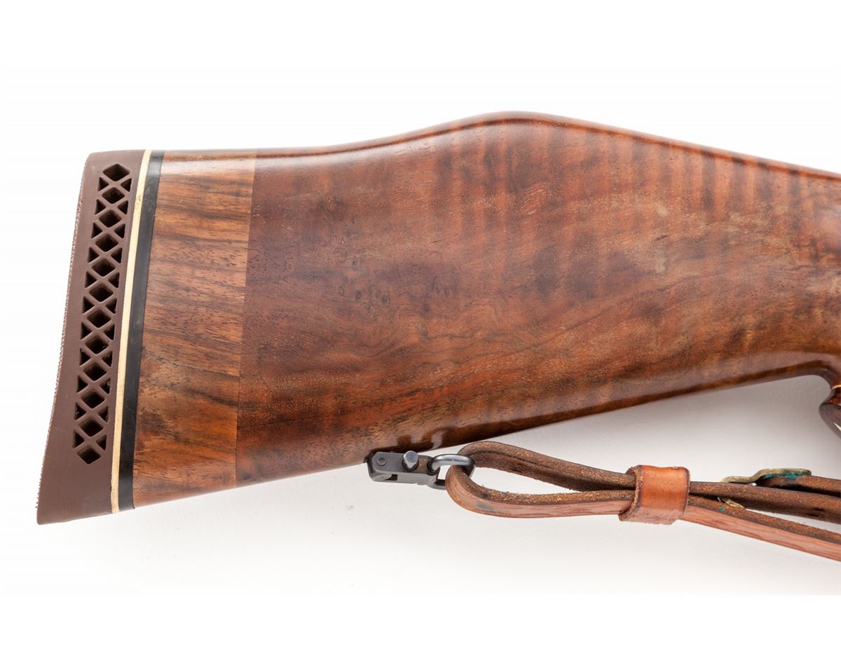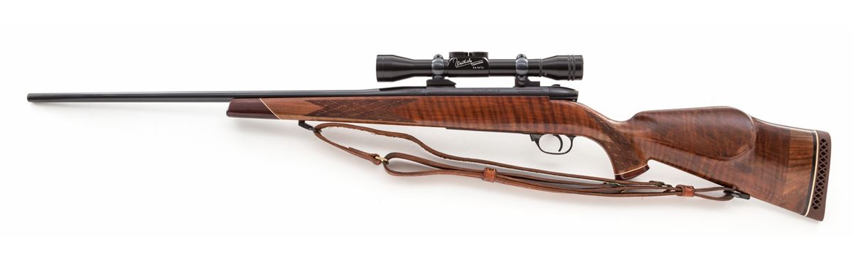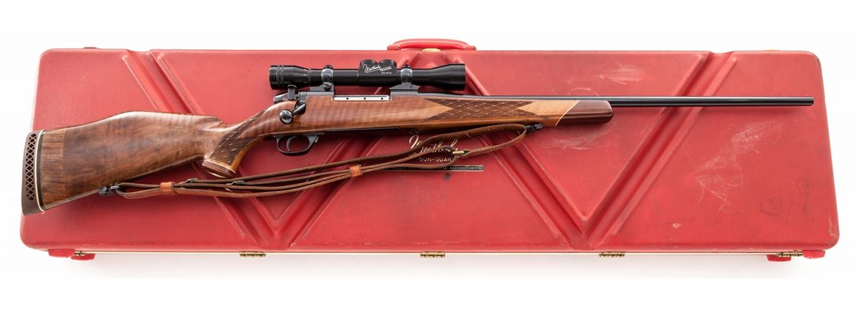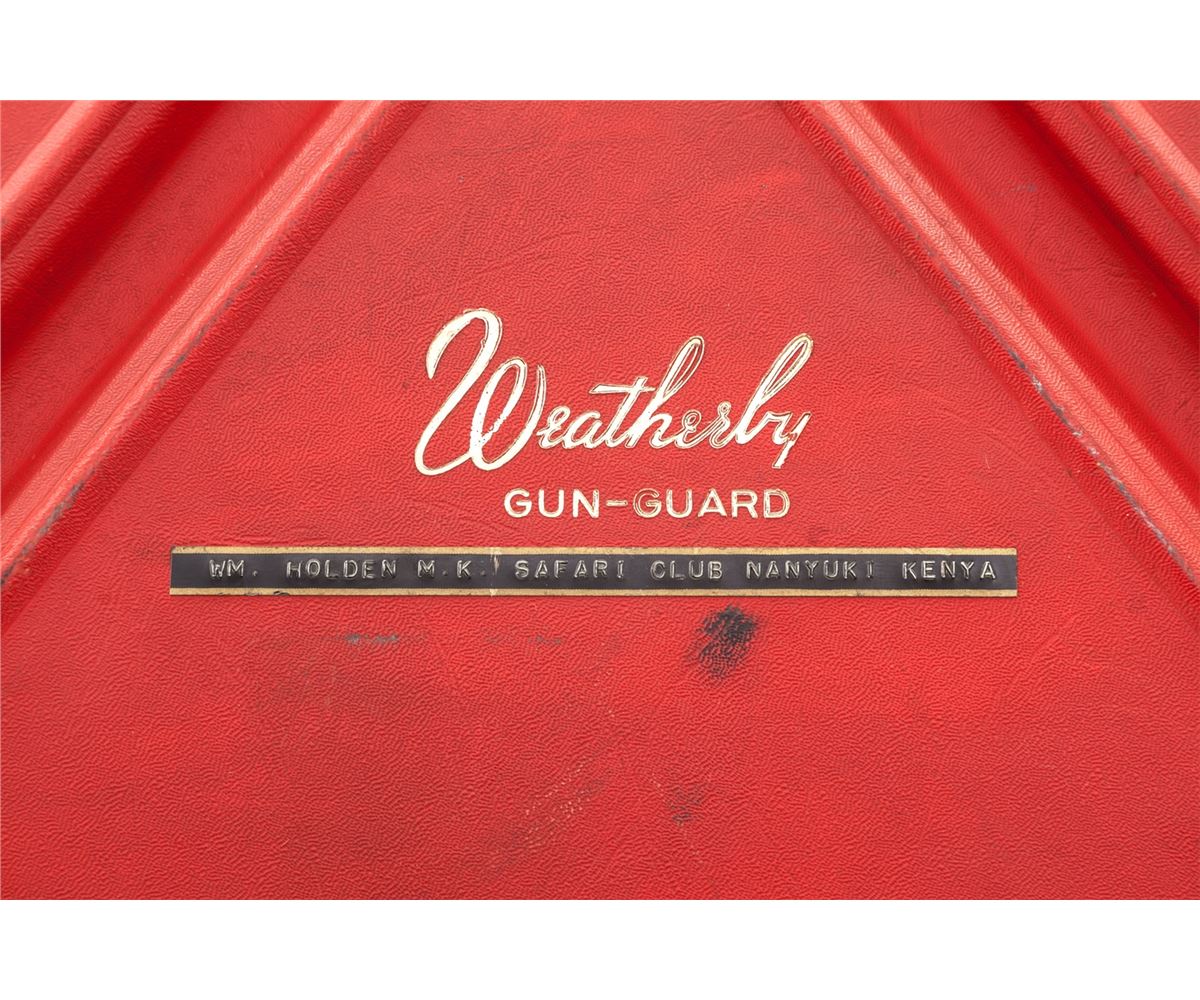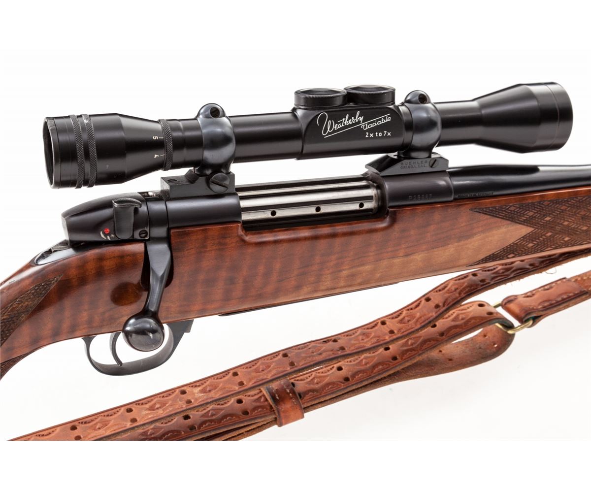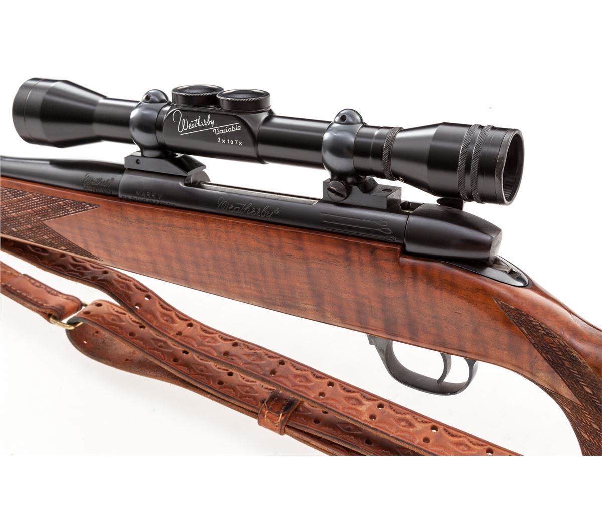Weatherby MK V Bolt Action Rifle, #P26587, .257 Wea. mag. cal., 24'' barrel, blue finish, skipline checkered cheekpiece extended walnut stock, with Weatherby Variable 2x to 7x scope on Buehler rings and mounts. Condition is excellent retaining approx. 98% original blue. Stock with some thinning to finish in cheek area. Action is crisp, bore is bright, scope optics are clear. With leather sling and red Weatherby hard case labels ''Wm. Holden, MK Safari Club, Nanyuki, Kenya''. Est.: $1,200-$1,800. (Modern)