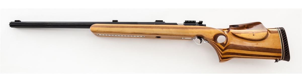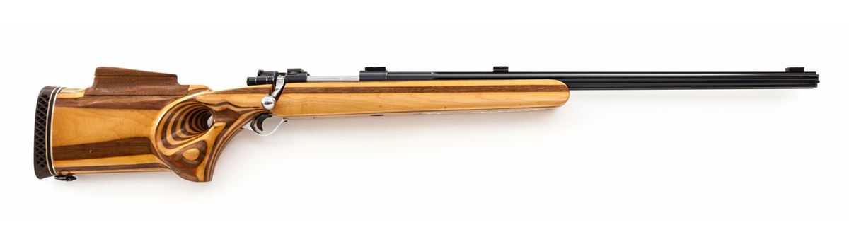 Custom Built Bolt Action Single Shot Benchrest Rifle, receiver by DWM, #K5801, .308 Norma cal., 26'' custom fluted barrel, laminated cheekpiece thumbhole target stock. Receiver is set up for International rear sight, with dovetail block for front sight and target scope. Receiver is glass bedded into stock; barrel floats freely. Trigger is light and crisp. Condition is near excellent as extensively modified for target use. Action is good, bore is very good. Est.: $600-$800. (C&R)