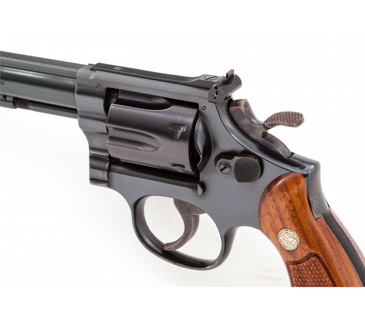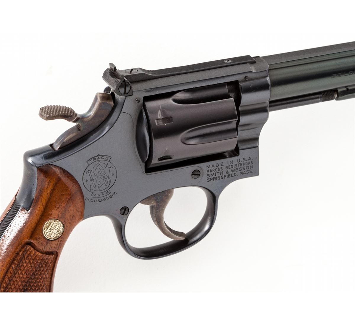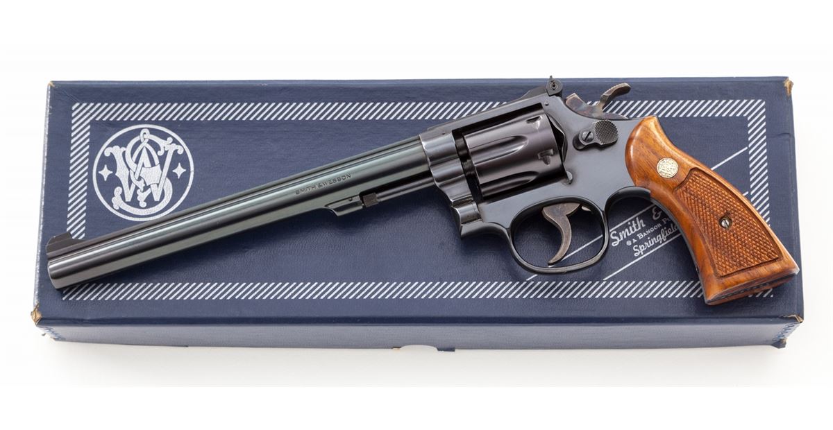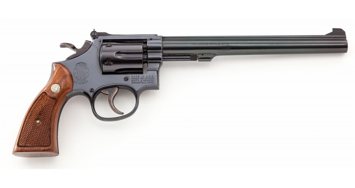 Smith & Wesson Model 17-4 Double Action Revolver, #87K8725, .22 LR cal., 8-3/8'' barrel, blue finish, checkered medallion walnut grips, Patridge front and standard adjustable rear sights, with pre-1981 pinned barrel. Condition is excellent, appearing as new, in original box. Est.: $750-$1,000. (Modern/PPT)