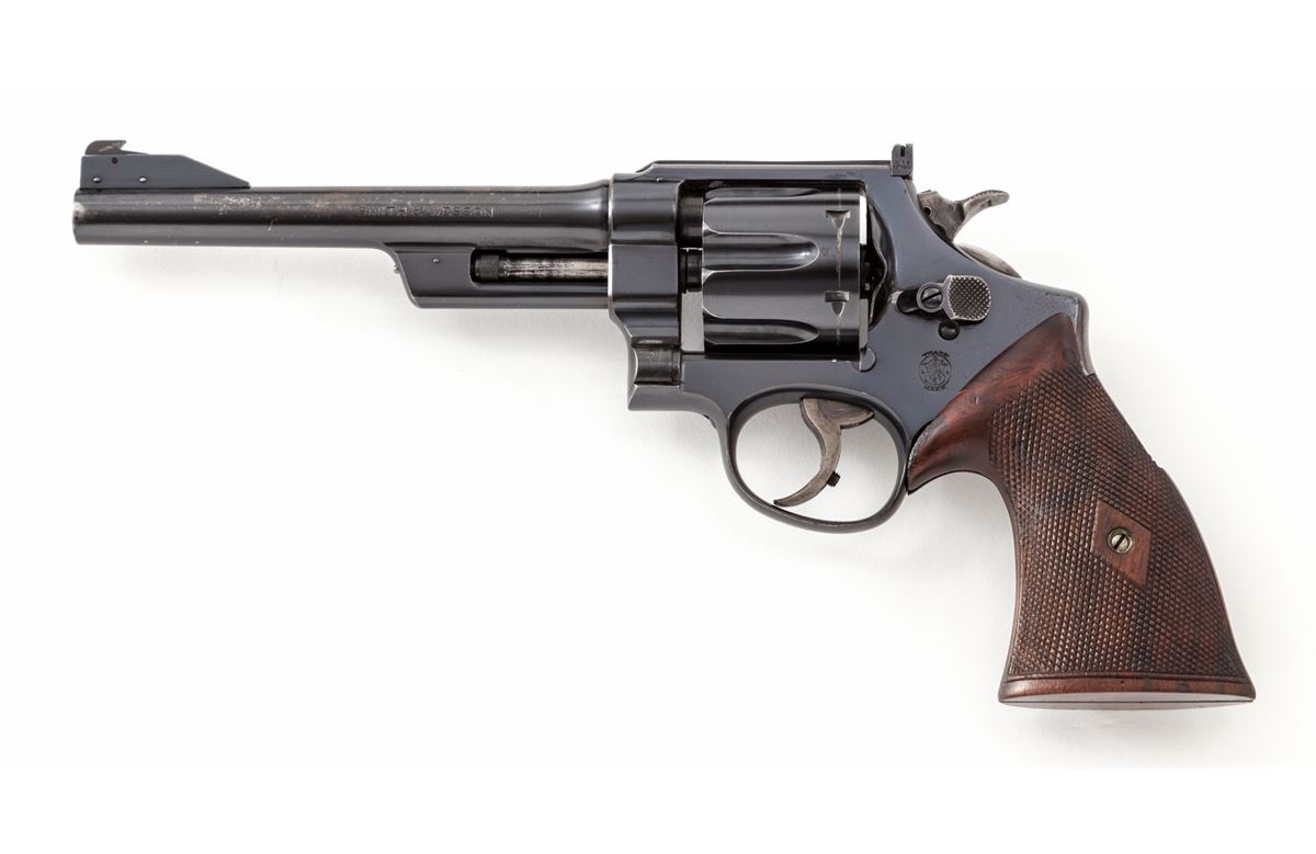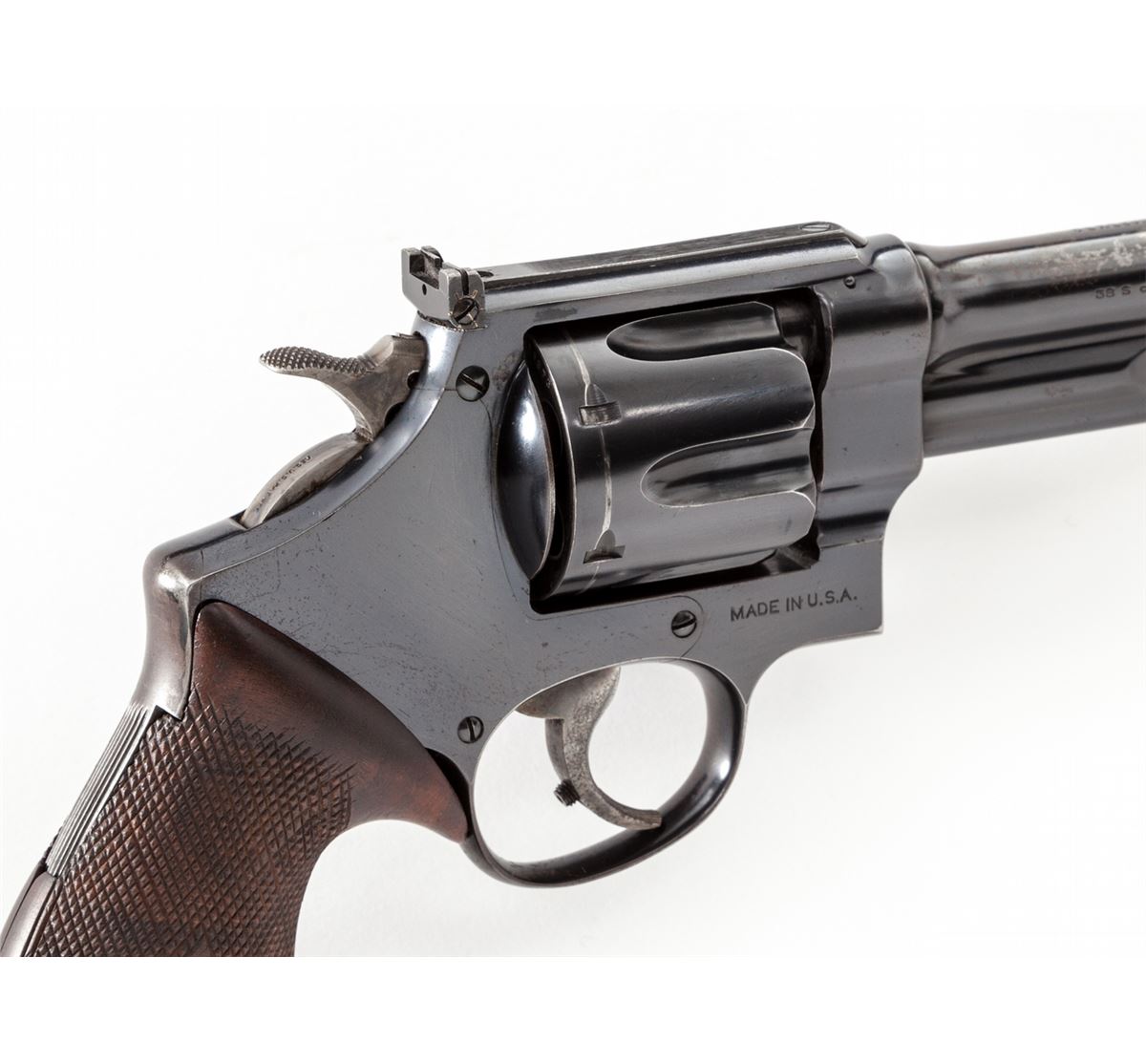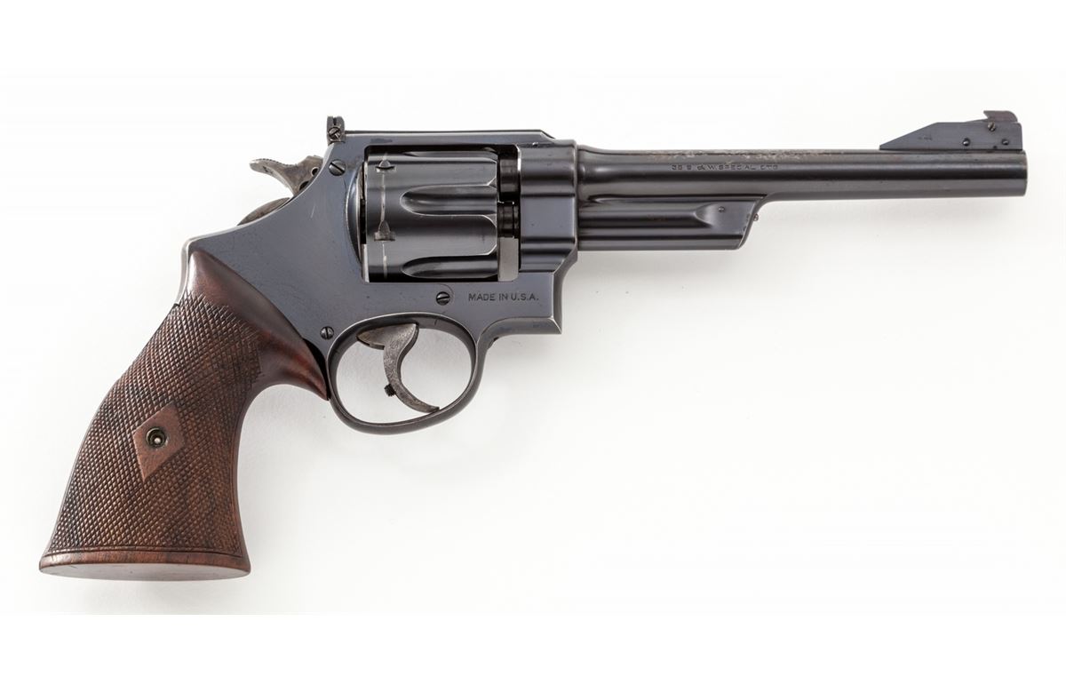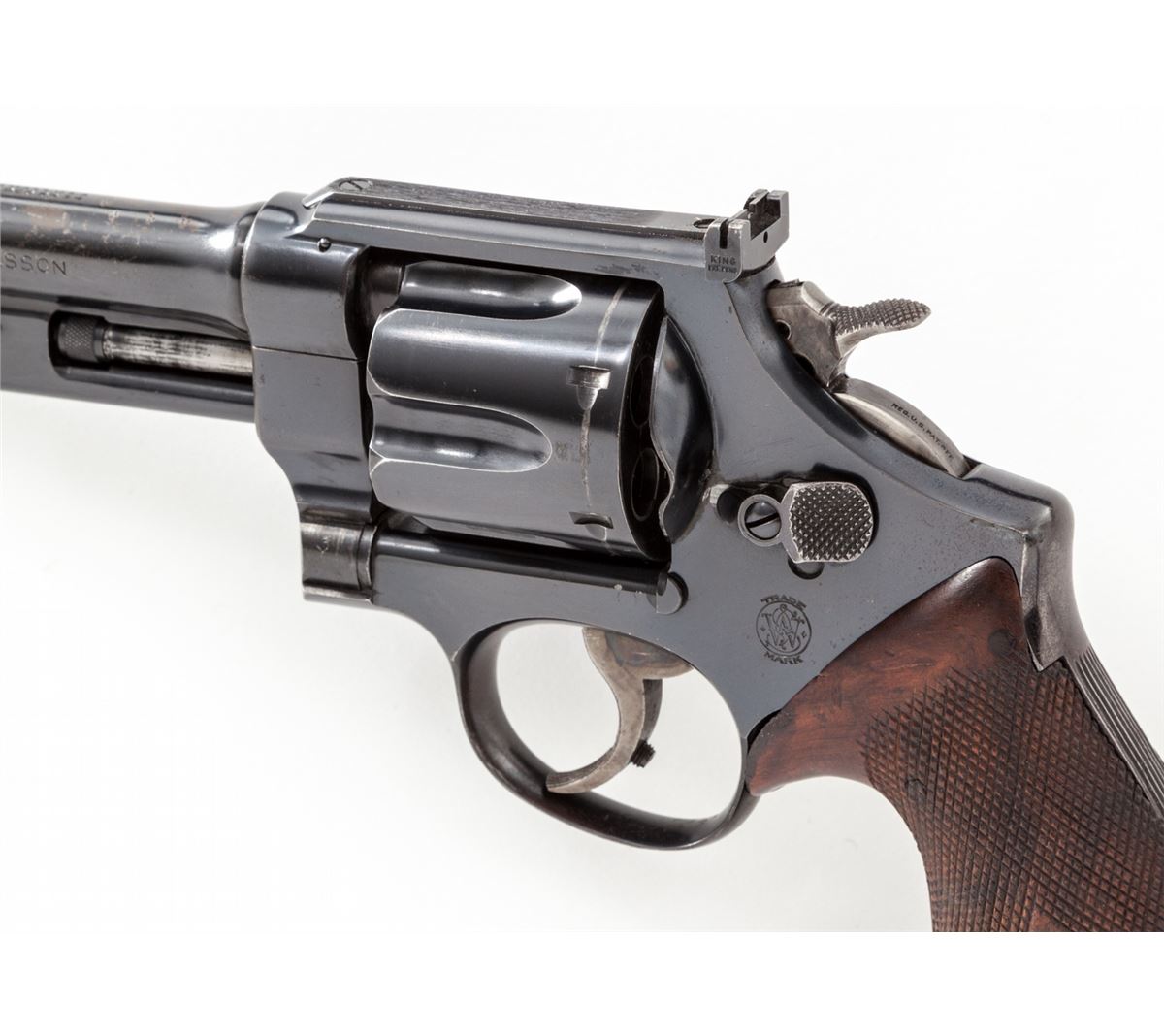 King's Modified Smith & Wesson Model 38/44 Double Action Revolver, #40973, .38 Spec. cal., 6-1/2'' barrel, blue finish, with later checkered large diamond walnut grips, King's cockeyed hammer, King's adjustable rear sight, with undercut Patridge front sight originally with reflective mirror. Revolver has been King's converted to Single Action Target mode only and is probably a tackdriver at the range. Condition is about fine. Frame and cylinder retain approx. 94% inky original blue finish. Barrel retains approx. 75%-80% blue with speckling and flaking to upper surfaces. Grips are mostly crisp with some mild flattening. Very crisp trigger, good action, bright bore. Reflective mirror to front sight has gone missing. Est.: $600-$800. (C&R)