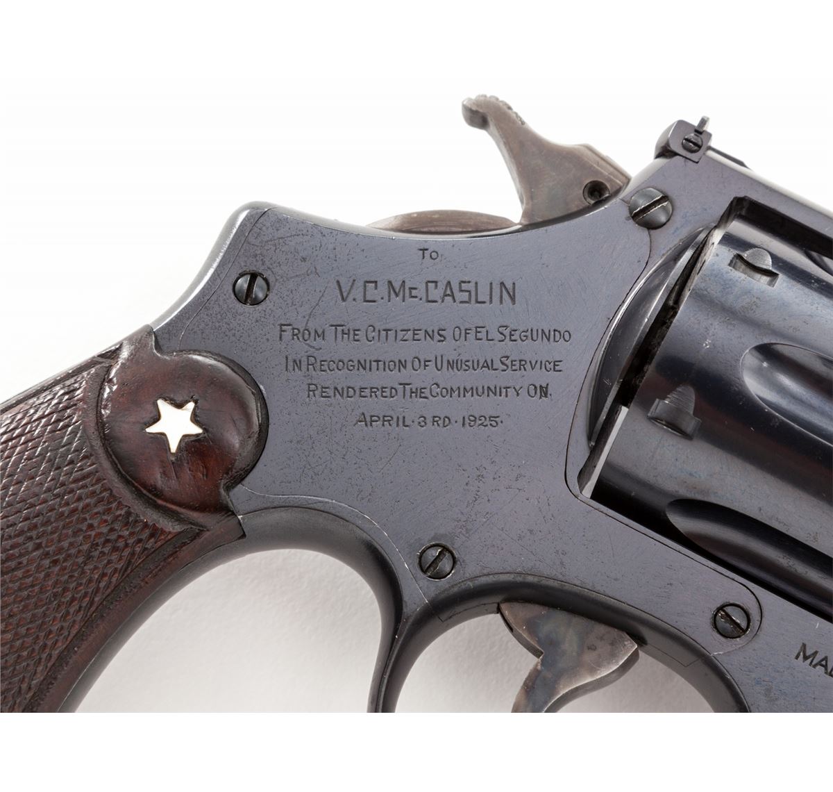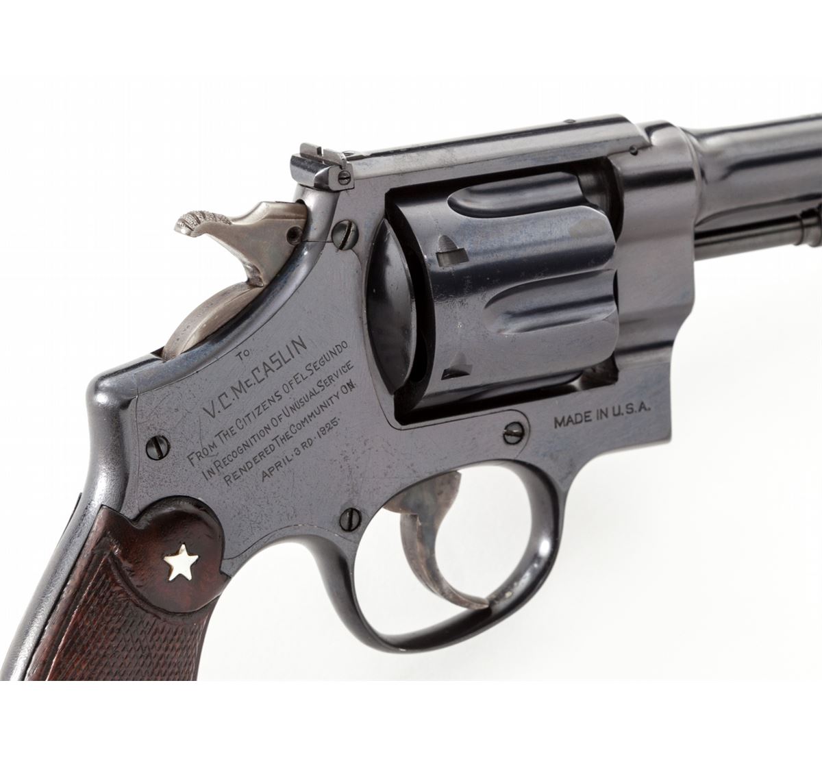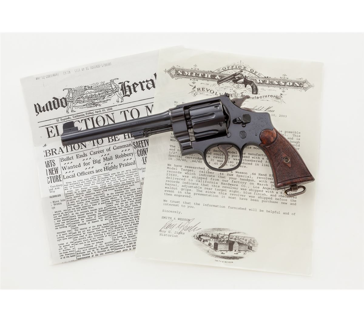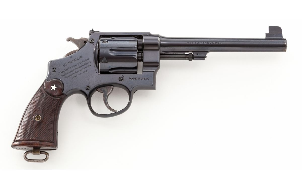 Presentation Smith & Wesson .44 Target Double Action Revolver, #23680, .44 Spec. cal., 6-1/2'' barrel, blue finish, factory checkered diamond walnut grips, with lanyard loop in butt. Sideplate marked ''To V.C. McCaslin from the Citizens of El Segundo in recognition of unusual service rendered the community on April 3, 1925''. The inscription refers to an incident in which Officer McCaslin ended the career of bank and mail robber Bernard Kassel and his accomplice. Included is a copy of the newspaper ''The El Segundo Herald'', dated April 10, 1925, along with a copy of the City minutes of their meeting where they discussed the attempted robbery, and factory letter. This revolver was originally shipped March 26, 1925, and delivered to Calif. Hardware Co., Los Angeles, CA. Since this revolver was shipped before the event in the presentation, it was definitely purchased new and then later engraved. Condition is excellent as refinished, with very light frosting beneath the blue. Presentation inscription is clear with neatly added mother of pearl five-pointed star to top of right grip. Grips with moderate flattening to checks. Action is crisp, bore is very good. Est.: $2,500-$3,500. (C&R/PPT)