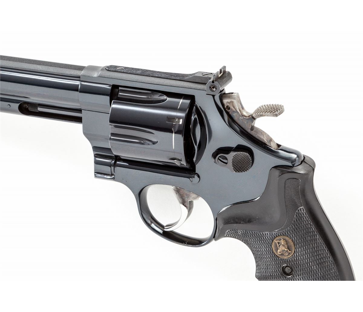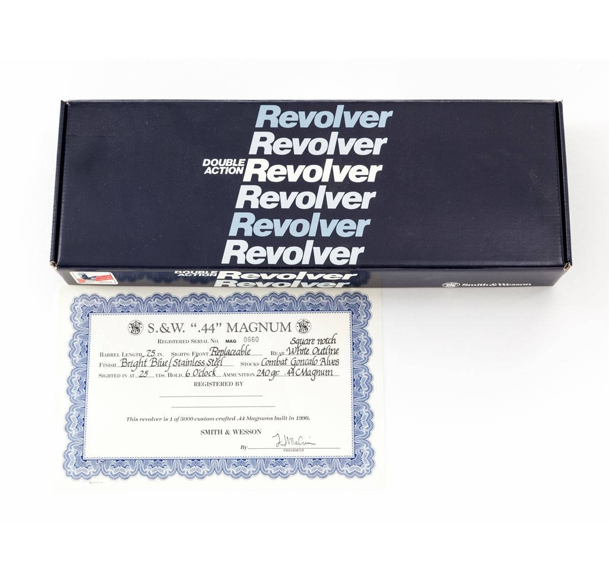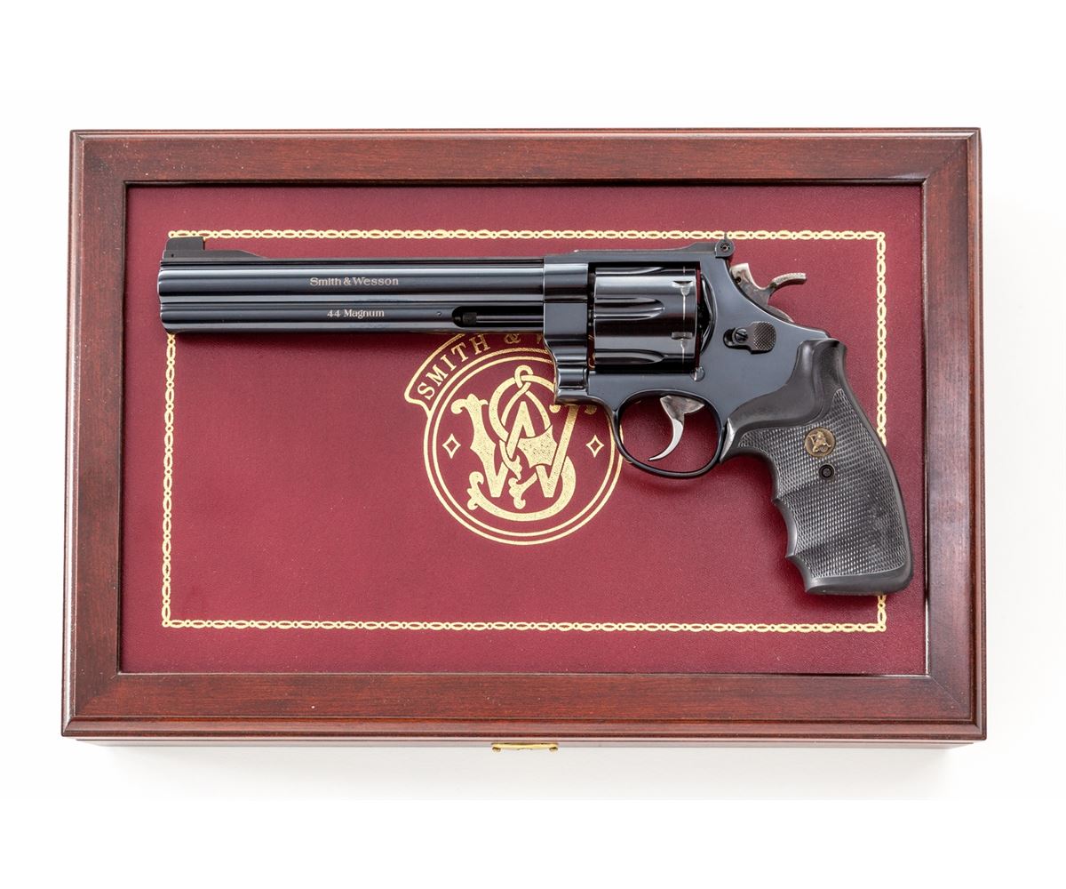 Smith & Wesson Model 29 Magna Classic 1 of 3000 (29-5) Double Action Revolver, #MAG0660, .44 mag. cal., 7-1/2'' barrel, blue finish, Pachmayr gripper grips, with seven-blade interchangeable front sight system, and white outline rear sight. In original box and glass-topped presentation display case. Condition is excellent showing index line to cylinder and very light range use. Est.: $800-$1,200. (Modern/PPT)