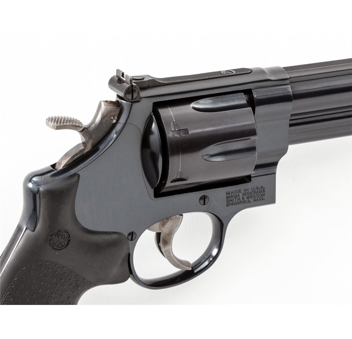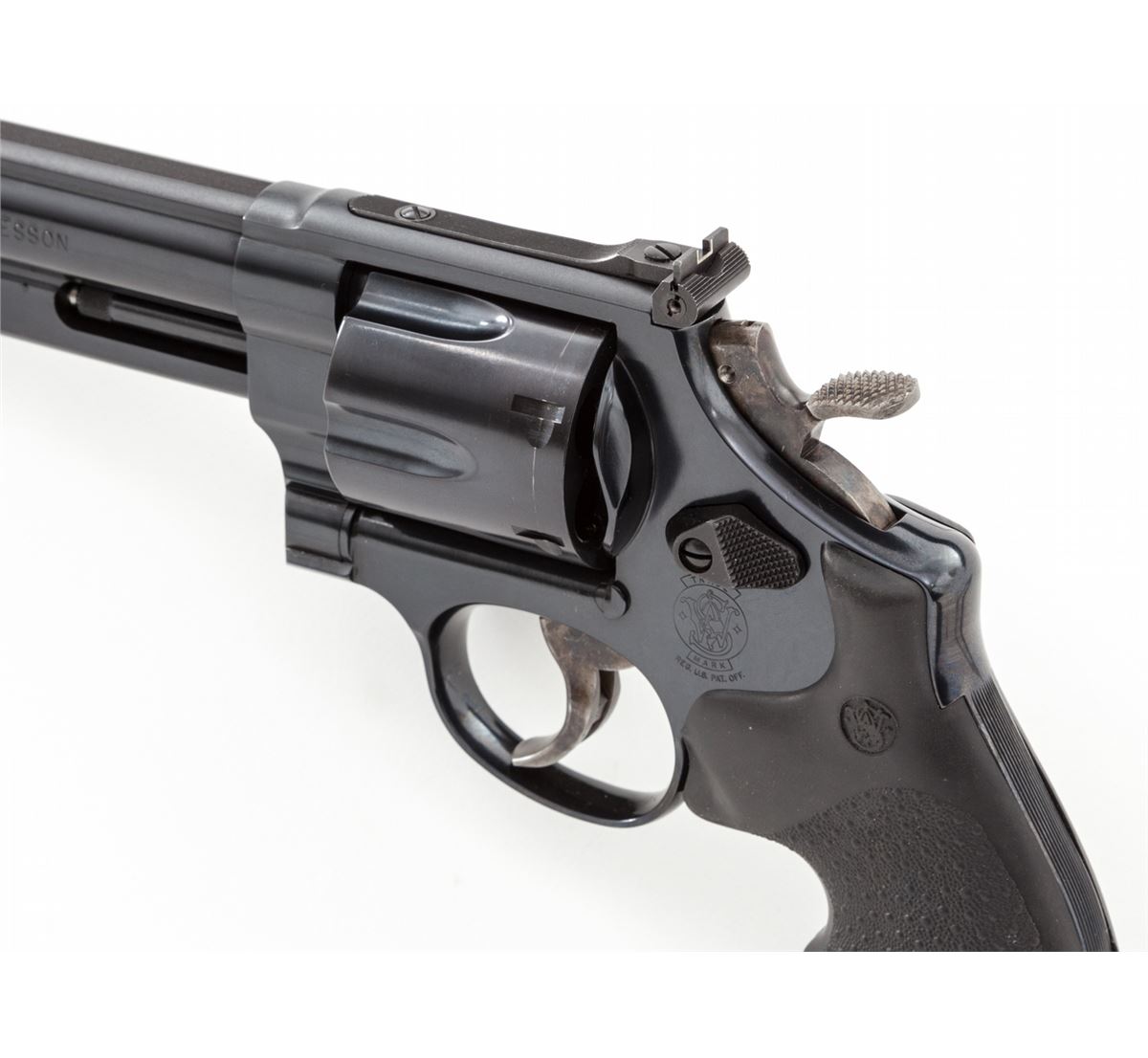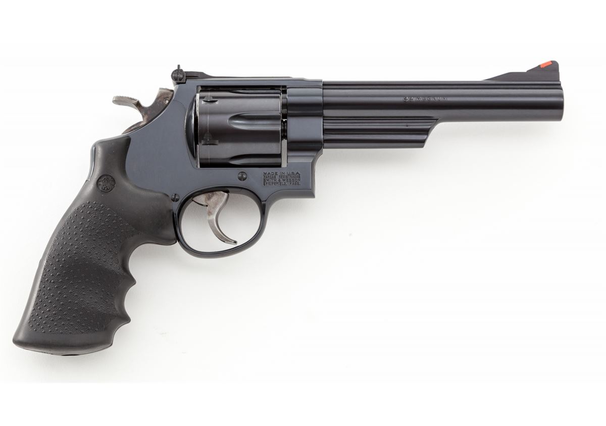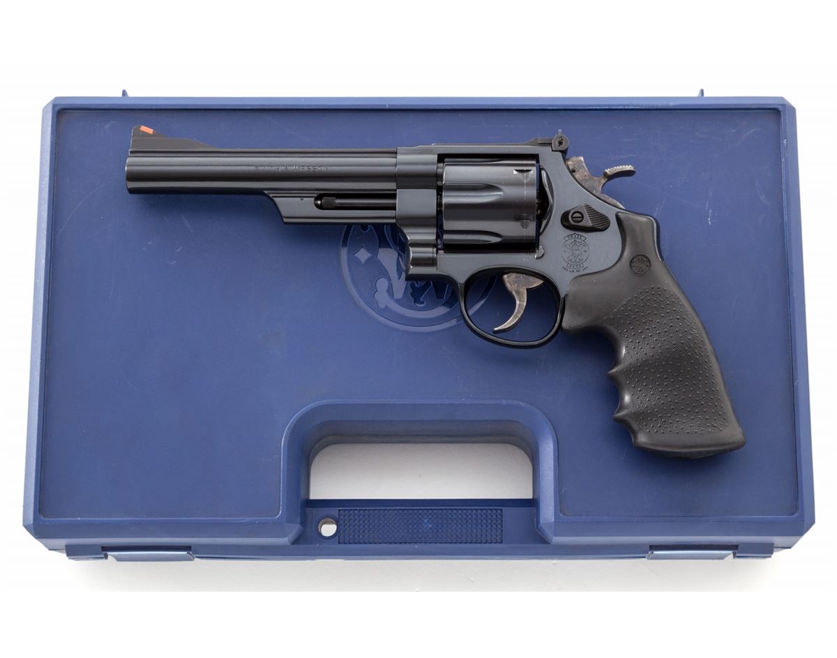 Smith & Wesson Model 219-6 Double Action Revolver, #CCP1843, .44 mag. cal., 6'' barrel, blue finish, S&W/Hogue rubber grips, red ramp front sight, white outline rear sight, target hammer and smooth trigger. Condition is as new in original box, with only light index line to cylinder. Est.: $500-$750. (Modern) (Not available to Calif. residents.)