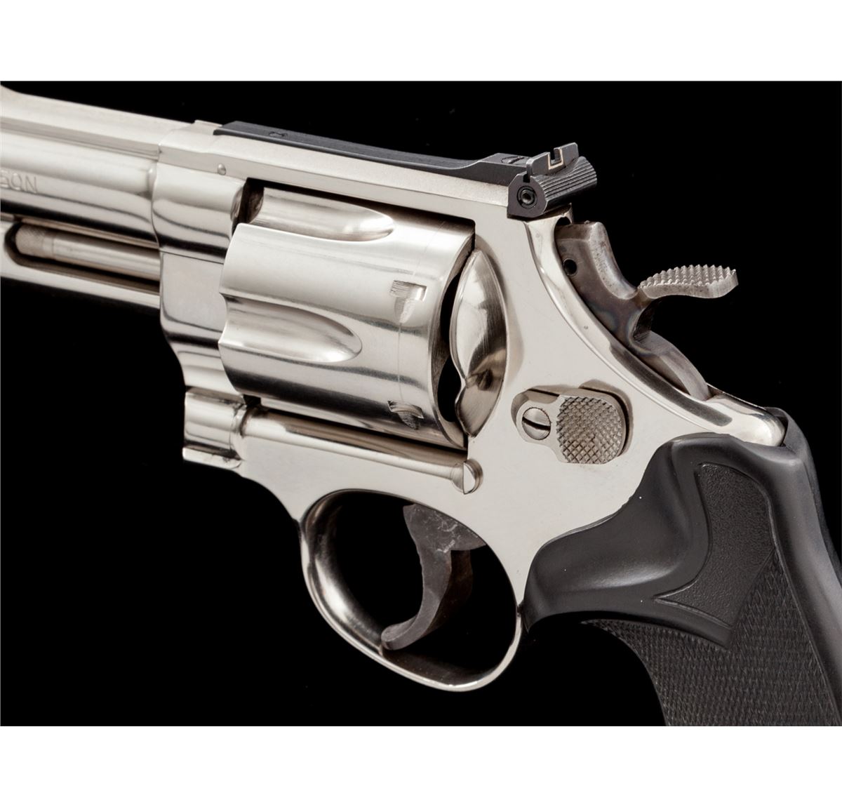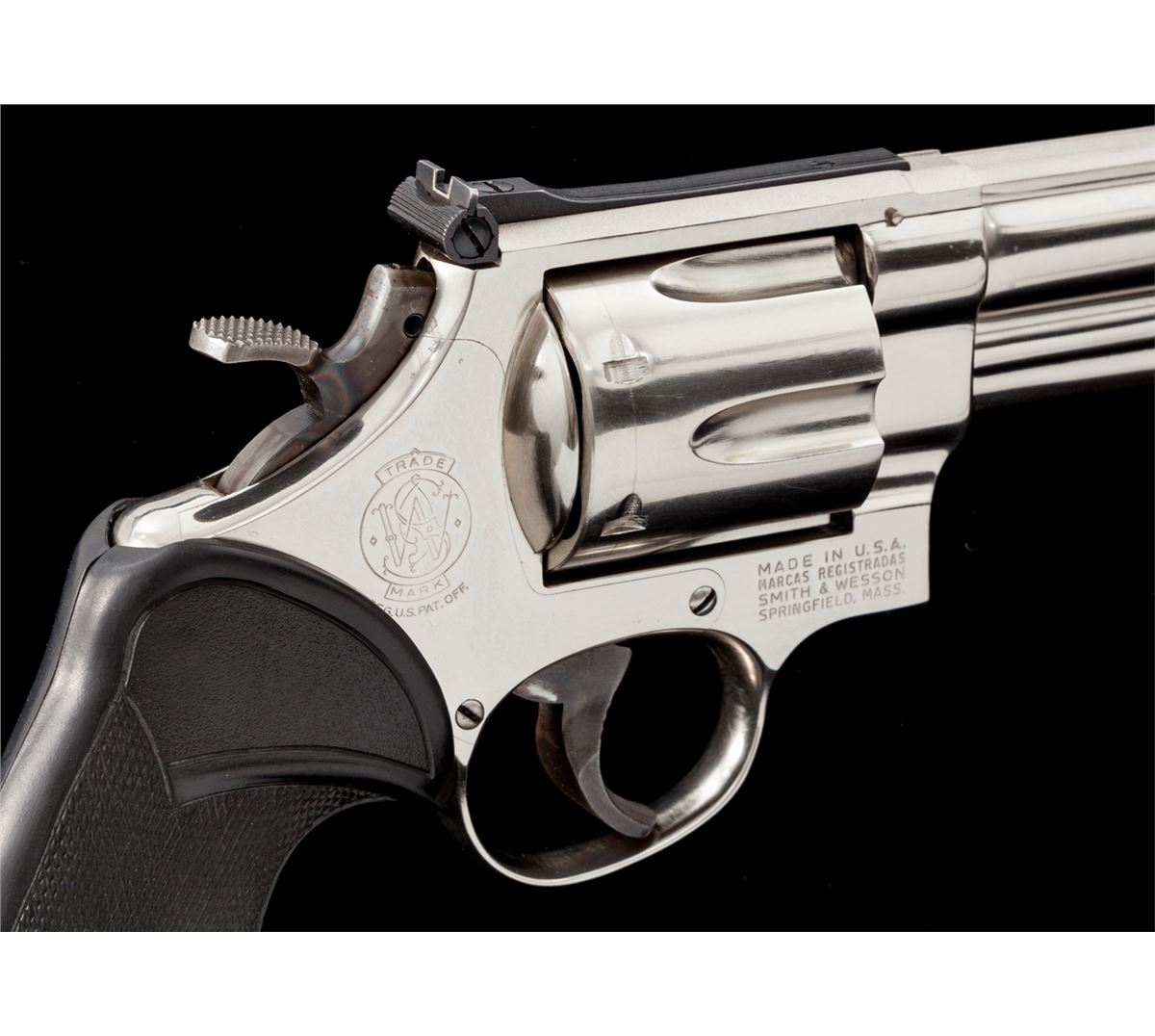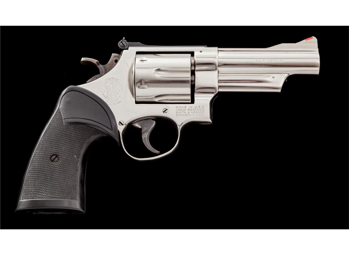 Smith & Wesson Model 29-2 Double Action Revolver, #N627104, .44 mag. cal., 4'' barrel, nickel finish, Pachmayr rubber grips, with target trigger, target hammer, red ramp front and white outline rear sights. Condition is excellent showing little use, with light index mark to cylinder. Pre-1981 pinned barrel. Est.: $600-$800. (Modern) (Not available to Calif. residents.)