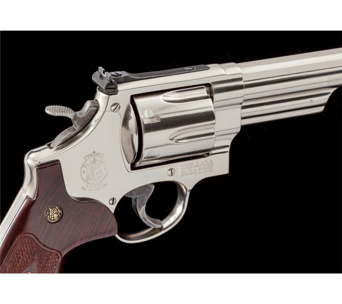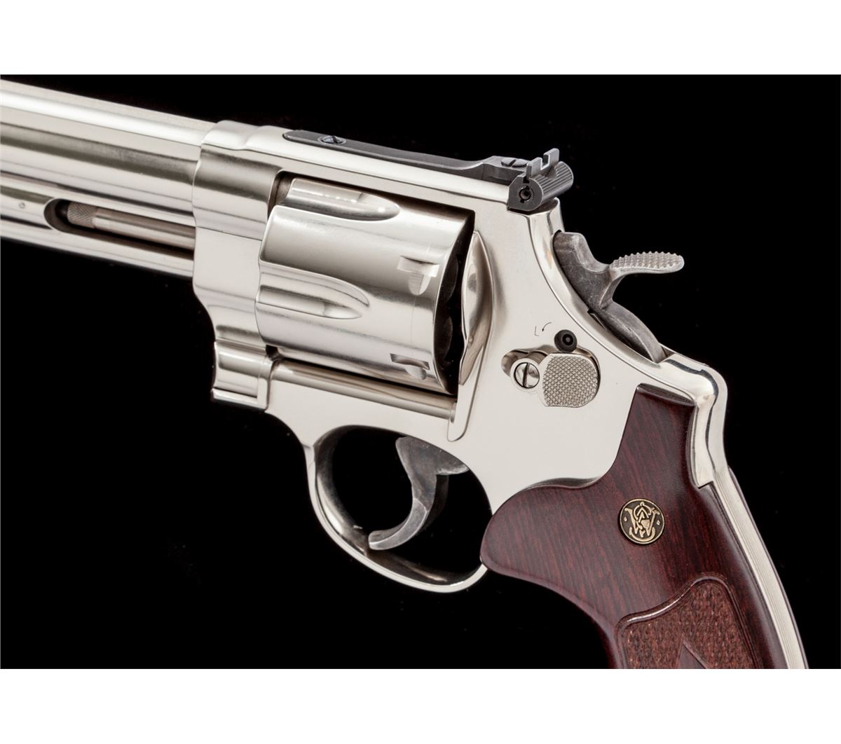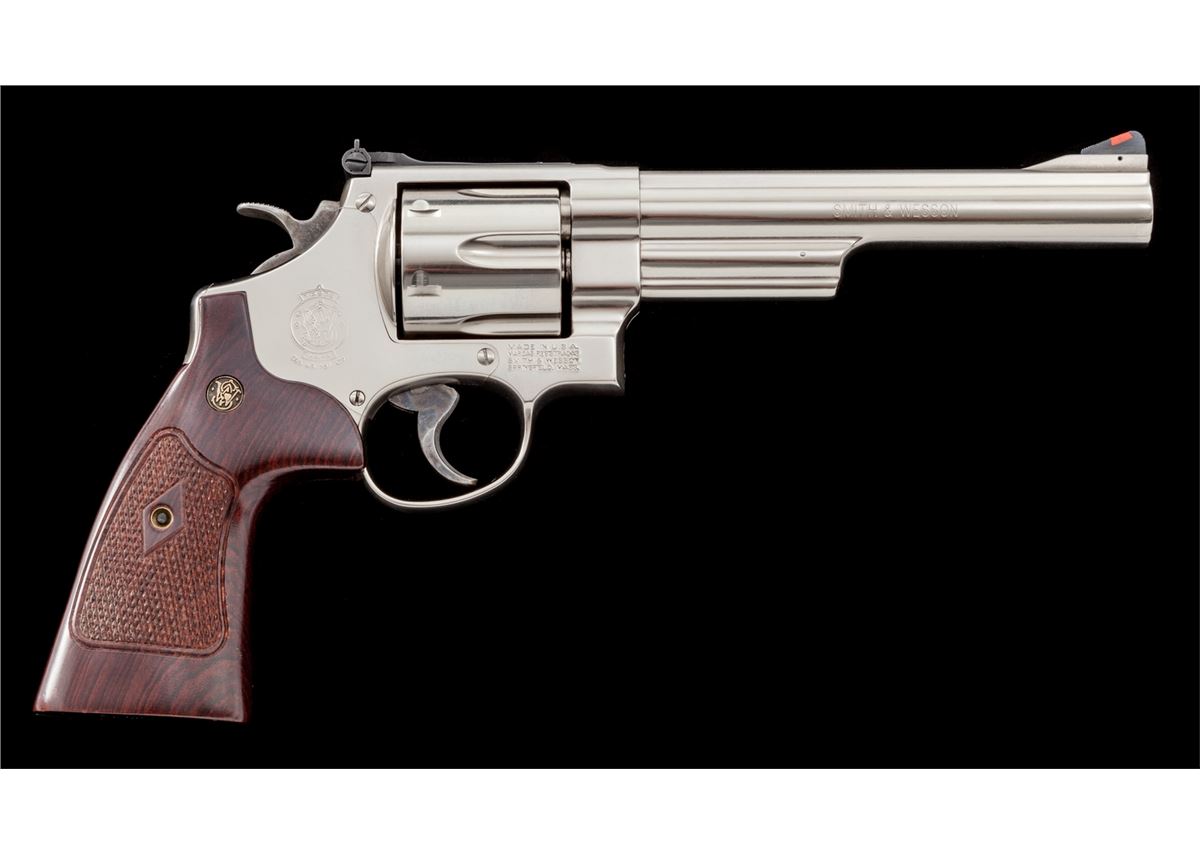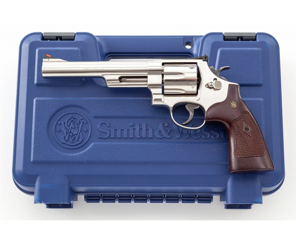 Smith & Wesson Model 29-10 Double Action Revolver, #DBA6859, .44 mag. cal., 6-1/2'' barrel, nickel finish, factory checkered hardwood grips, with red ramp front sight and white outline rear sight. Condition is excellent, appearing near new, in original hard case with instructions. Est.: $500-$750. (Modern/PPT)