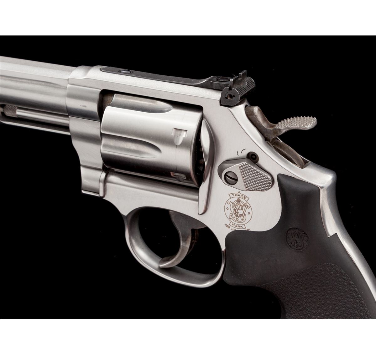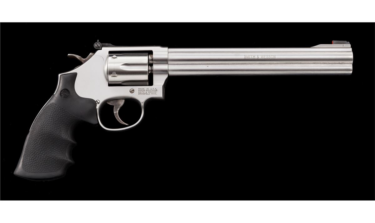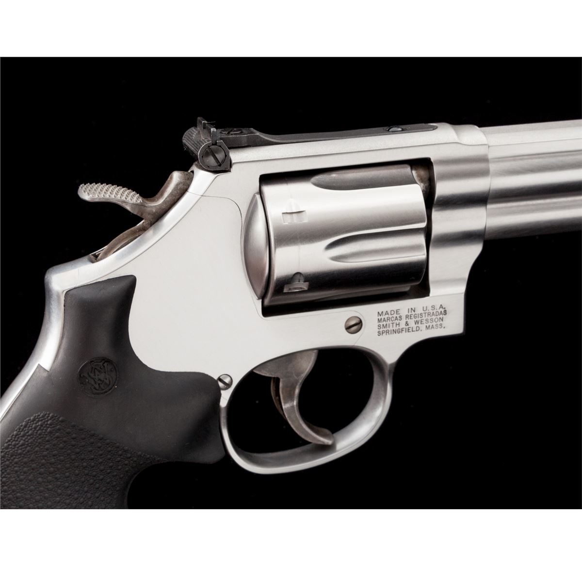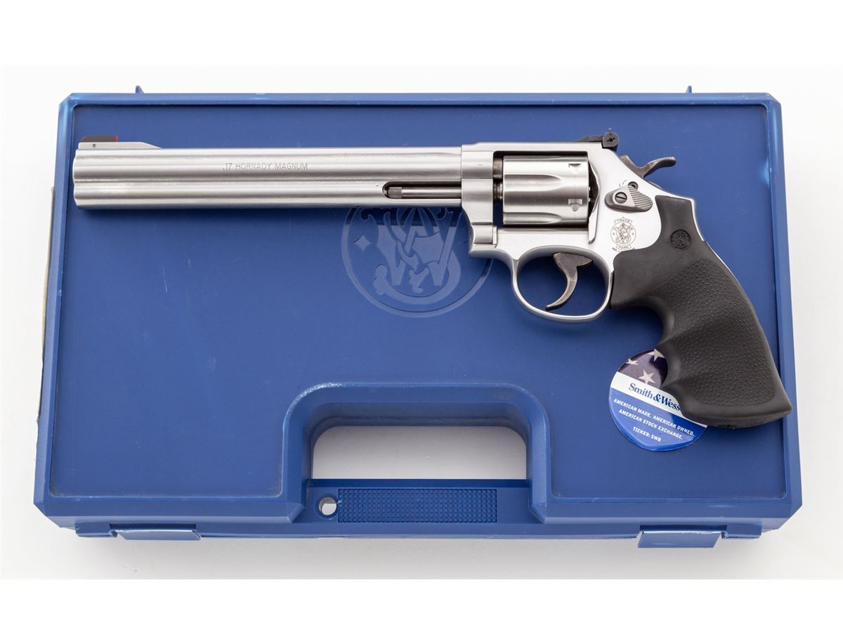 Smith & Wesson Model 647 Double Action Revolver, #CFZ8956, .17 HMR cal., 8-3/8'' barrel, stainless steel, S&W marked Hogue style grips, with standard adjustable sights. Condition is excellent, appearing as new, in original box. Est.: $500-$750. (Modern/PPT)