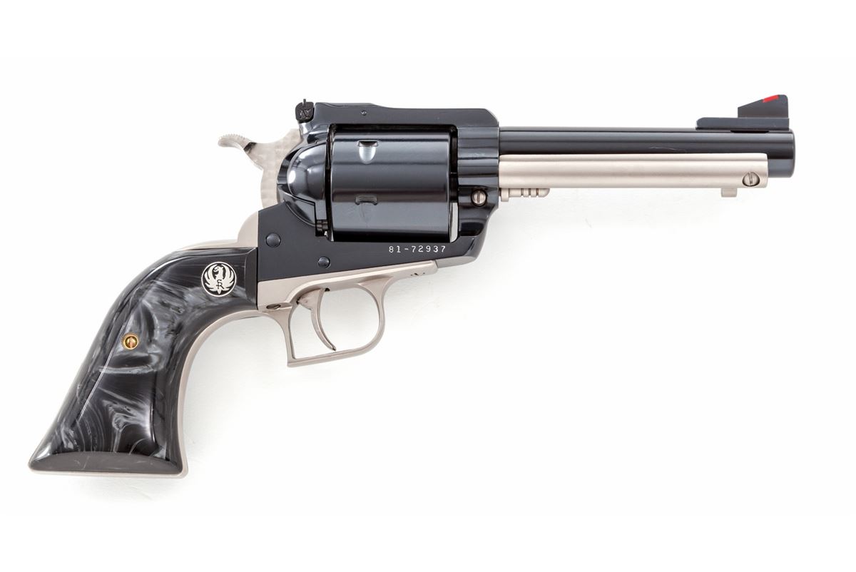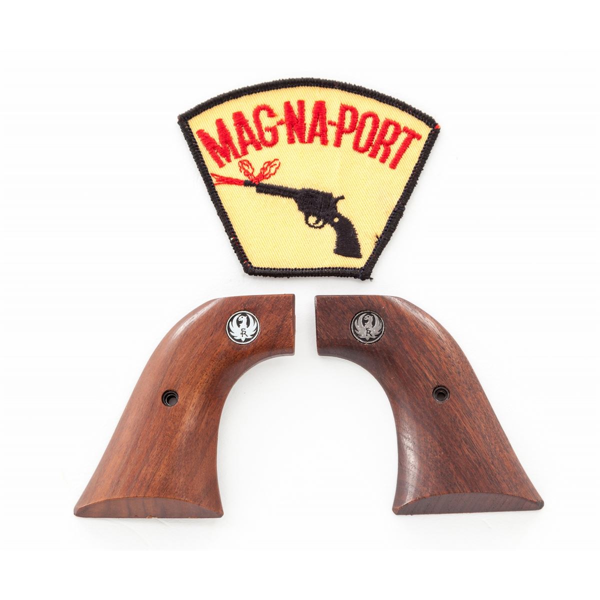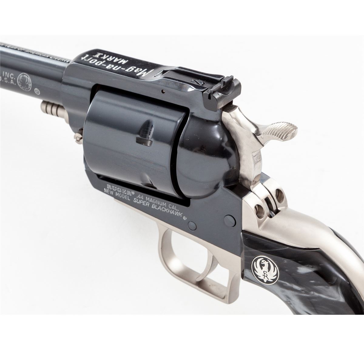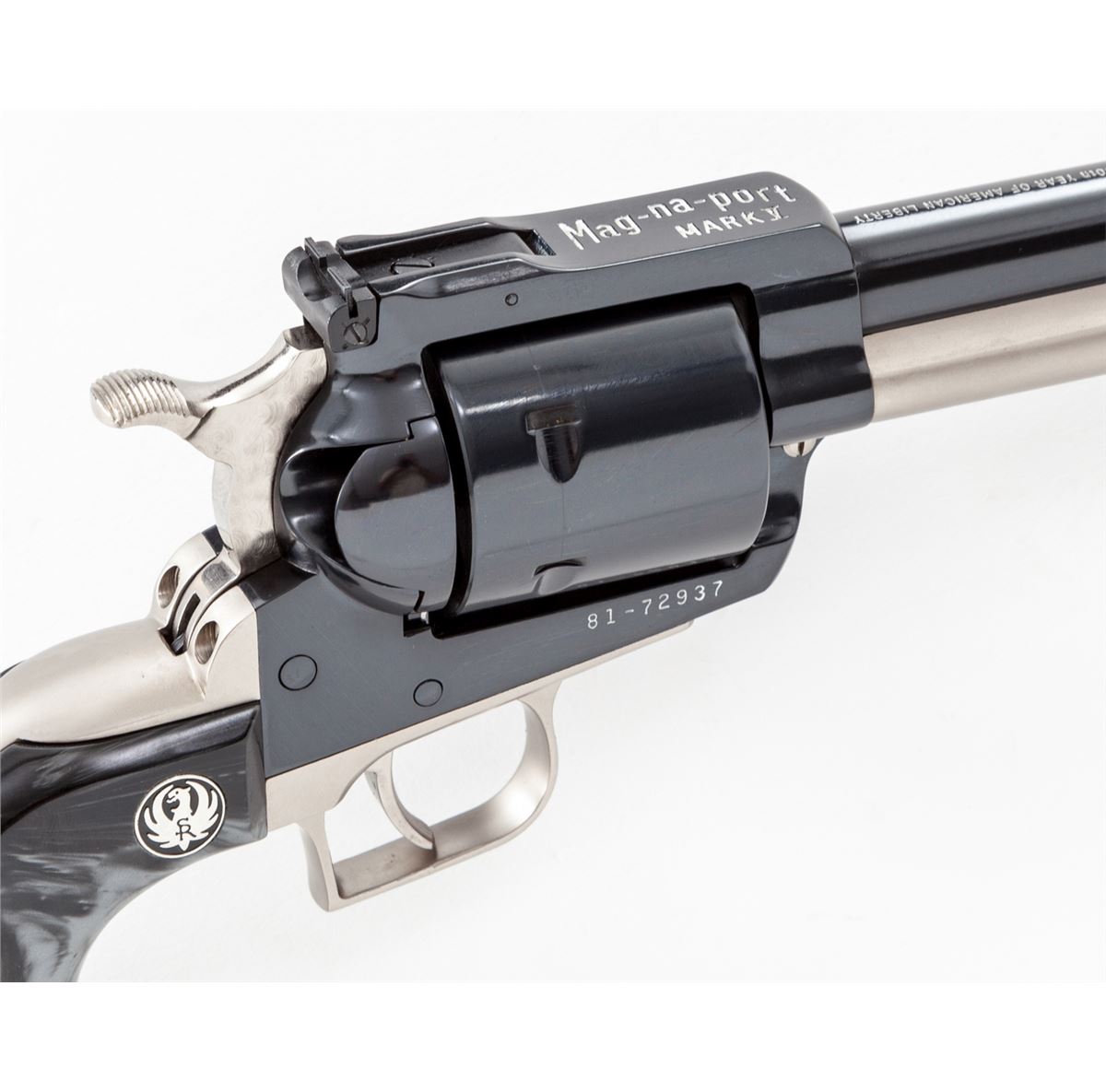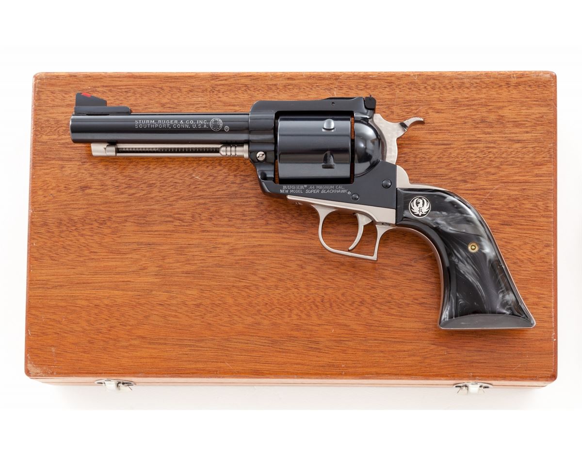 Ruger Super Blackhawk Mag-Na-Port MK V Limited Edition Single Action Revolver, #81-72937, .44 mag. cal., 5'' magna-ported barrel; satin nickel backstrap, triggerguard and ejector rod housing; non-fluted cylinder, machine-turned and factory tuned hammer and trigger, factory adjustable rear sight, red ramp front sight, with Ruger smoky gray pearlite grips, as well as original walnut grips, in mahogany case with period Magna-Port patch. Mfg'd in 1976. Top of barrel marked ''Made in the 200th Year of American Liberty''. Considered quite scarce and only sold in 1976. An article in the June 1976 Guns magazine states that only 200 were mfg'd and were only advertised by mailing flyers to dealers describing the gun. According to this article, approx. 45 of the last guns received for modification for magna-port were roll marked with the 200th Anniversary statement. A copy of this article and others are included. Condition is excellent showing only the lightest use, possibly only from handling, with a very thin index mark to cylinder. An outstanding example of a near perfect collaboration between manufacturer and custom service house. Est.: $2,500-$3,500. (C&R)