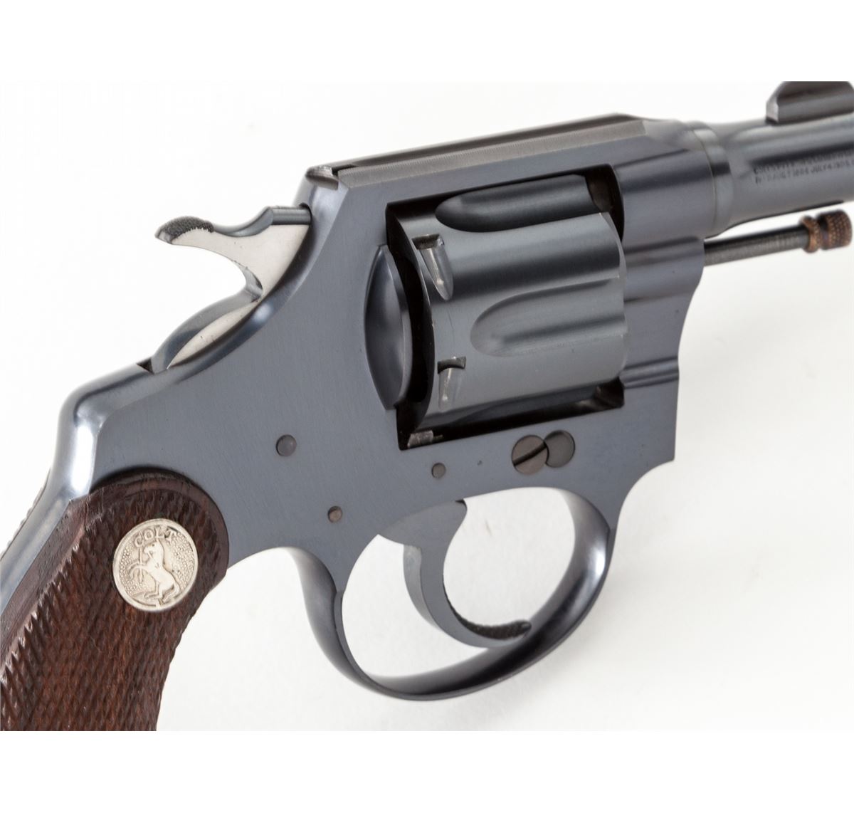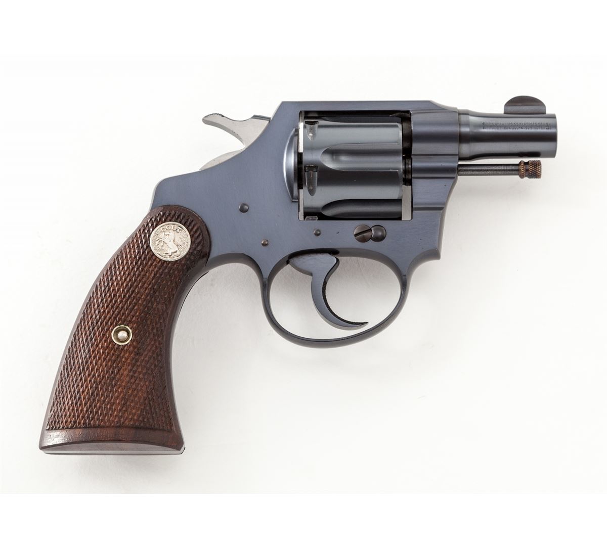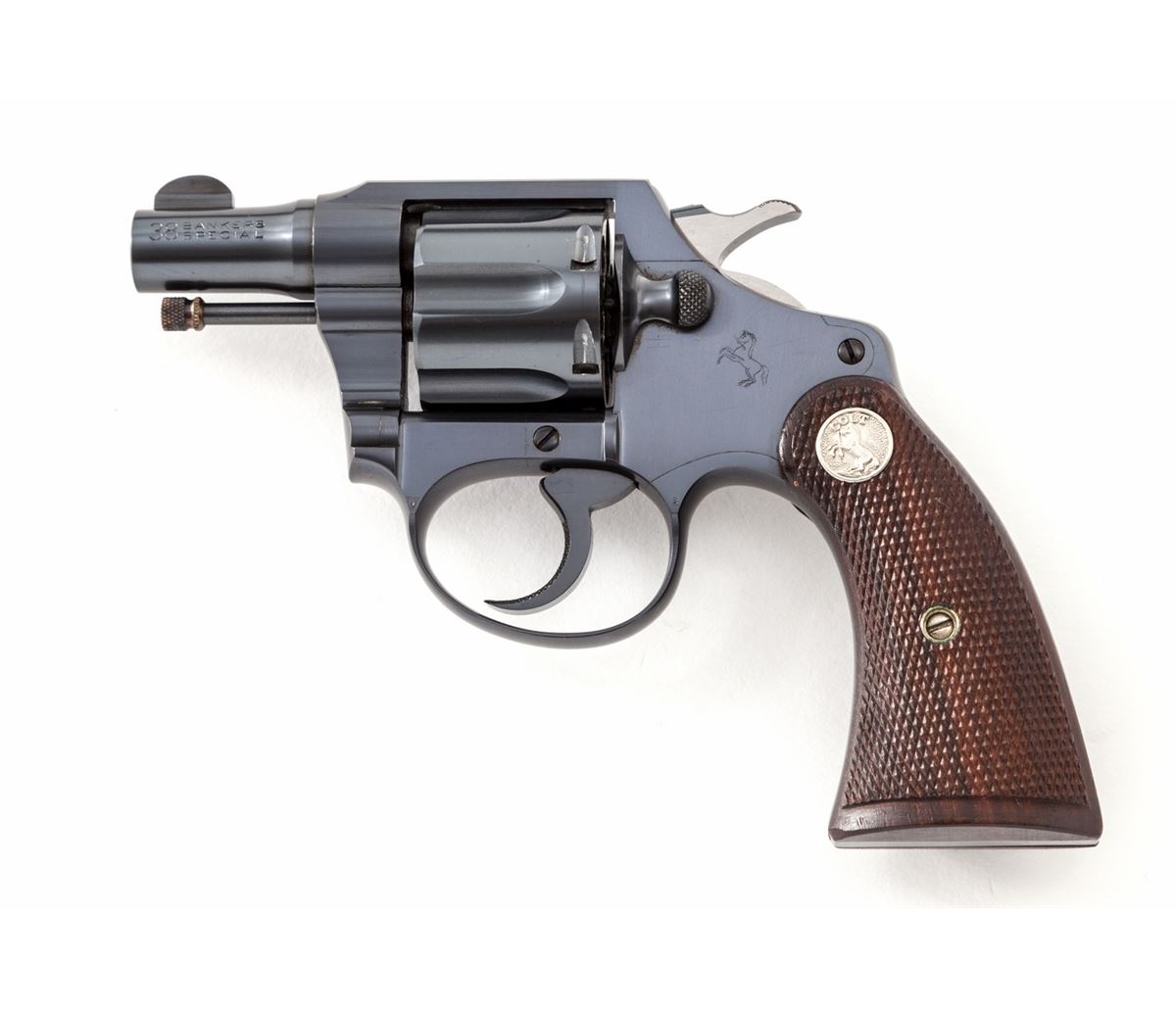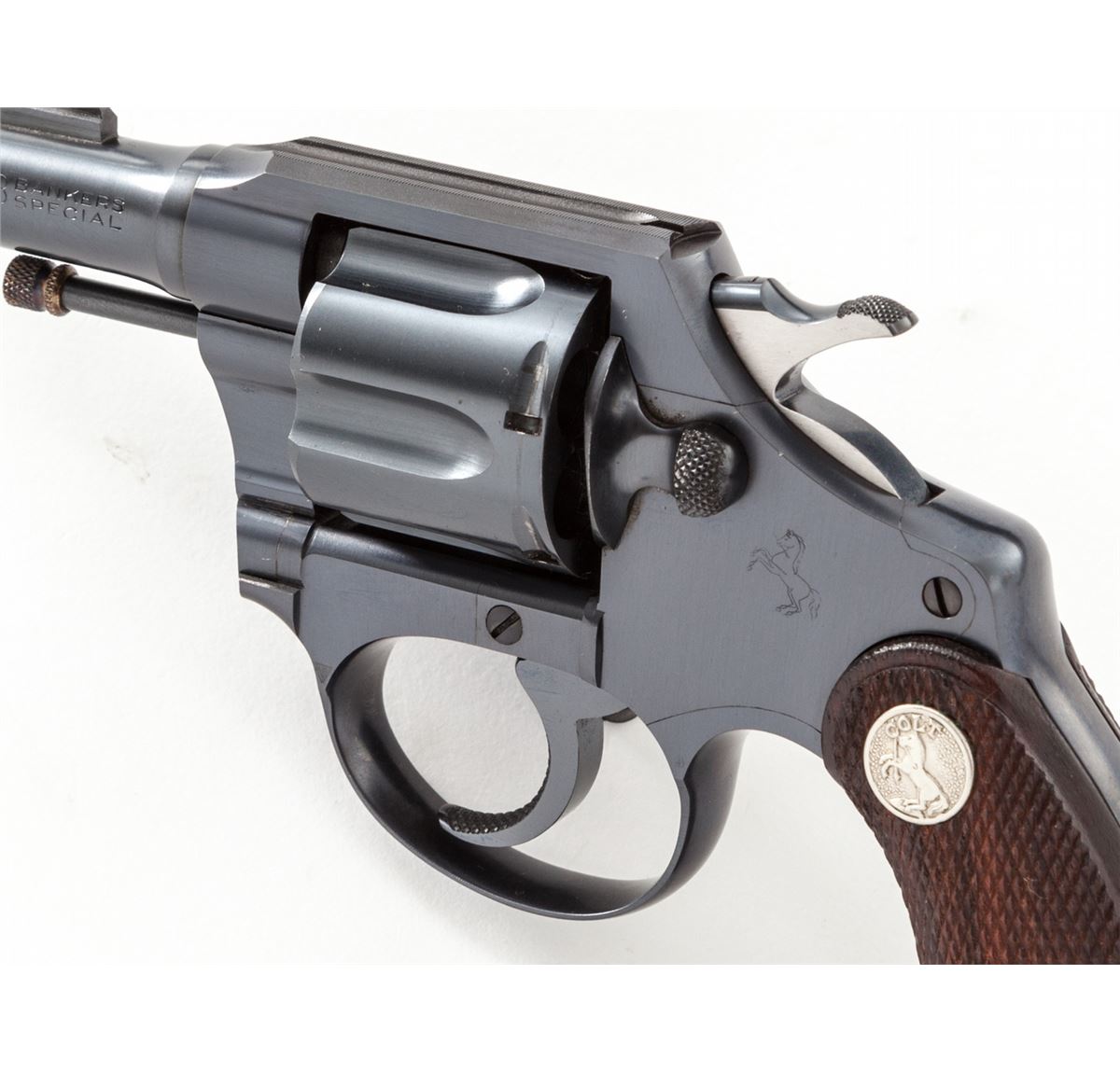 Colt Banker's Special Double Action Revolver, #361686, .38 Spec. cal., 2'' barrel, blue finish, factory checkered walnut grips with Colt medallions. Mfg'd 1933. Condition is excellent showing little use, with crisp grips and action, bright bore. Very nearly new. Est.: $600-$800. (C&R/PPT)