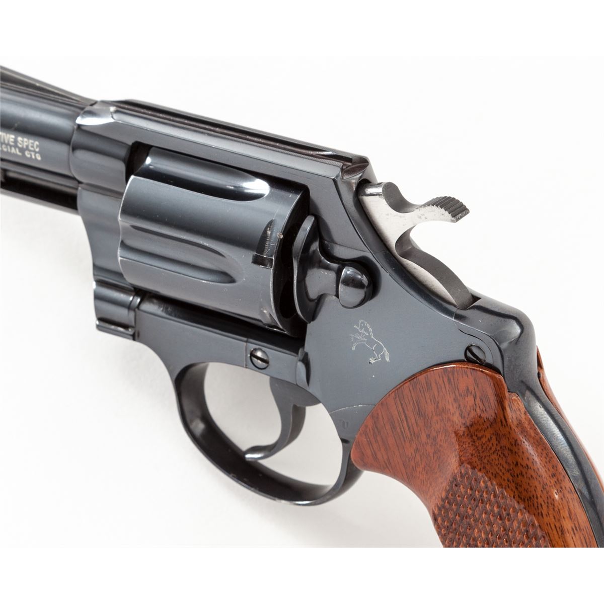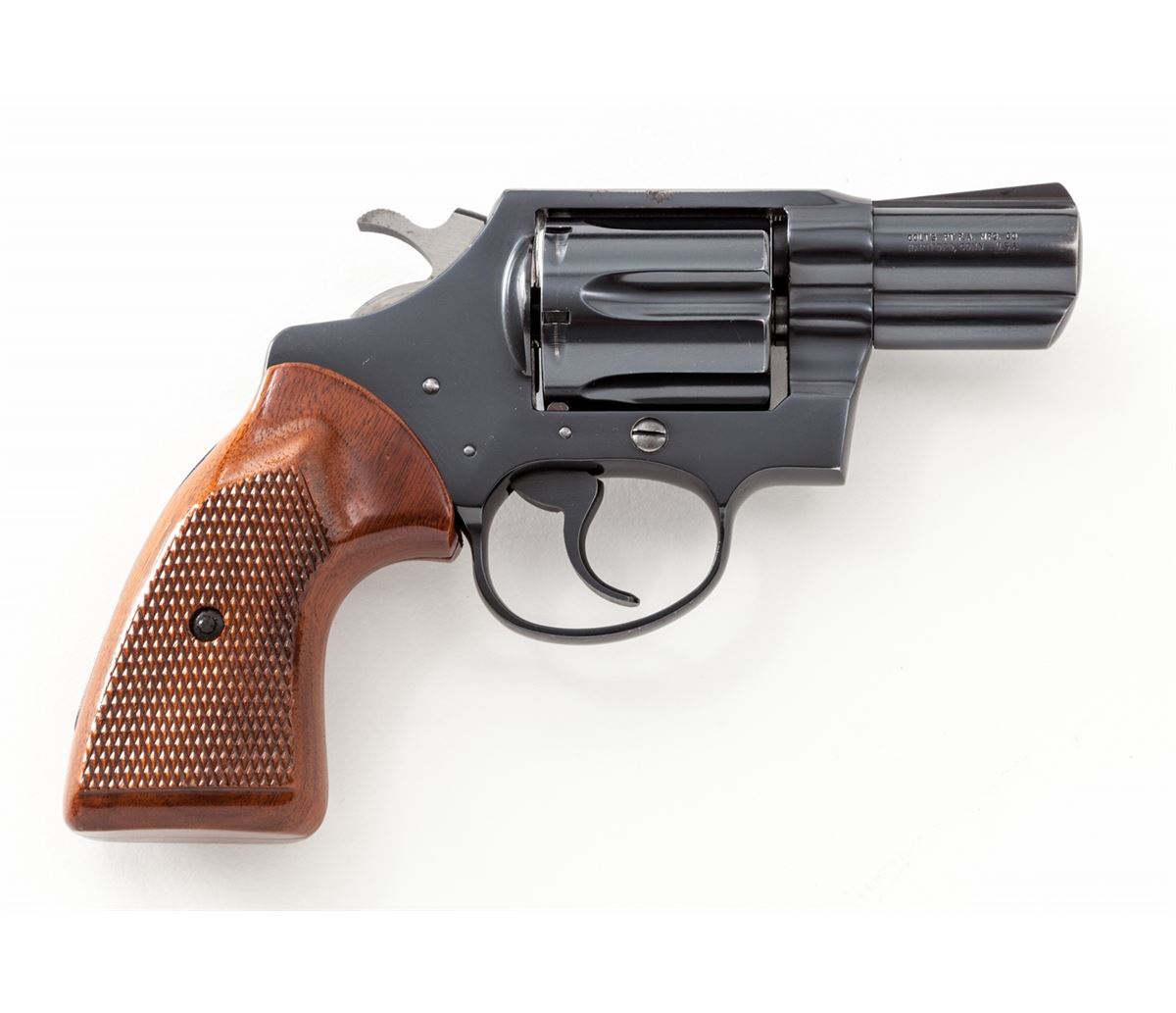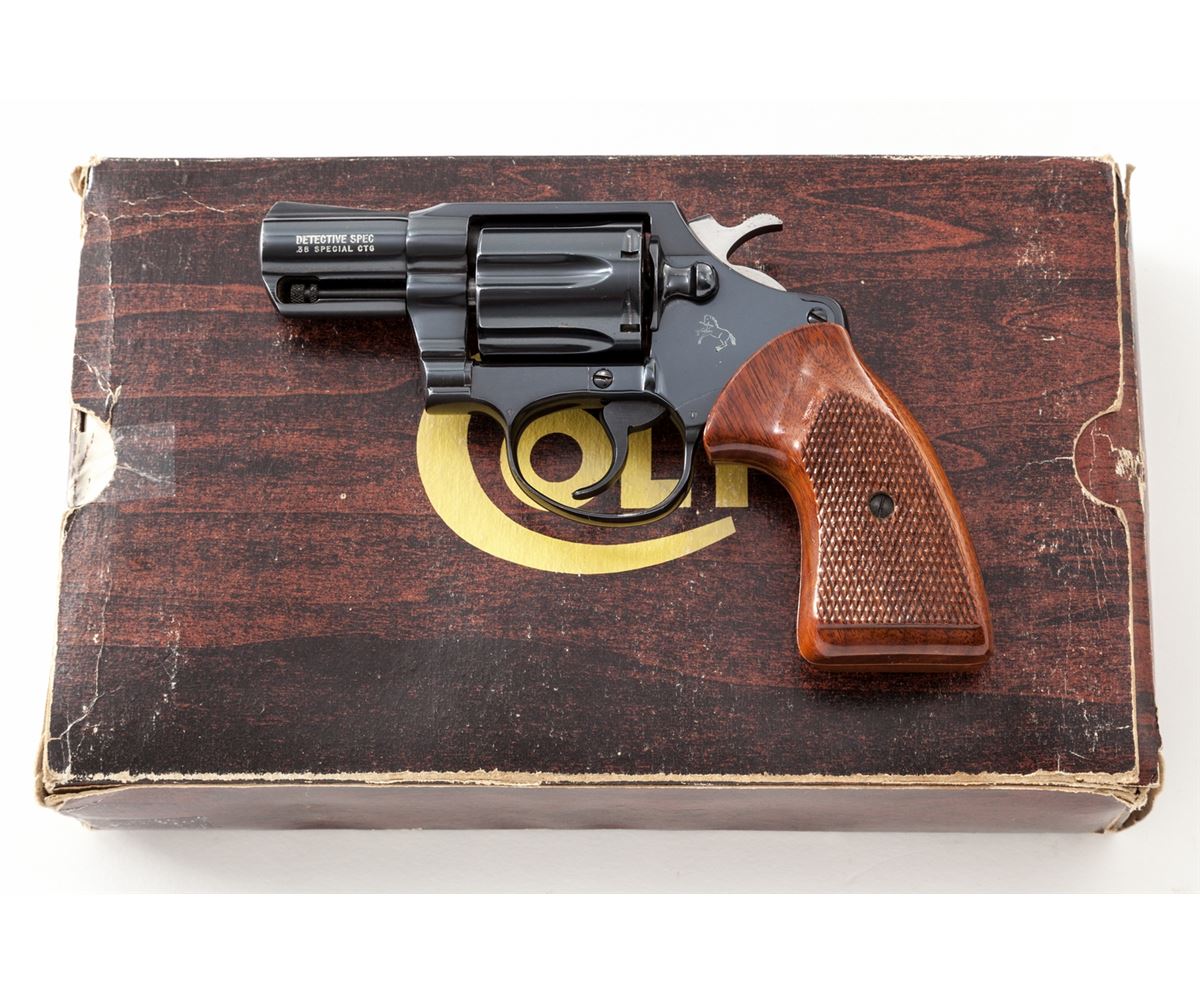 Colt Detective Special Double Action Revolver, #P24655, .38 Spec. cal., 2'' barrel, royal blue finish, with Herrett checkered walnut grips. In original Colt woodgrain box with instructions. Mfg'd 1977. Condition is excellent showing little use with very light discoloration to right side of topstrap and thinning at muzzle. Grips and action are crisp, bore is bright. Original cardboard box with some tape repairs and wear to edges. Est.: $750-$1,000. (Modern/PPT)
