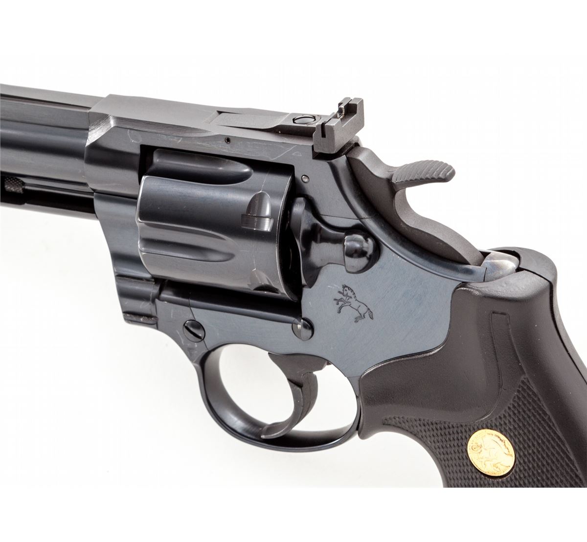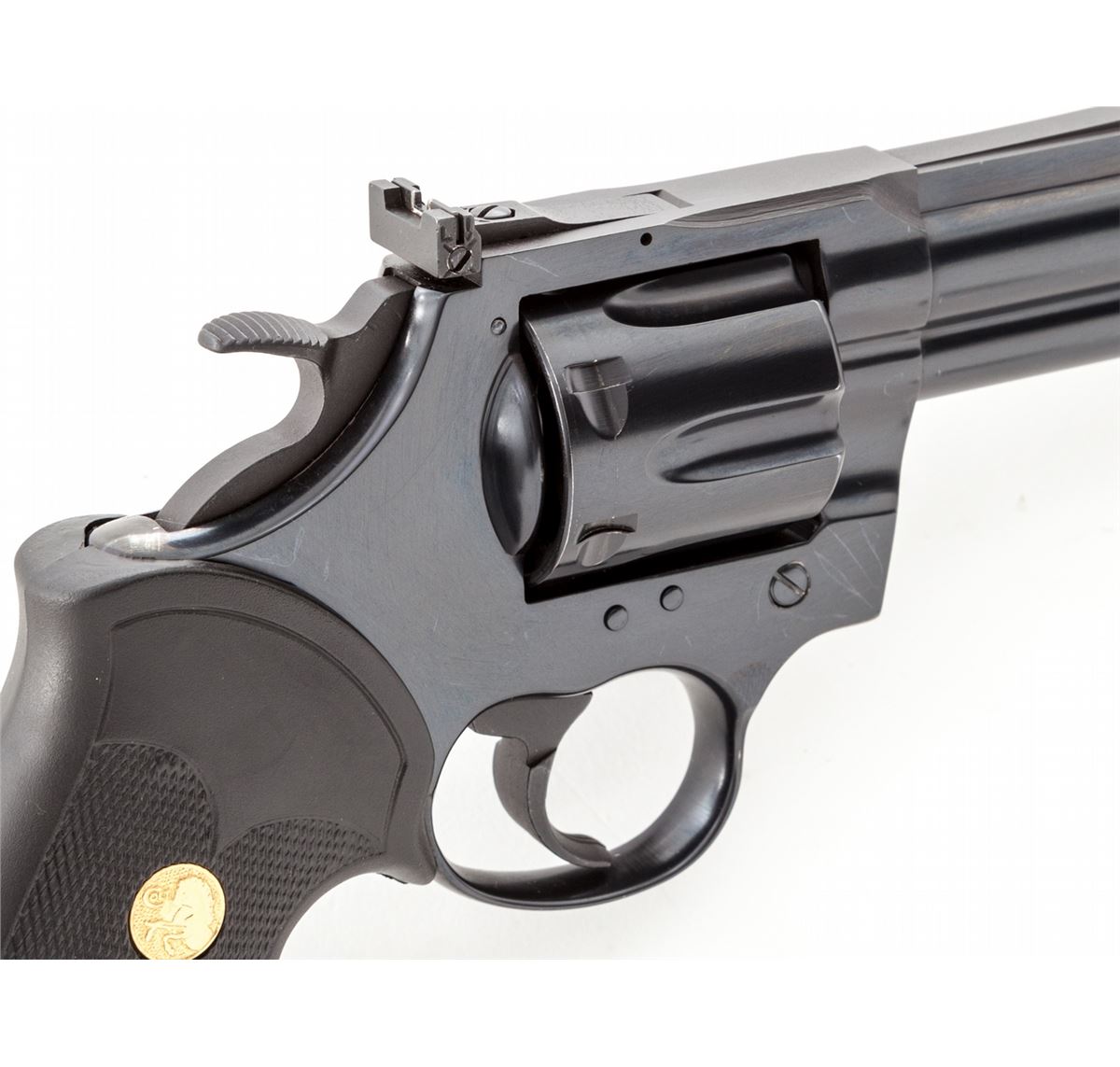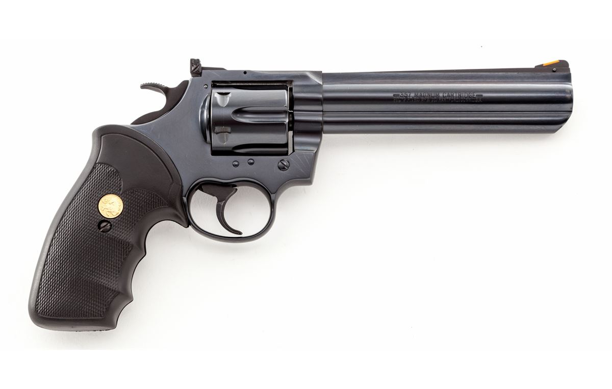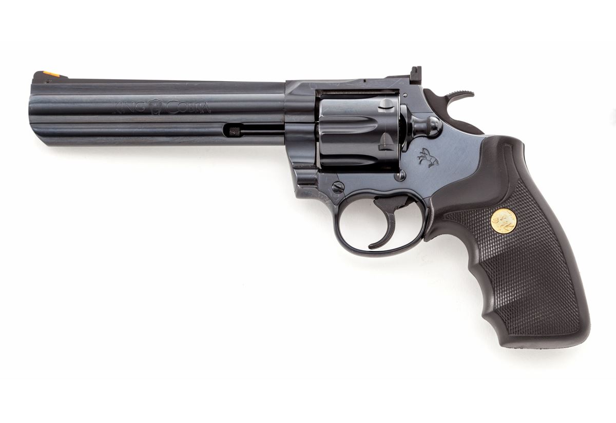 Colt King Cobra Double Action Revolver, #4KC474, .357 mag. cal., 6'' barrel, blue finish, Colt black rubber gripper grips with gold medallions, with red ramp front sight and white outline rear sight. Condition is excellent showing little use, with minor index mark to cylinder. Est.: $1,000-$1,500. (Modern) (Not available to Calif. residents.)