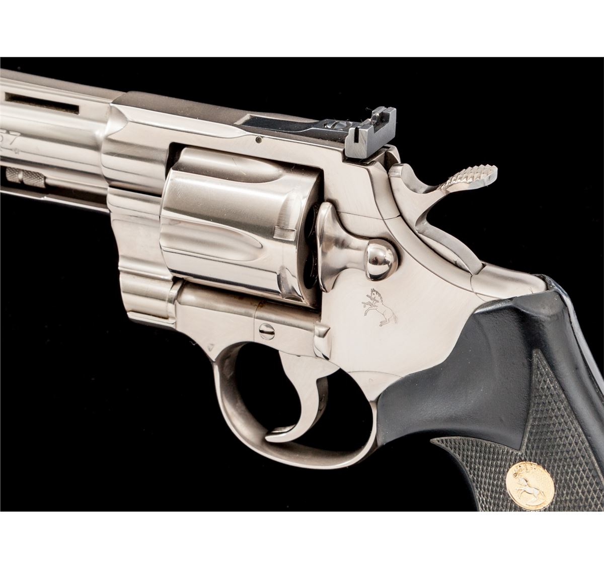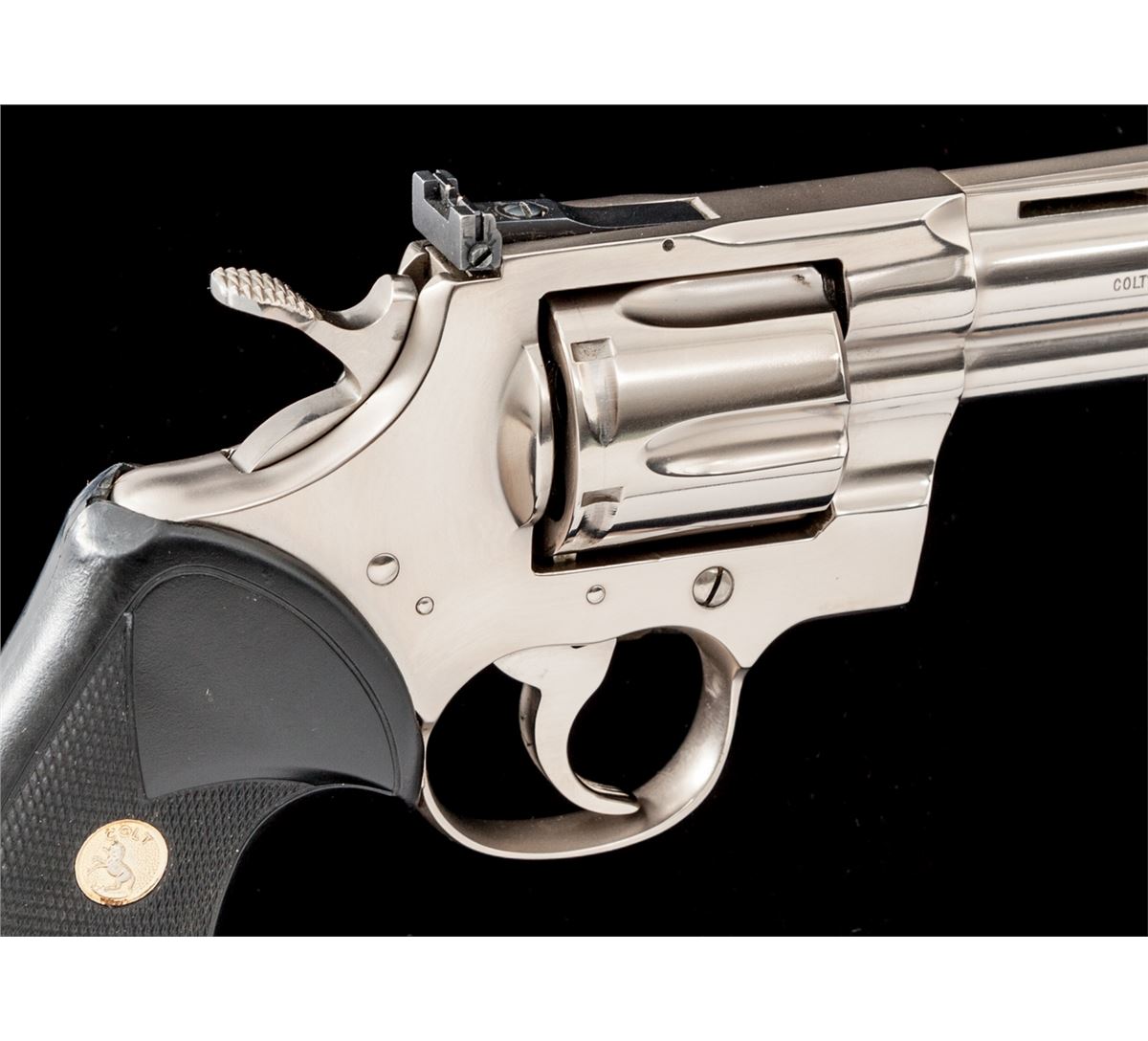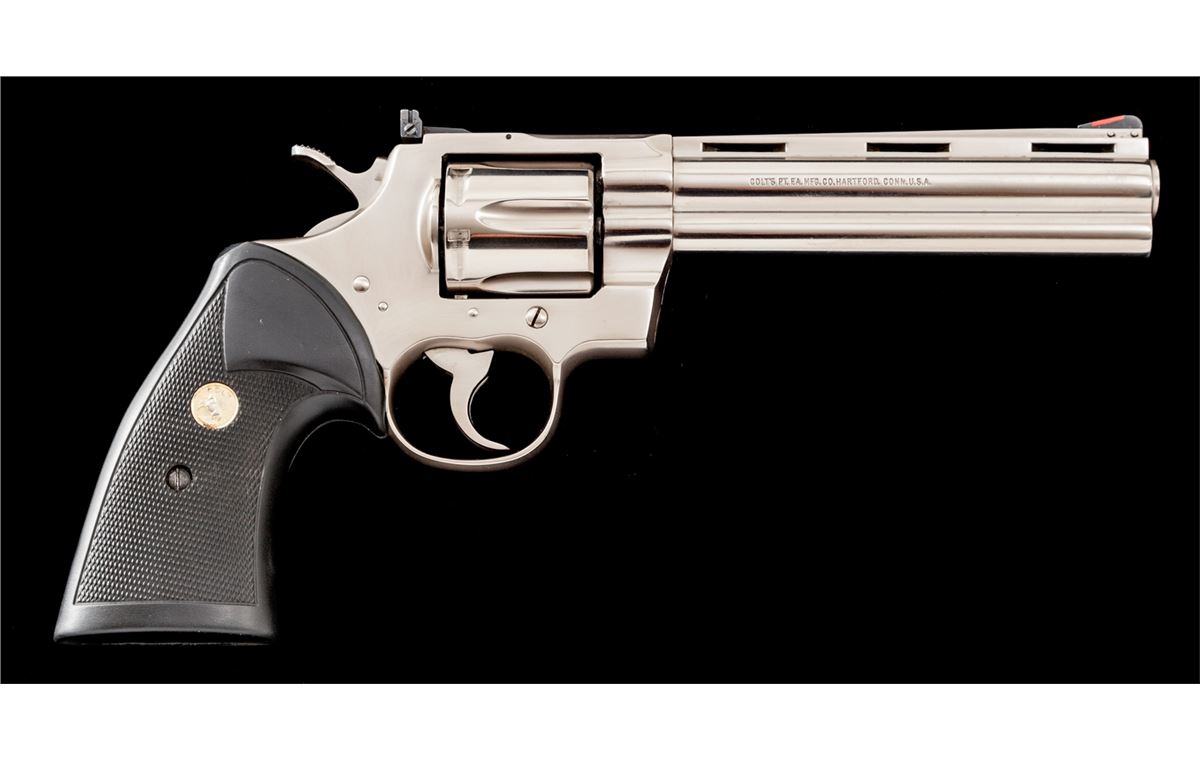 Colt Python Double Action Revolver, #K69175, .357 mag. cal., 6'' barrel, electroless nickel finish, factory black rubber grips with gold Colt medallions, in original Colt woodgrain box, lacking instructions and hang tag. Condition is excellent, appearing to have been only factory fired. Box shows light scuffs. Est.: $1,800-$2,400. (Modern/PPT)