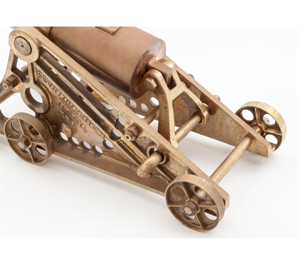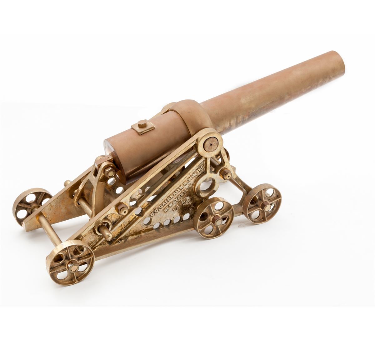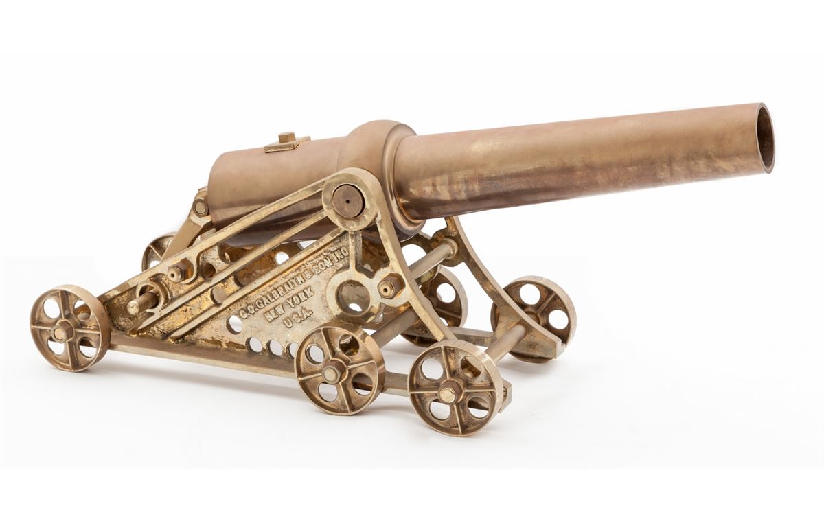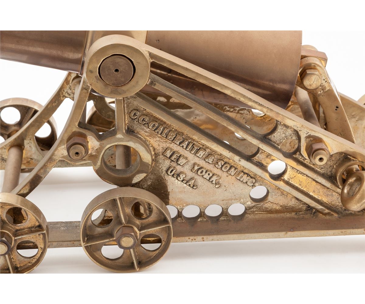 Large Brass Signal Cannon, by C.C. Galbraith & Son, New York, 2-3/4'' bore, 29'' barrel, 42'' overall, on cast bronze carriage with six wheels. Elevation is adjusted by moving a brass pin into different holes in carriage. Condition is fine with even overall light patination. Est.: $800-$1,200.