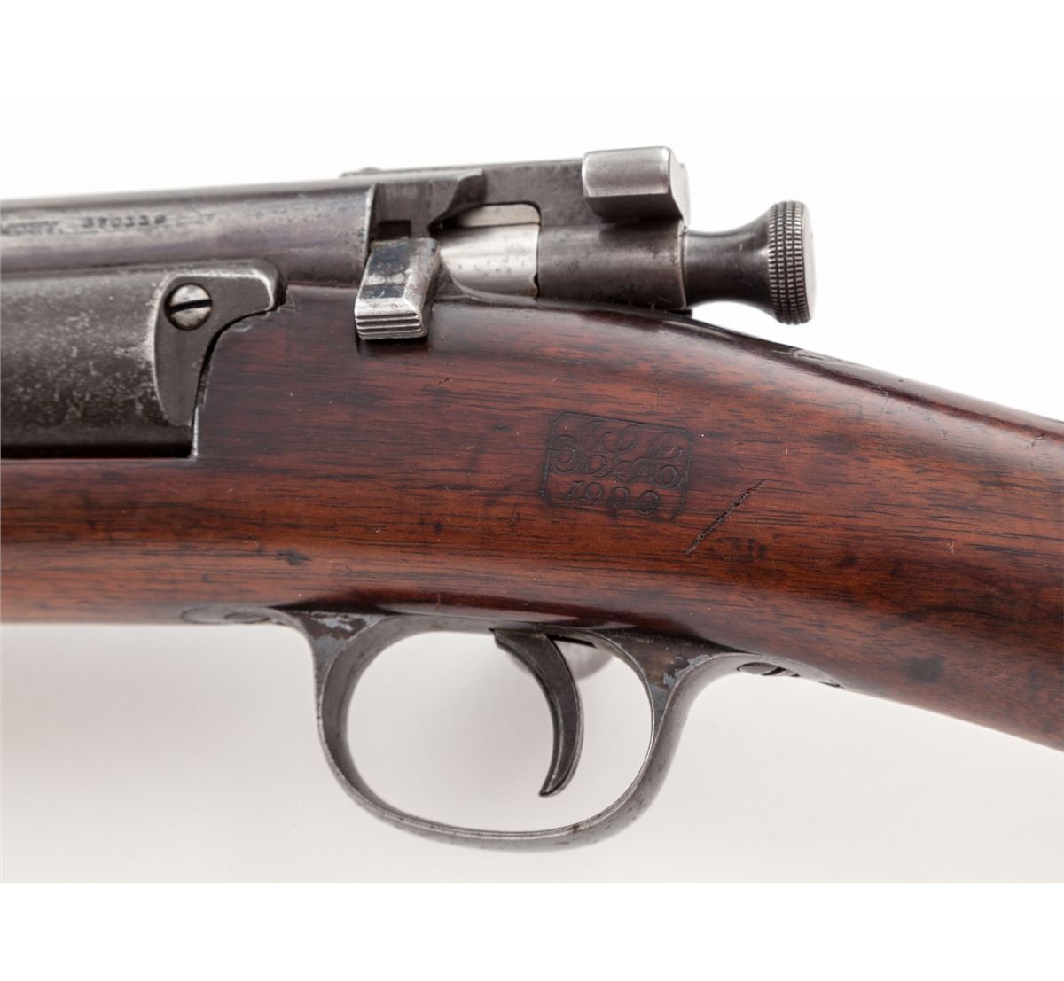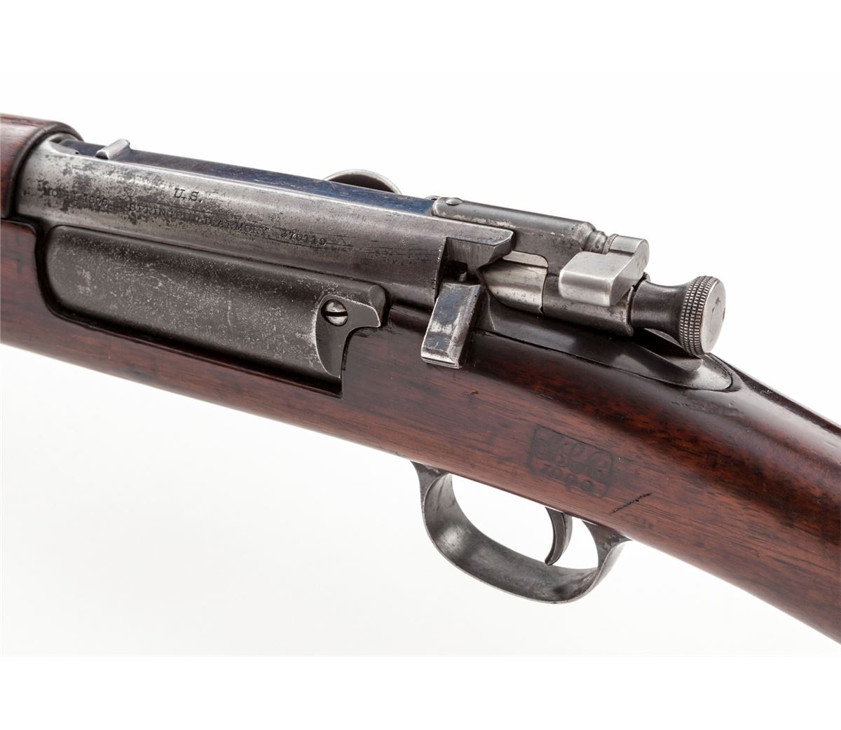 U.S. Model 1898 Krag Bolt Action Carbine, #370119, .30-40 cal., 22'' barrel, blue and case hardened finish, with 1900 cartouched walnut stock. Condition is about fine with metal surfaces having thinned to approx. 75% blue. Stock with oil darkening, light scuffs and scratches, and clear cartouche. Upper handguard with several fractures emanating from area behind rear sight and terminating at back edge of handguard. Action is crisp, bore is bright. Est.: $1,000-$1,500. (C&R)