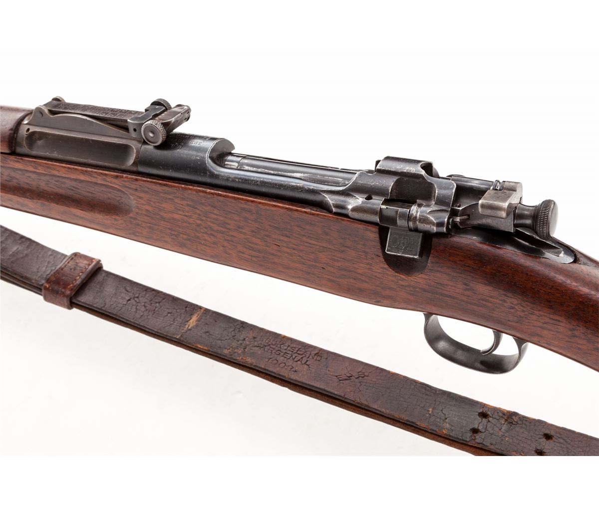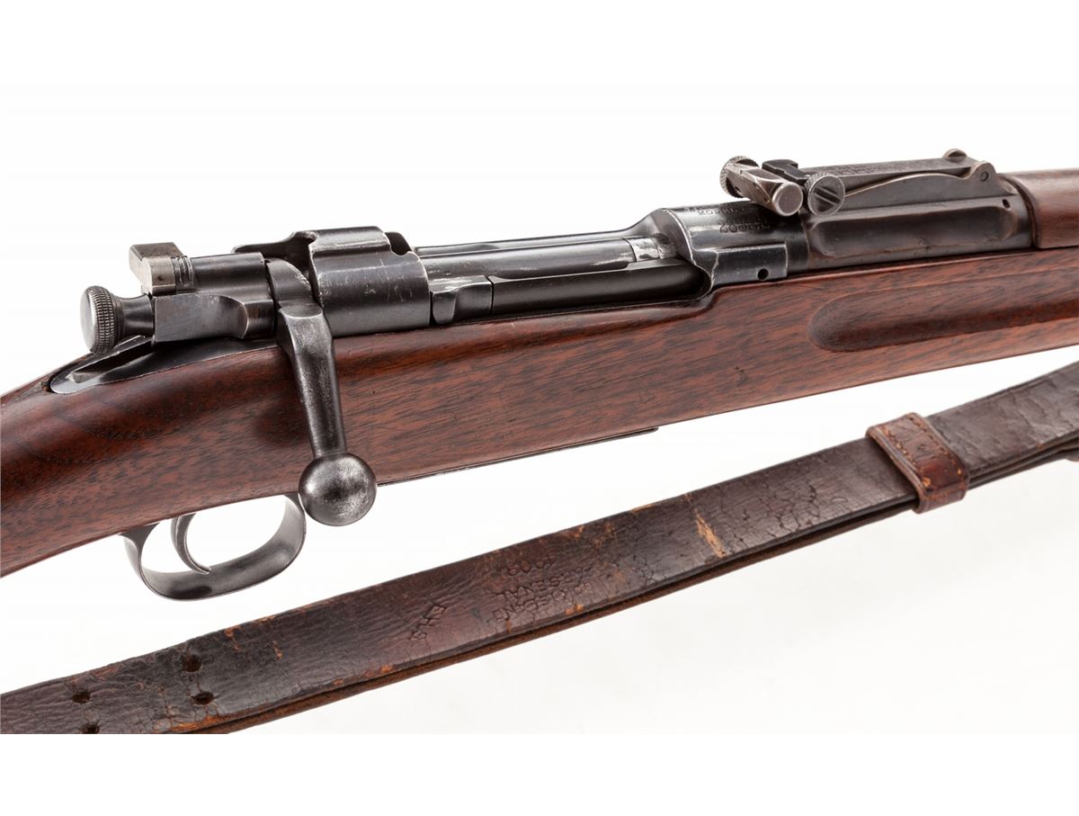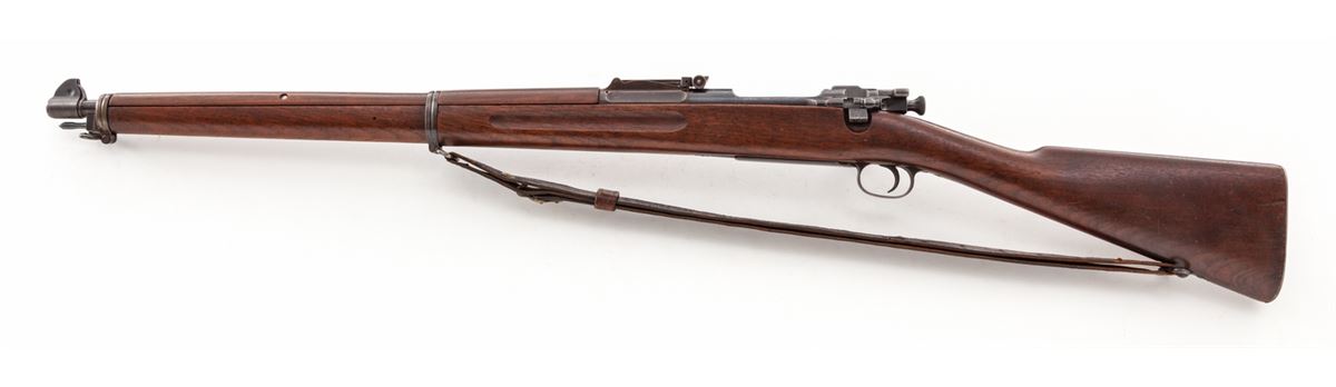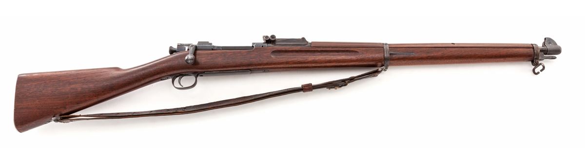 Early Rod Bayonet Model 1903 Springfield Bolt Action Rifle, #28322, .30-03 cal., 24-1/8'' barrel, blue finish, fingergroove walnut stock, with smooth steel buttplate. Early front and rear sight, with ramrod bayonet. Receiver area marked with ''S'' (Stembridge), as this rifle's barreled action was found in the 1950s by our consignor for sale at M.B. Rettings in Culver City, CA. Stock was later obtained in a similar fashion from another source; upper handguard was handmade to match. Condition is excellent. Metal parts retain approx. 96% blue. Rear sight band with approx. 60% toning blue. Stock was found with longitudinal crack along bottom edge, which has long been repaired. Front barrel band is modified from a regular '03. Early sling shows some crazing and wear near button and claw. Action is good, bore is fine. Early blue steel stamped sight cover is retained. Stembridge was a movie firearms rental company started in the early 1900s. Est.: $6,000-$8,000. (C&R)