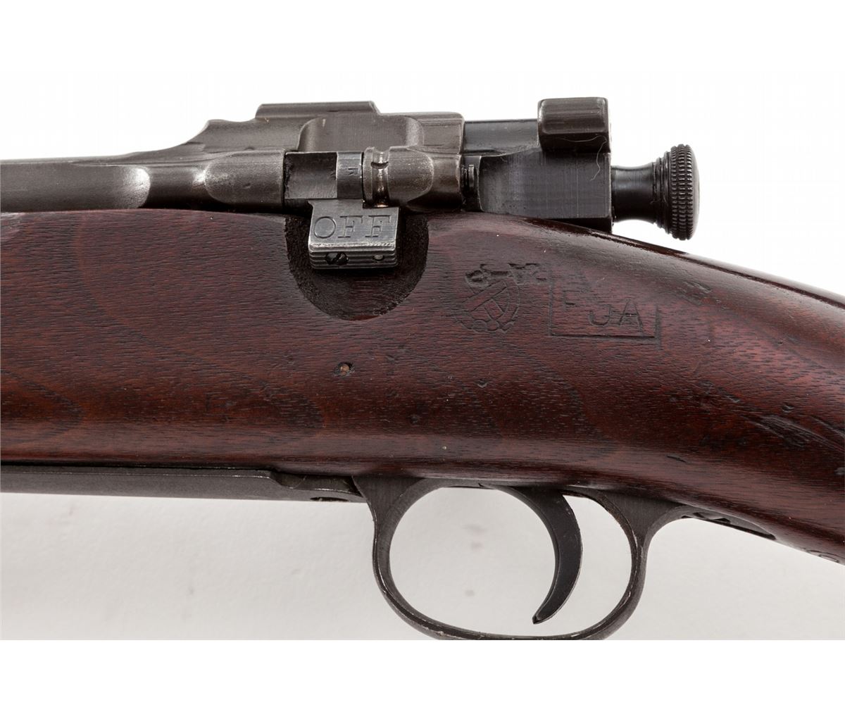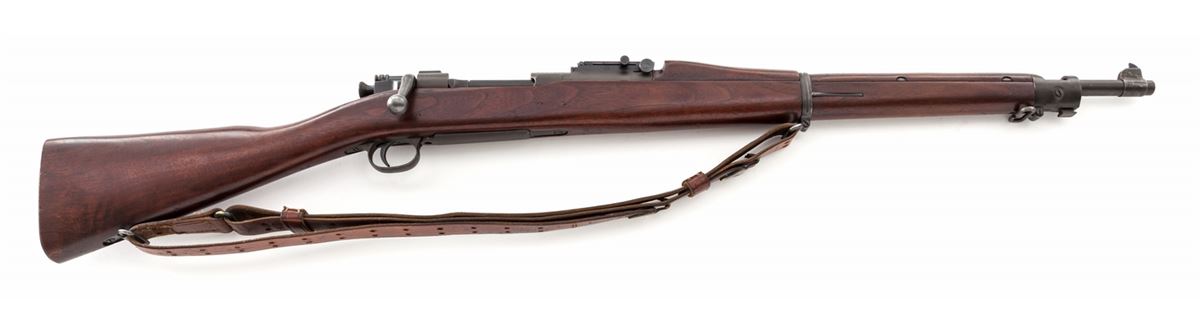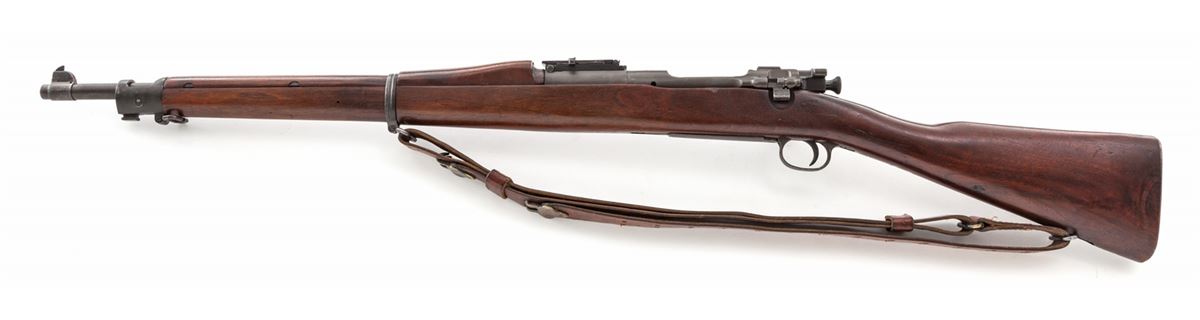 U.S. Model 1903 Bolt Action Rifle, by Remington, #3117684, .30-06 cal., 24'' Remington barrel dated 3-42, parkerized finish, with straight grip ''FJA'' cartouched walnut stock, and M1907 leather sling. Condition is near excellent retaining approx. 94% original finish. Blue bolt with thinning in actioning areas. Stock with very light scuffs and scratches. Action is crisp, bore is bright. Est.: $750-$1,000. (C&R)