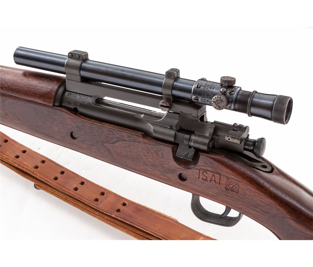 U.S. Model 03-A4 Bolt Action Sniper Rifle, by Remington, #3412124, .30-06 cal., 24'' barrel dated 6-44, parkerized finish, ''SA'' cartouched pistol-grip walnut stock, with M73B1 Weaver scope with single post reticule, on Redfield rings and mounts with scope covers. Includes 1907 type leather sling. Condition is excellent as arsenal overhauled, retaining approx. 97% parkerized finish. Stock with light scuffs and marks. Good optics, mirror bright bore. Est.: $3,000-$5,000. (C&R)