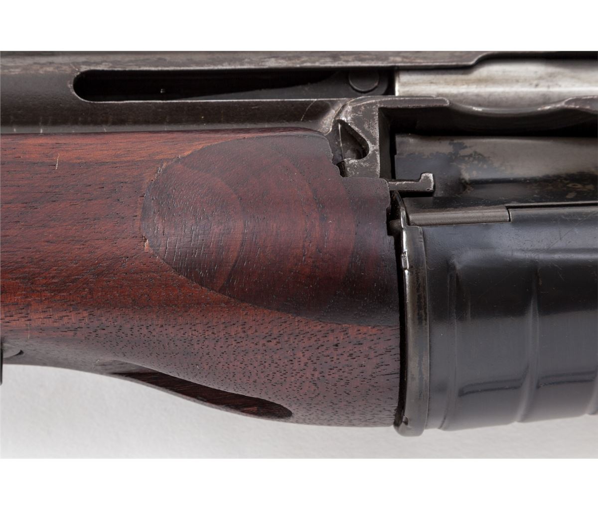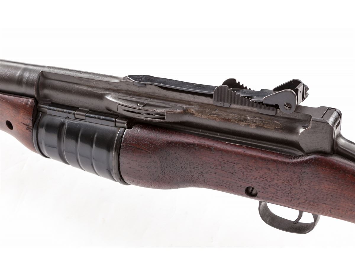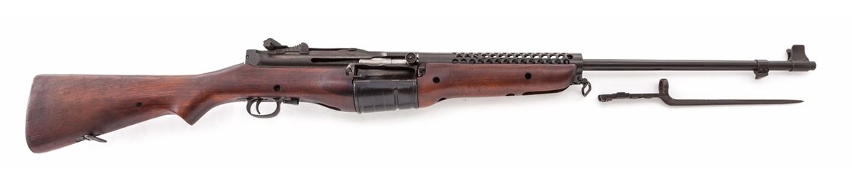 Model 1941 Johnson Semi-Automatic Rifle, #A7273, .30-06 cal., 23'' barrel, parkerized finish, walnut stock and forend. Magazine has blue tones over parkerized finish. Original bayonet is included. Used by the USMC in limited numbers during WWII, with most going to the Netherlands for the Dutch East Indies. Condition is near excellent with thinning to finish and possible repair to upper portion of receiver. Stock shows only light marks from handling. Action is crisp, bore is bright. Est.: $2,500-$4,000. (C&R)