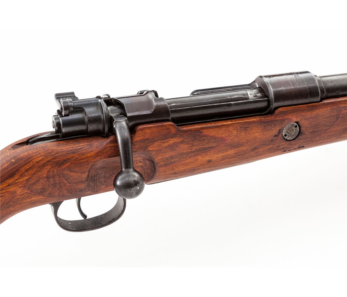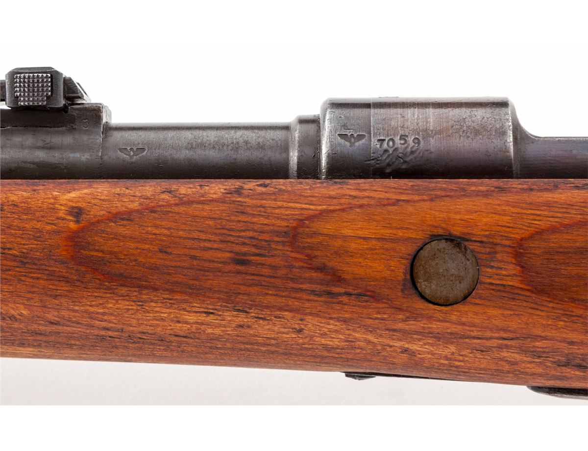 WWII German Mauser 98k Bolt Action Rifle, by Steyr (bnz-43), #7059s, 8mm, 24'' barrel, blue finish, laminated beech stock. ''(Eagle)/N'' commercial proof to left side of barrel just behind rear sight and to left side of receiver ring near stock line, as common with SS contract rifles. Condition is good to very good retaining approx. 90% black/blue. Knackering to metal surfaces beneath serial number. All matching visible serial numbers. Stock with light sanding. Good action and bore. Est.: $750-$1,000. (C&R)