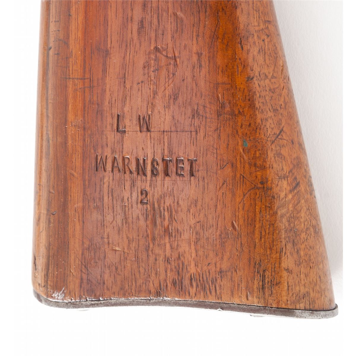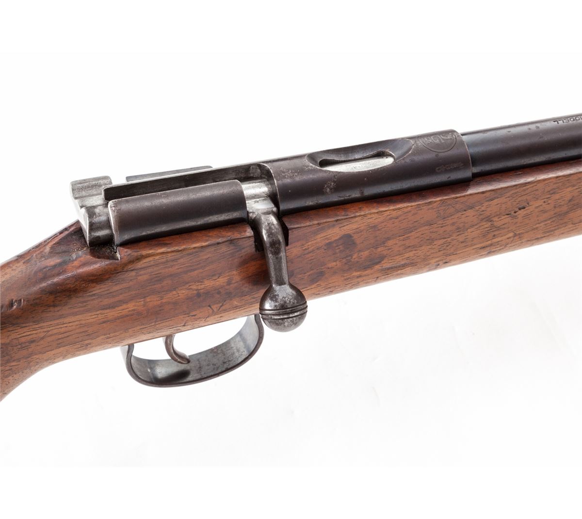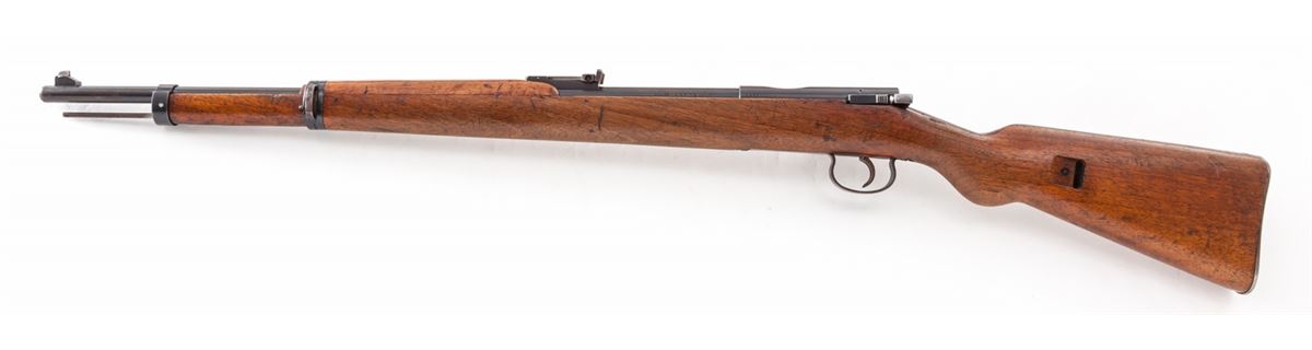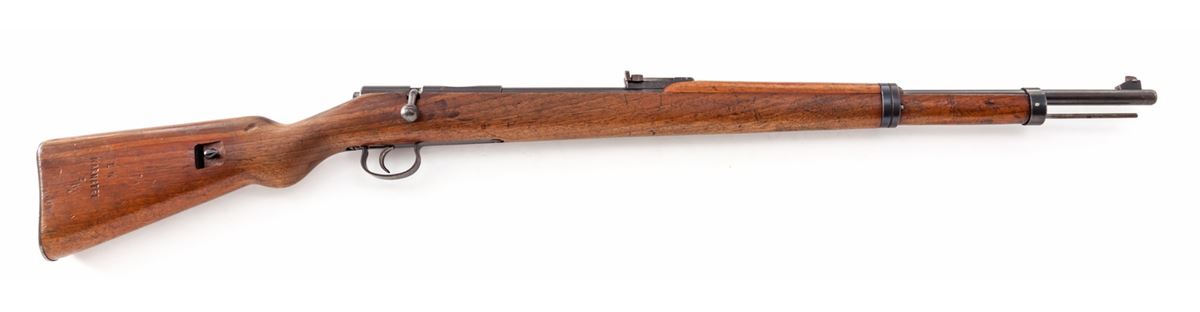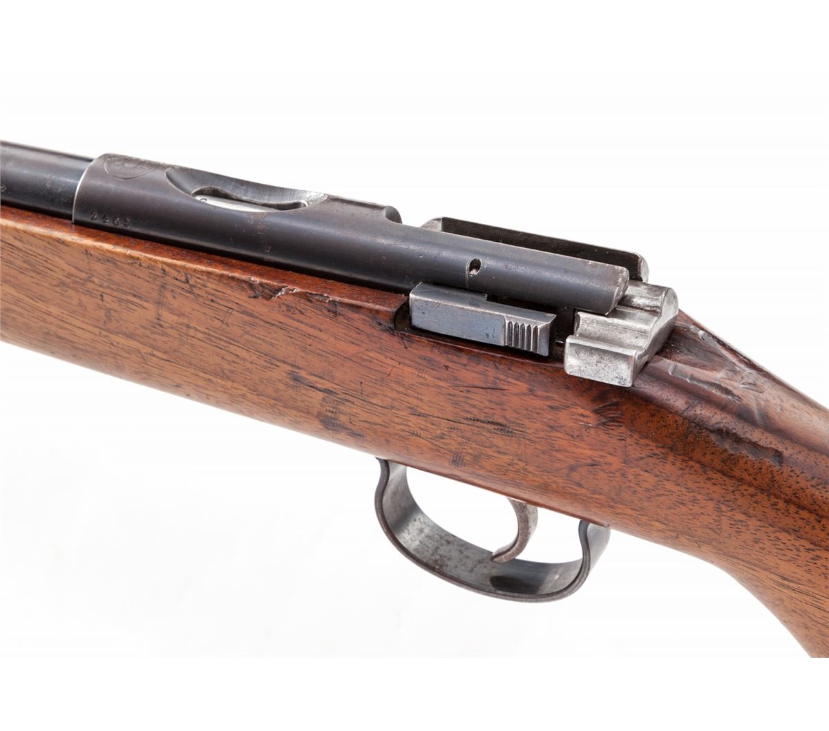 WWII Era German Anschutz Sport Modell Bolt Action Rifle, #2465, .22 LR cal., 26'' barrel, blue finish, European walnut military style stock and upper handguard. Used by youth groups prior to entering military service for rifle training. Rifle with ''JGA'' logo to chamber area, and ''(crown)/N'' proofmarks to barrel. Right side cheek area of stock marked ''LW Warnstet/2''. Condition is fine. Metal surfaces retain approx. 85% thinning and toning blue. Stock with light scuffs and marks from handling. Action is good, bore is bright. Est.: $500-$750. (C&R)