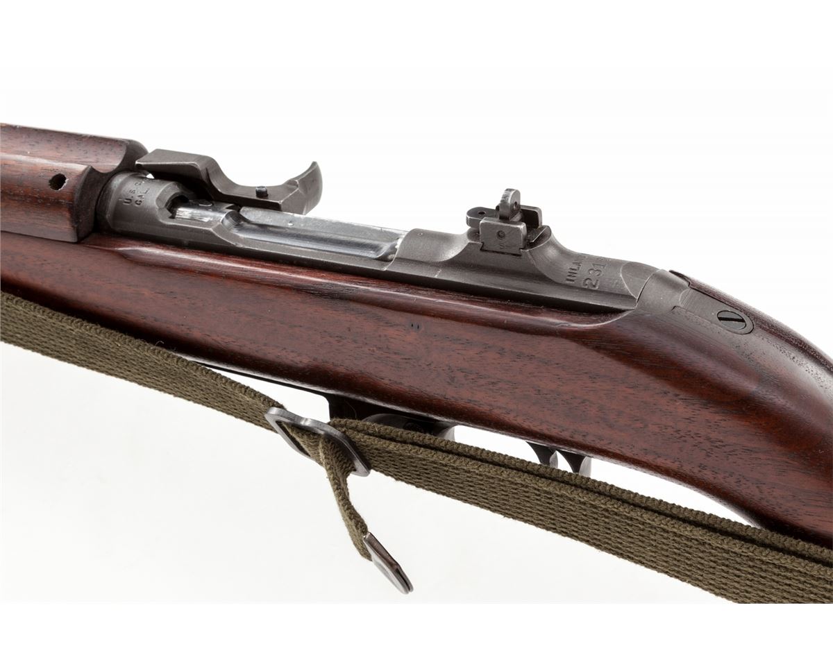 Early U.S. M1 Carbine, by Inland, #231686, .30 Carb. cal., 18'' Inland barrel dated 12-42, eye-cut high wood walnut stock and two-rivet forend with ''IO'' and flaming bomb in sling cove; flat bolt, flip sight and checkered push-button safety. Includes later made web sling. Condition is excellent showing light general marks from handling. Good cartouches. Thinning in the actioning areas. Good action, bright. Est.: $1,200-$1,800. (C&R)