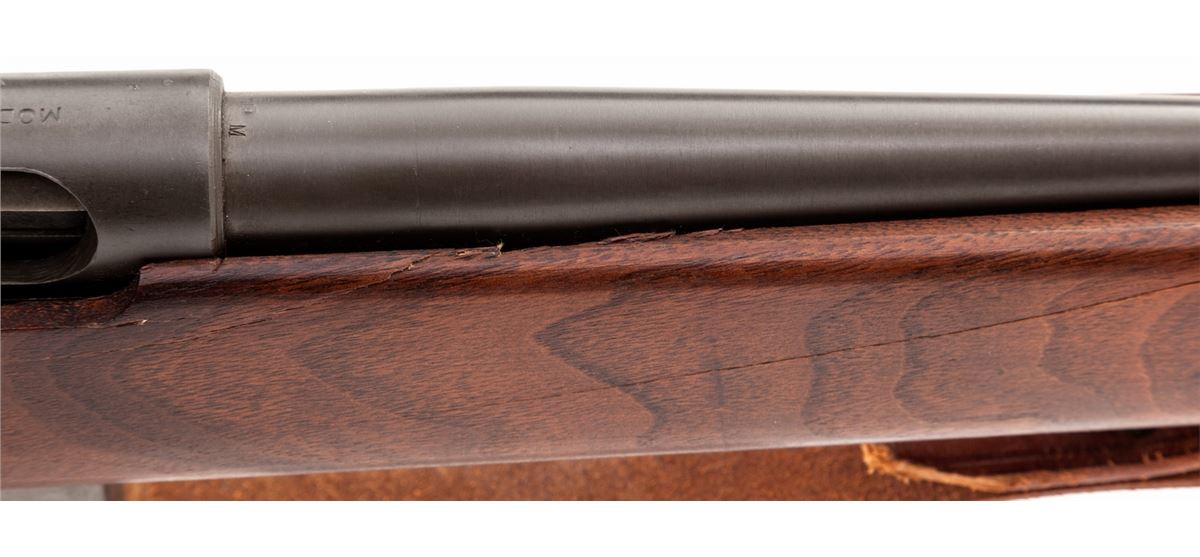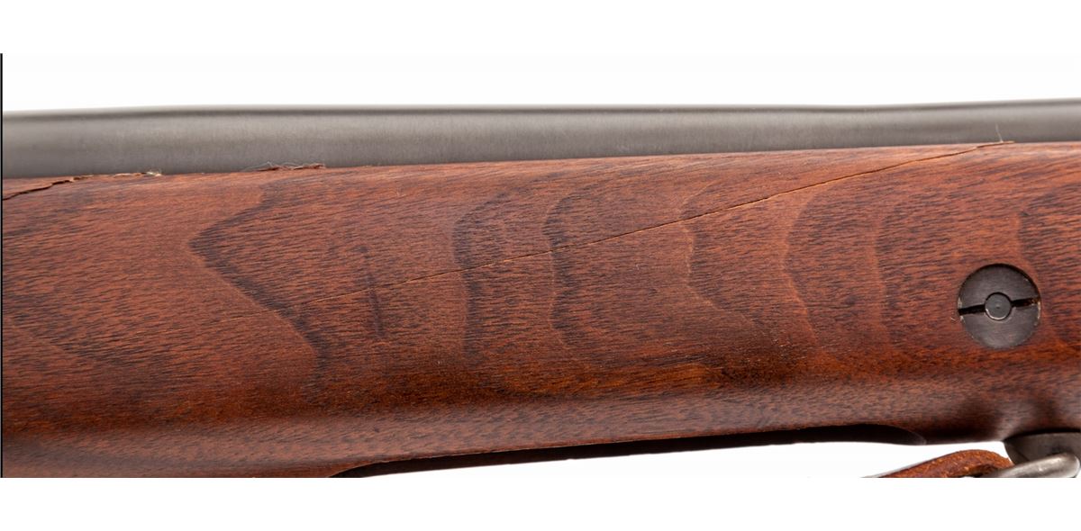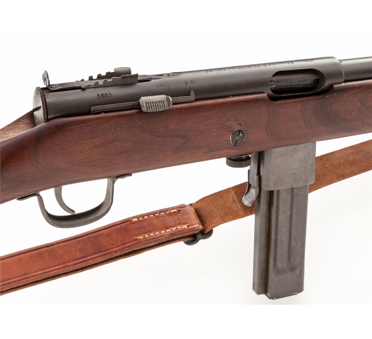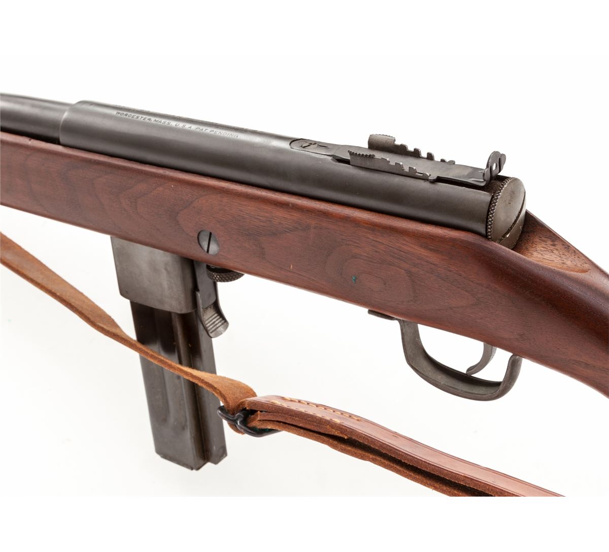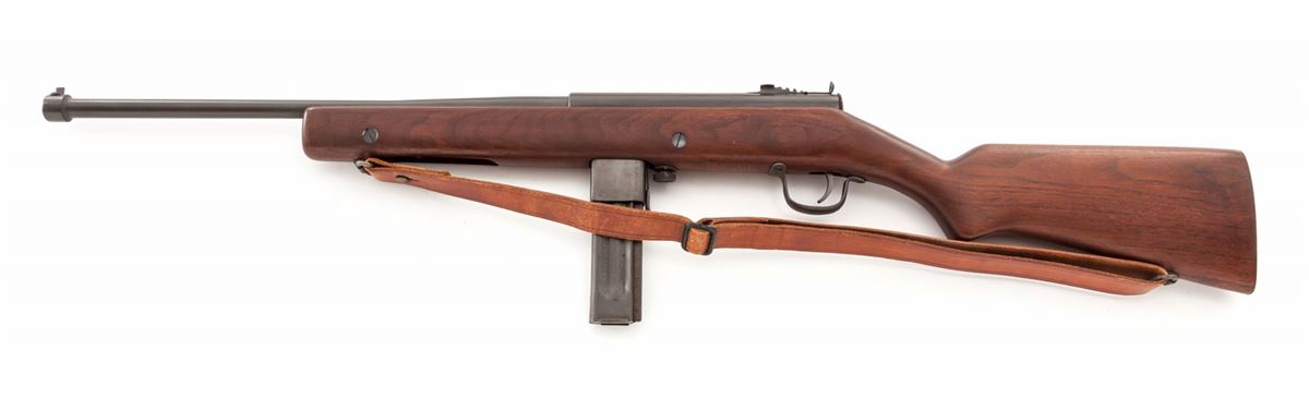 Reising Model 60 Semi-Automatic Rifle, by H&R, #1003, .45 ACP cal., 18'' barrel, parkerized finish, walnut stock, with leather sling and one H&R marked 12-round magazine. Condition is excellent showing little use. Stock with two 8'' cracks to right side, which could be repaired. Action is good, bore is bright. Est.: $800-$1,200. (C&R) (High-cap mags not available to Calif. residents.)