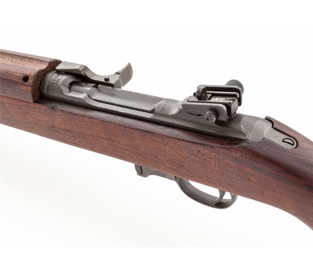 U.S. M1 Carbine, by Standard Products, #2037771, .30 Carb. cal., 18'' Underwood barrel dated 9-43, parkerized finish, walnut stock marked ''RIA/EB''. Rifle features flat bolt, Type 3 rear sight, flip safety, oval cut low-wood stock, with two-rivet upper handguard and bayonet lug. Serial number is additionally marked forward the rear sight. Condition is excellent as overhauled, retaining approx. 95% parkerized finish. Stock with some oil darkening. Action is good, bore is bright. A nice post-war rebuilt carbine with mixed parts. Est.: $600-$800. (C&R)