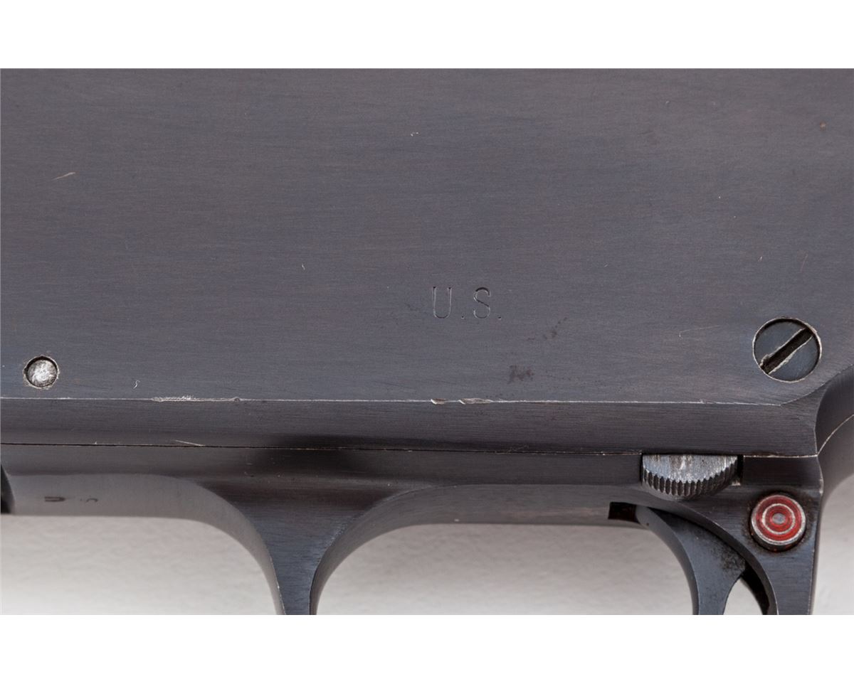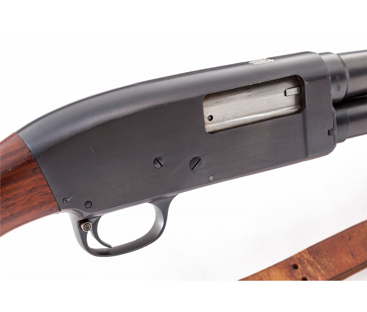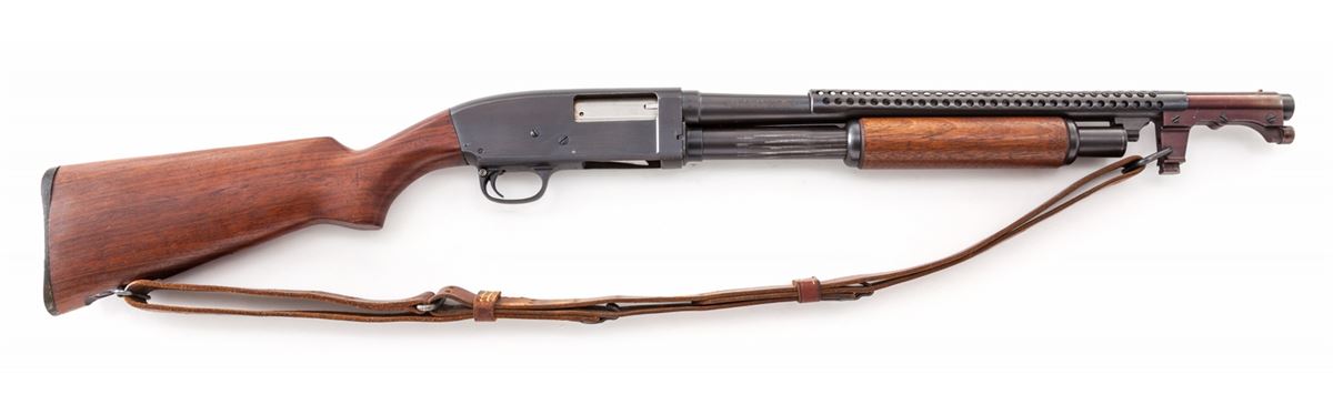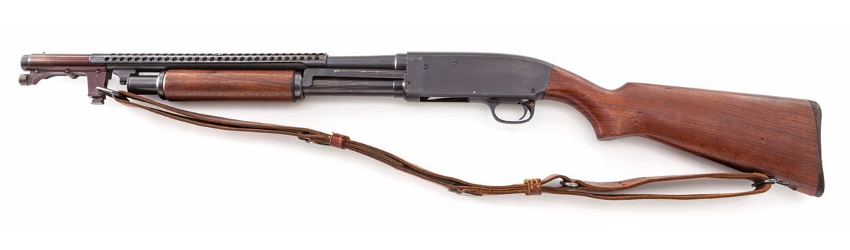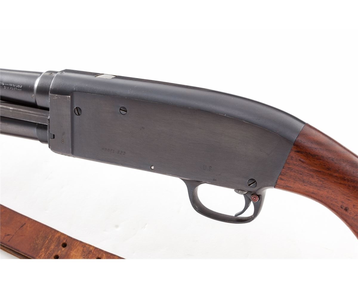 U.S. marked Stevens Model 620 Pump Action Trench Gun, #26996, 12 ga., 20'' barrel, blue finish, walnut stock and forend, factory checkered black plastic buttplate, with ''S'' marked ventilated handguard and bayonet lug, and 1943 dated M1907 Milsco leather sling. Receipt in channel beneath butt trap. One of the scarcest WWII riot guns and not to be confused with the more common Model 520. Left side of frame marked ''U.S.'' with small flaming bomb near forward portion frame and right side of barrel, as well as four (4) ''P'' proofmarks to barrel and frame extension. Correct plum coloration to forward portion of ventilated handguard. Barrel and receiver with matching serial numbers. Condition is excellent retaining approx. 97% original matte blue with light thinning at high edges and actioning areas. Stock shows minor handling marks. Action is crisp, bore is bright. Est.: $2,500-$3,500. (C&R)