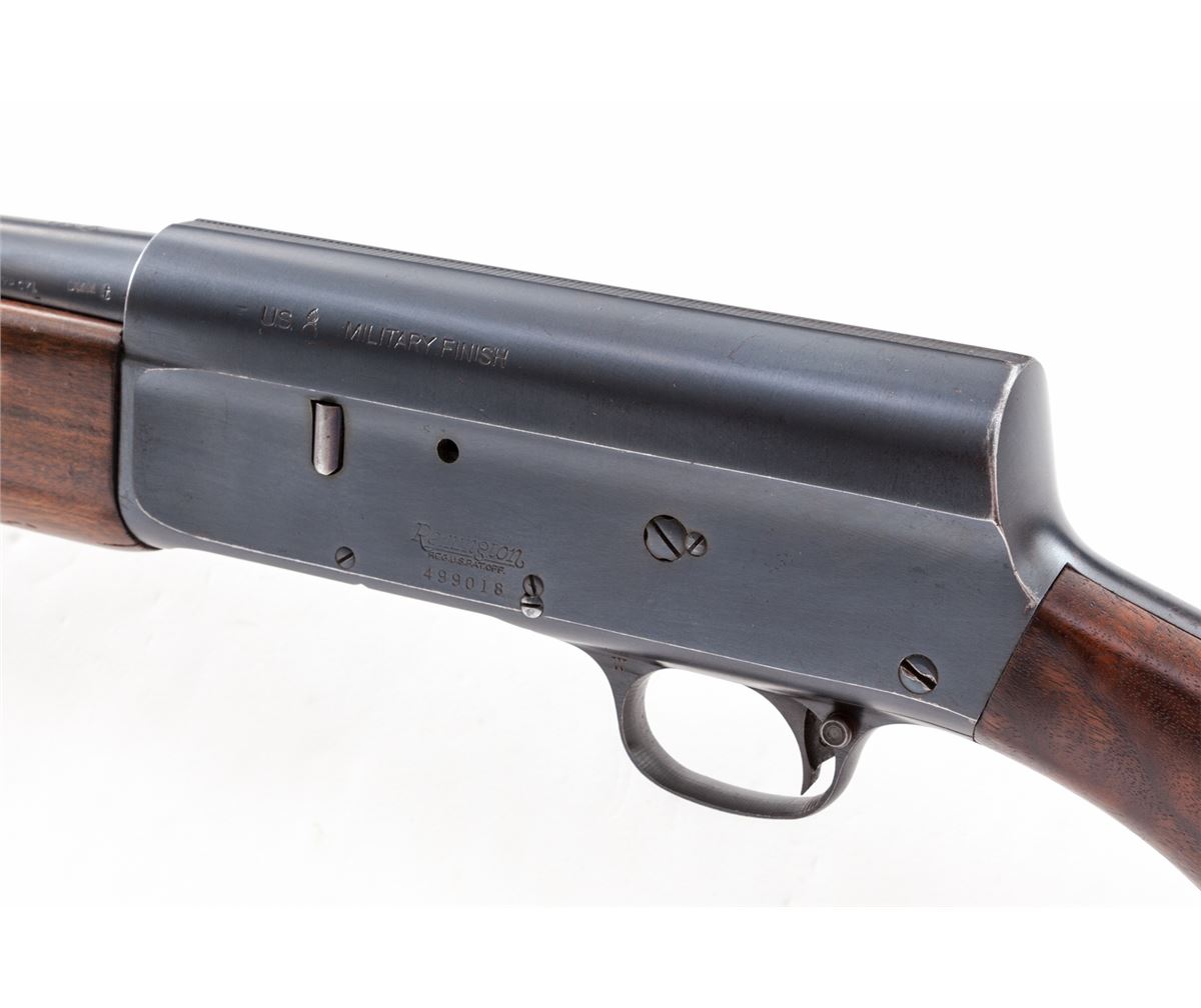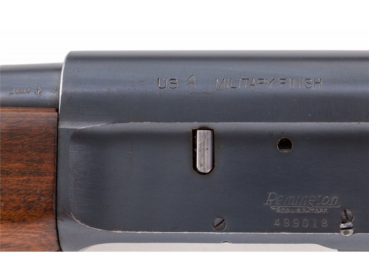 U.S. marked Remington Model 11 Semi-Automatic Shotgun, #499018, 12 ga., 24'' barrel choked IC, matte blue finish, ''FJA'' Ordnance wheel cartouched walnut stock and forend, with ''DMM'' anchor inspection marking to left side of barrel at breech, and U.S. flaming bomb military finish mark to upper left side of frame. Original phenolic Remington marked buttplate is retained. Condition is excellent retaining approx. 95% original lightly thinning blue. Stock remains crisp, as does action and bore. Est.: $1,000-$1,500. (C&R)
