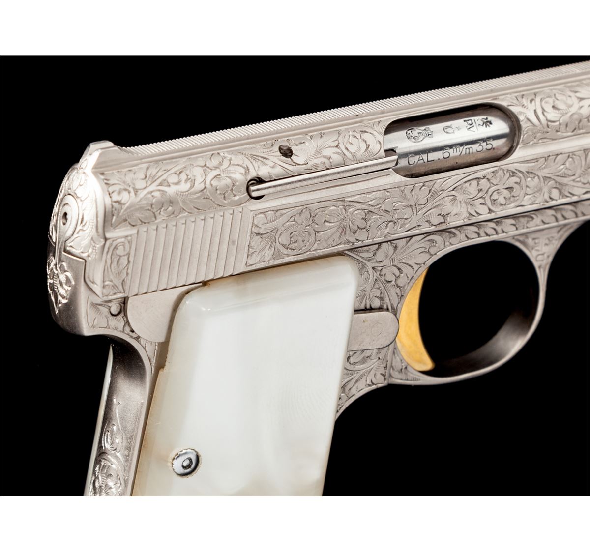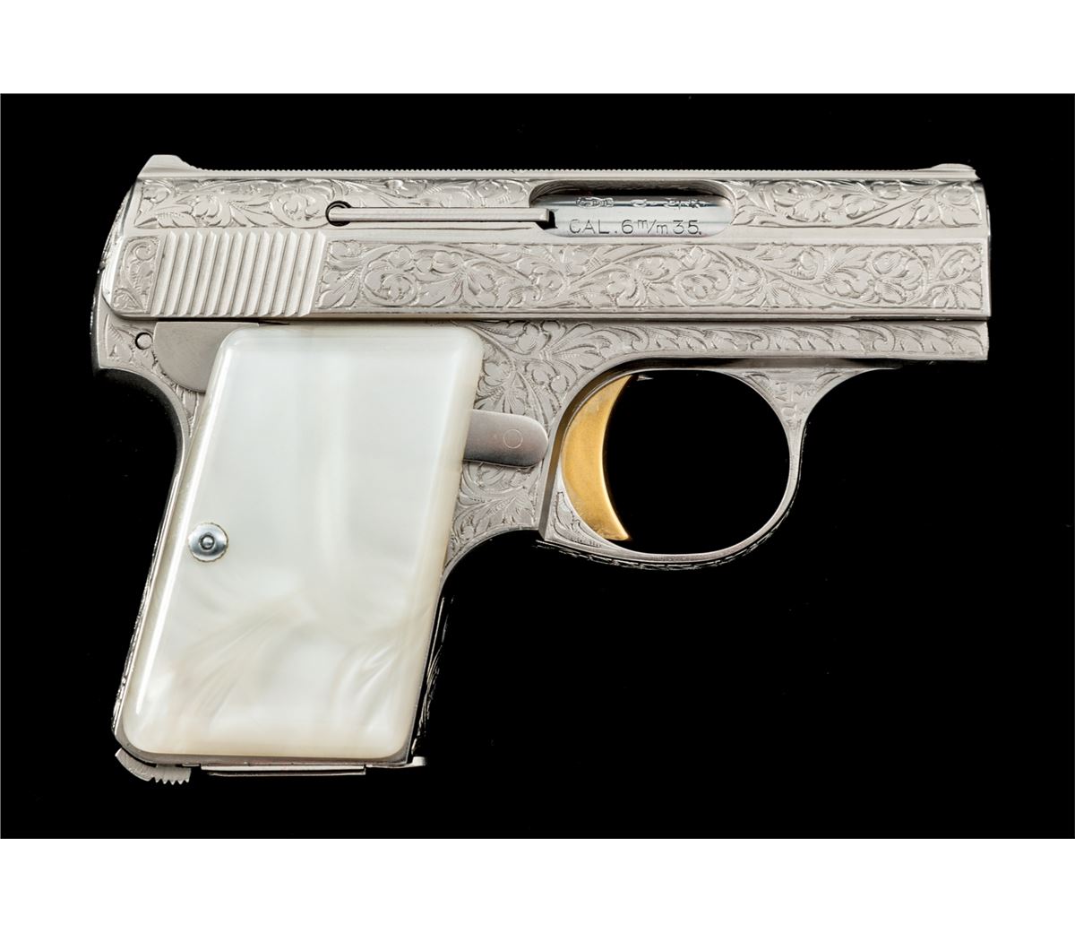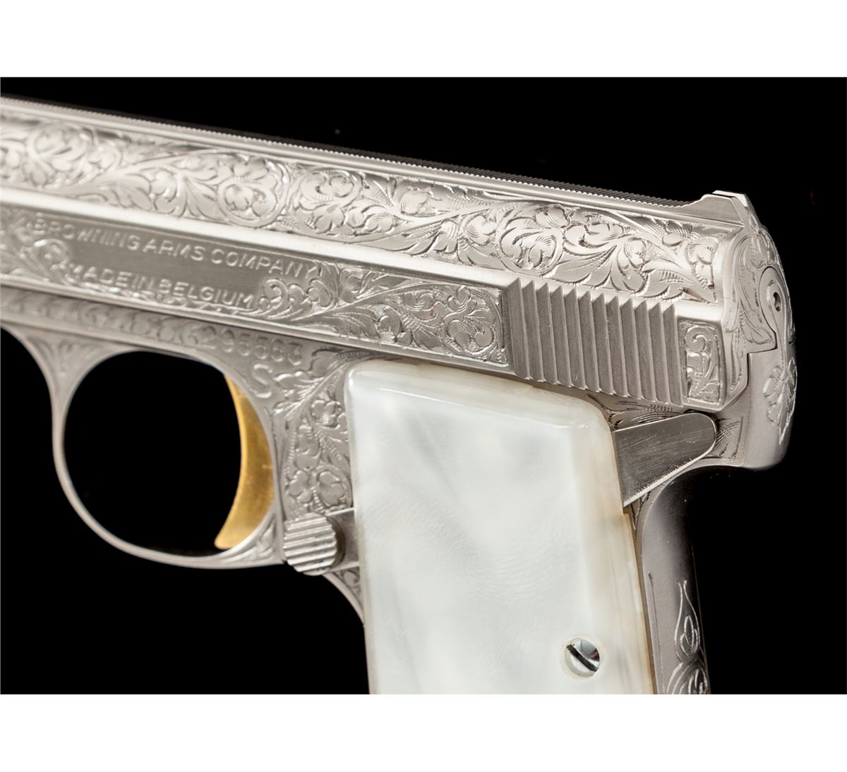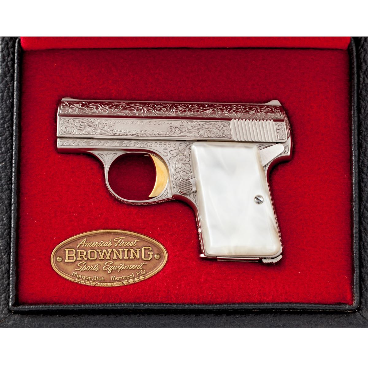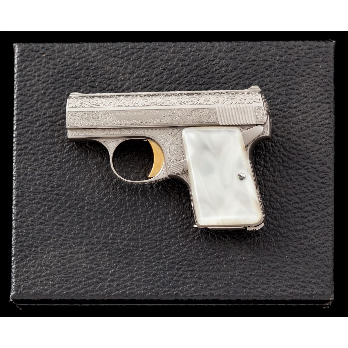 Renaissance Engraved Baby Browning Semi-Automatic Pistol, #295563, .25 ACP cal., 2'' barrel, Belgian foliate engraved bright frame, pearlite grips, with gold trigger. In factory presentation case with instructions and warranty card. Condition is excellent, appearing as new and unused. Est.: $2,500-$3,500. (C&R/PPT)