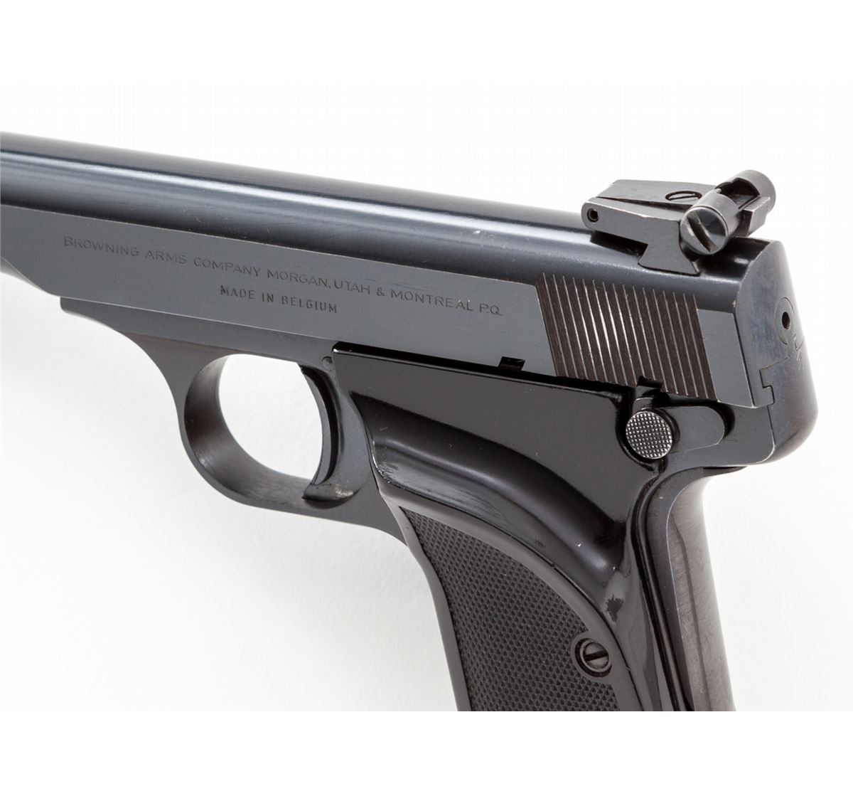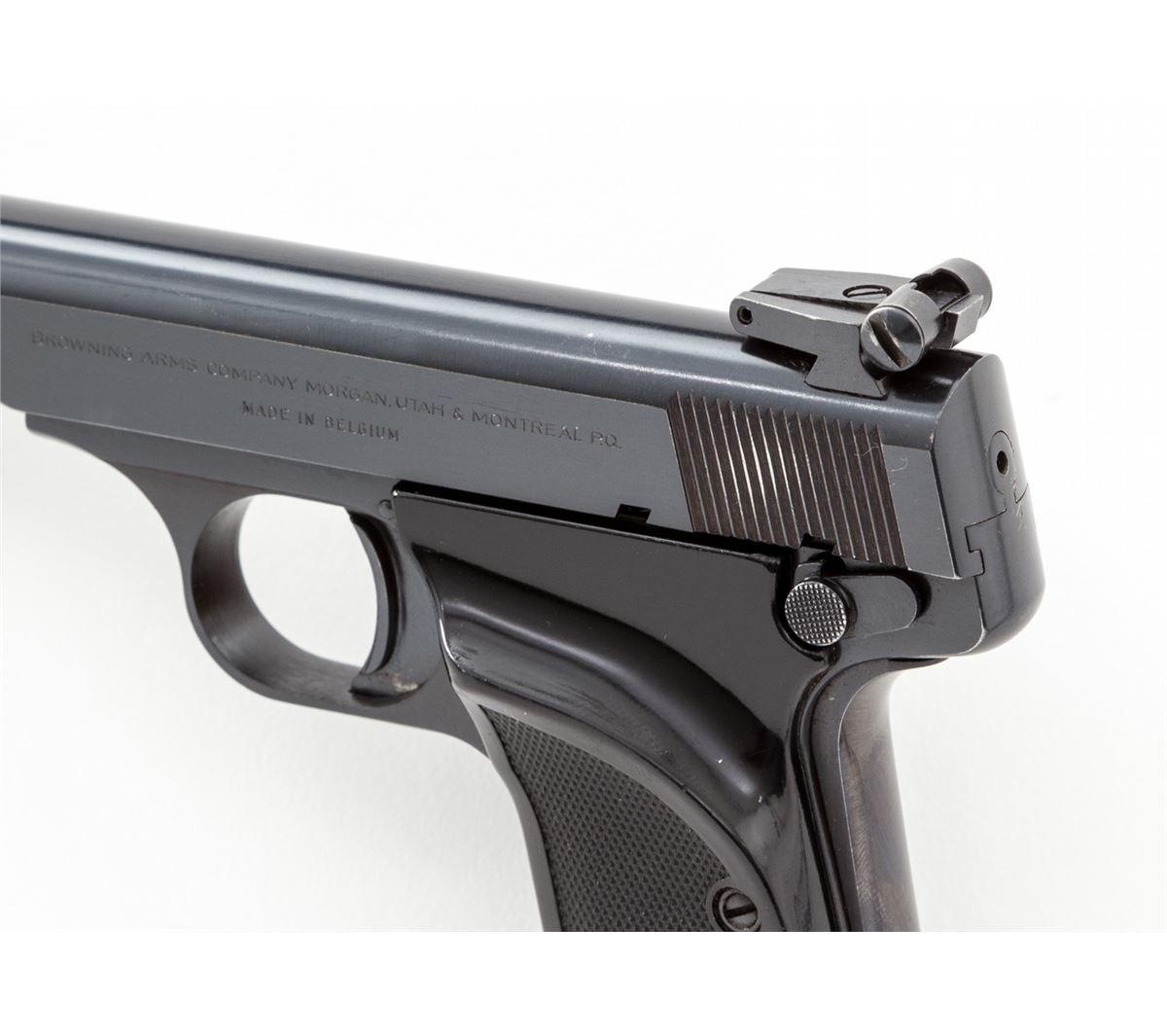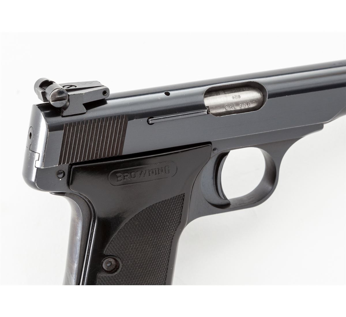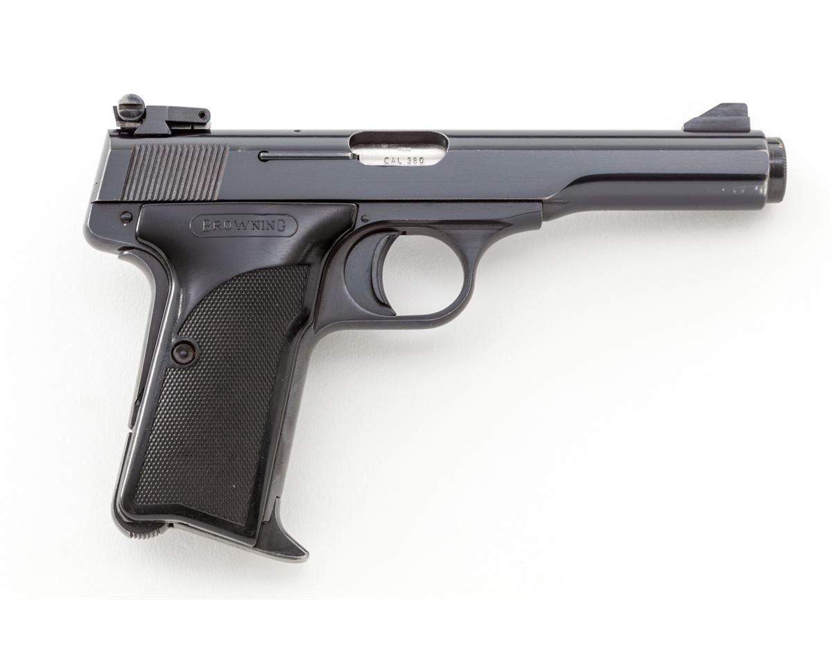 Browning Model 1955 Target Semi-Automatic Pistol, #71NO3767, .380 cal., 4-1/2'' barrel, factory adjustable sights, blue finish, black plastic grips, with one finger-rest magazine. Mfg'd 1971. Condition is excellent showing very light wear at edges. Crisp grips and action, bright bore. Est.: $400-$600. (Modern/PPT)