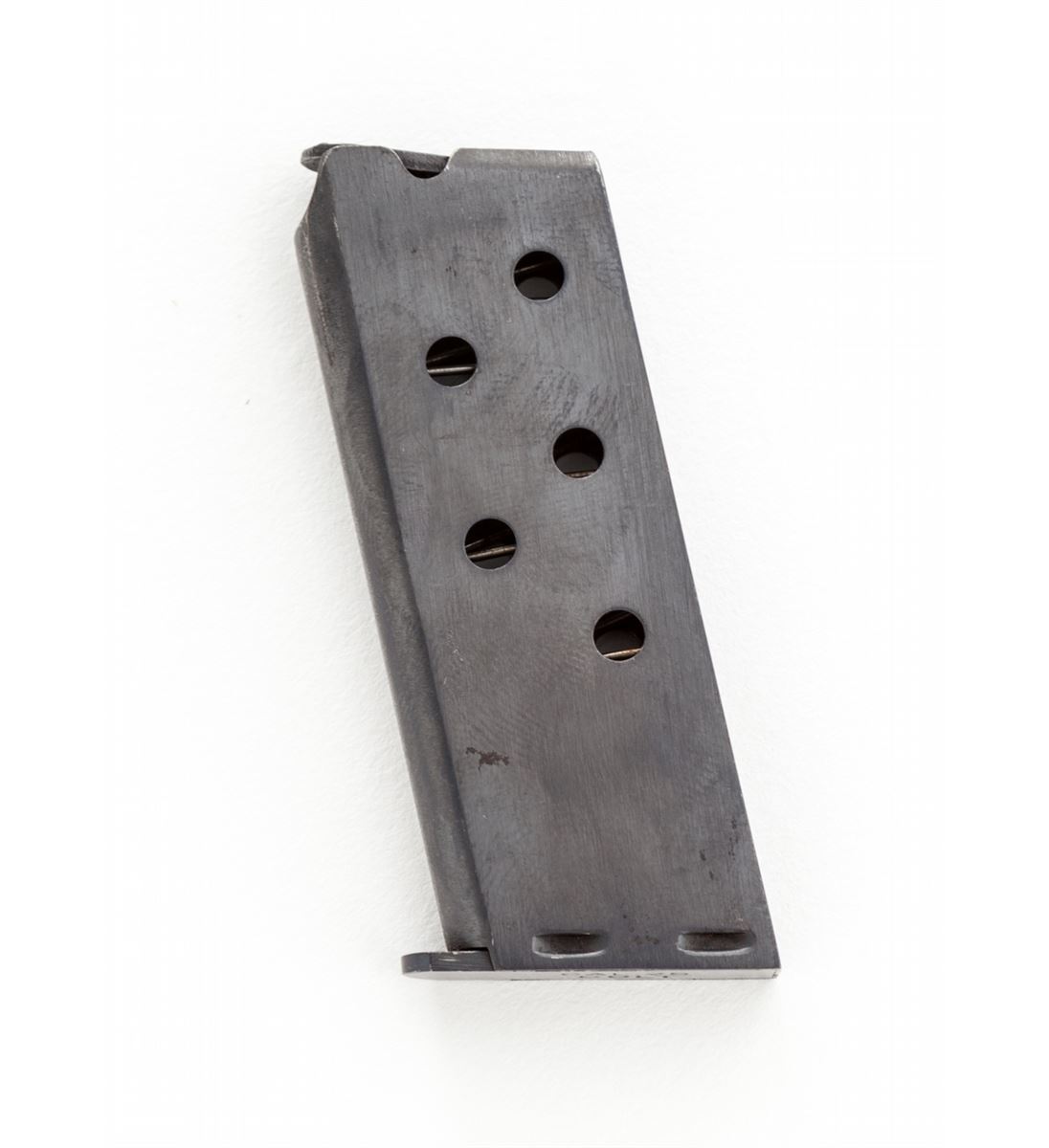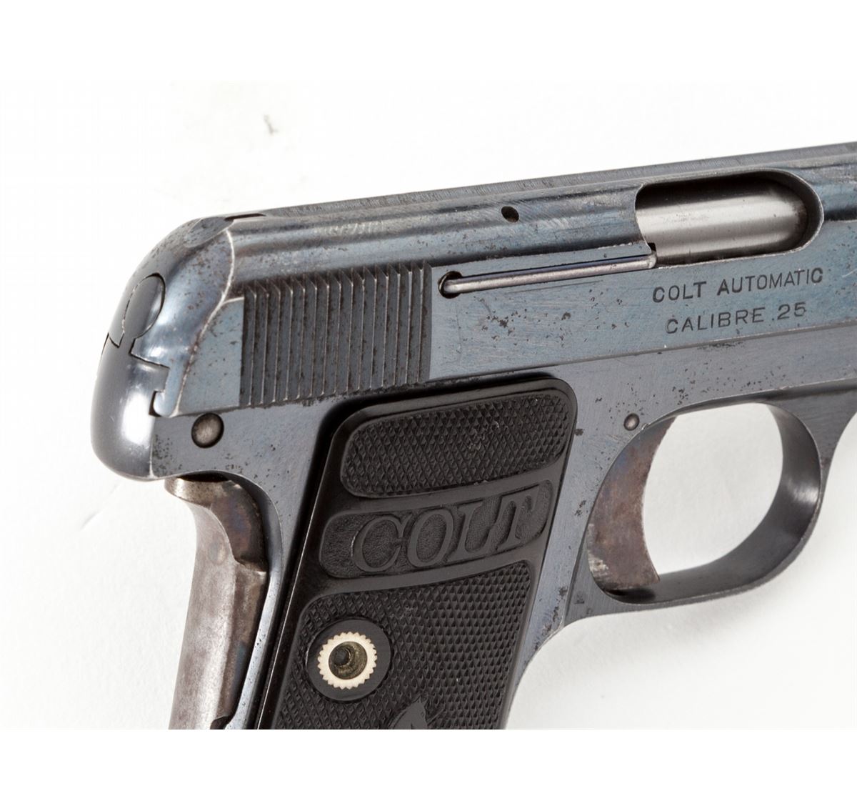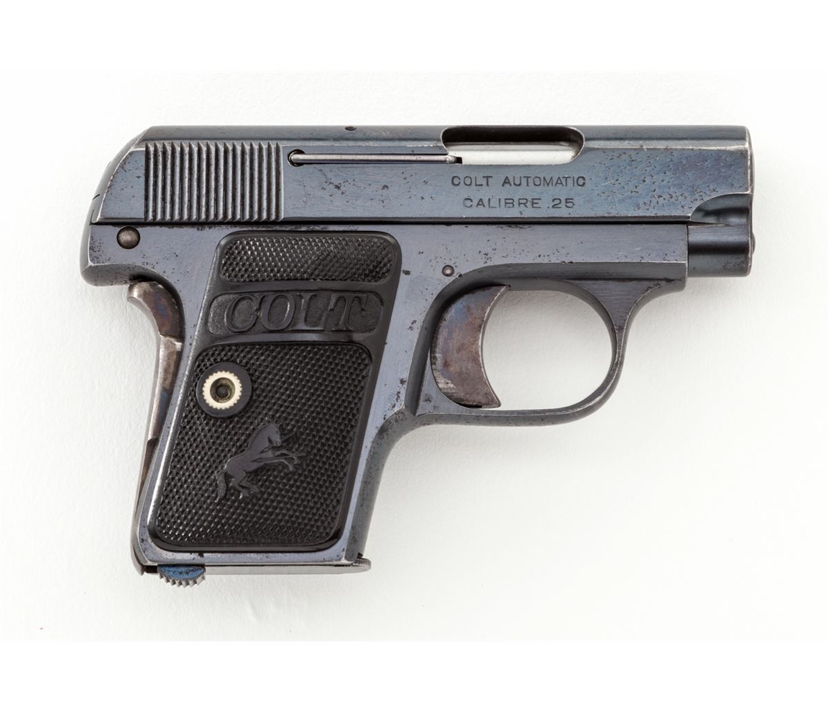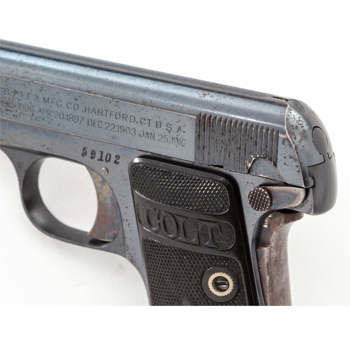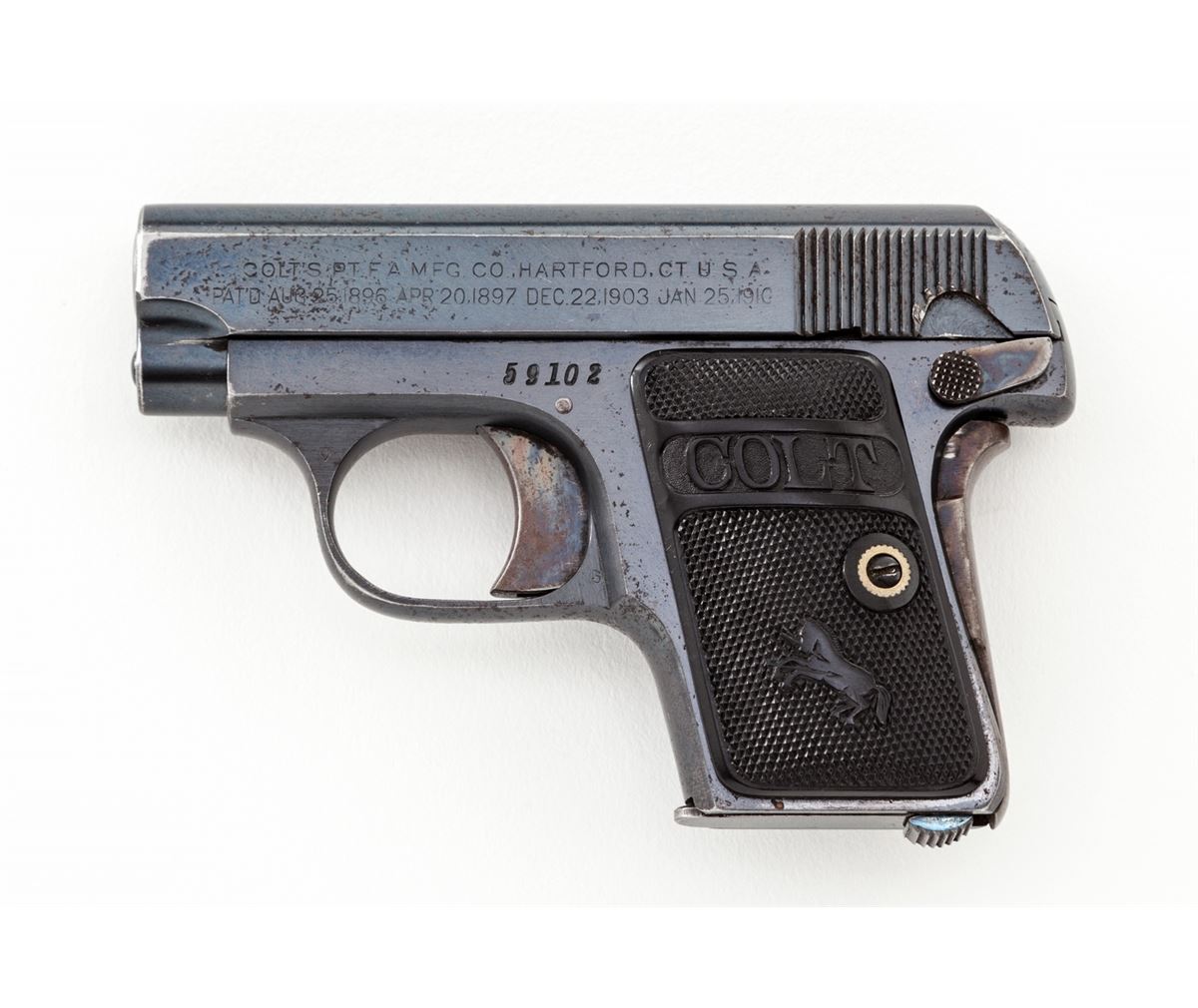 Colt High-Polish Model 1908 Vest Pocket Semi-Automatic Pistol, #59102, .25 Auto cal., 2'' barrel, blue finish, case hardened small parts, factory checkered hard rubber grips, with one correct and one slightly later factory magazine. Mfg'd 1911. Condition is fine to near excellent retaining approx. 92% high-polish blue with light wear at muzzle and minor freckling to finish. Grips and action are crisp. Case colors have thinned to grip safety. Bore is very good. Est.: $500-$750. (C&R/PPT)