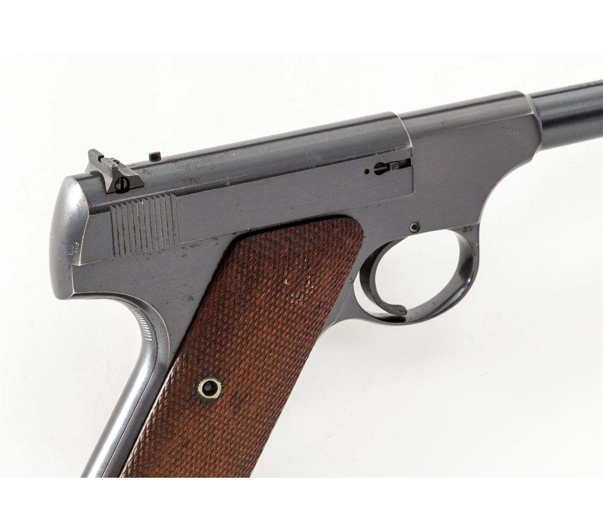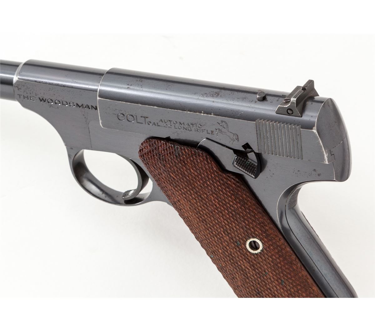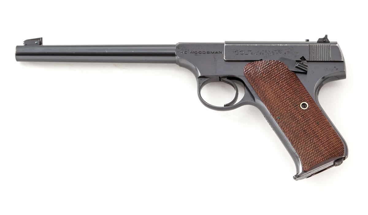 Pre-War Colt Woodsman, #100958, .22 LR cal., 6-1/2'' barrel, blue finish, factory checkered walnut grips, with one correct Woodsman magazine. Mfg'd 1936. Condition is excellent retaining approx, 96% blue with light general high edgewear and minor speckling to rear portion of frame. Grips and action are crisp, bore is bright. Est.: $600-$800. (C&R/PPT)