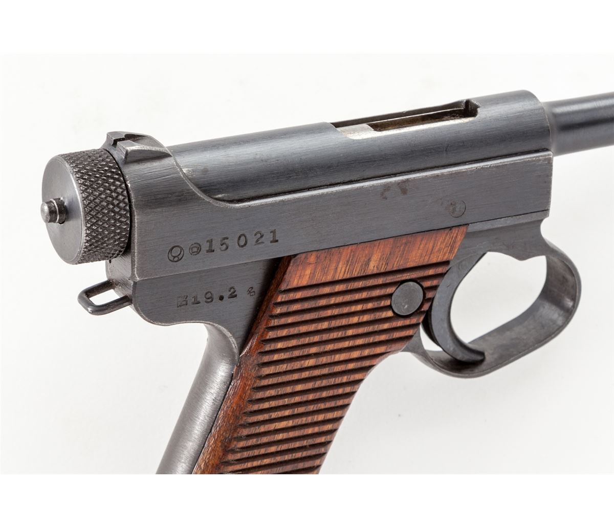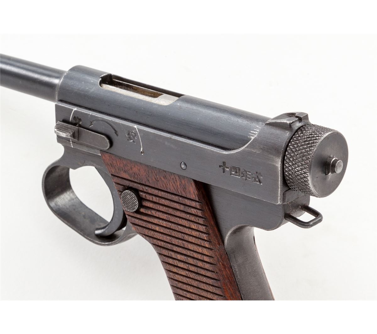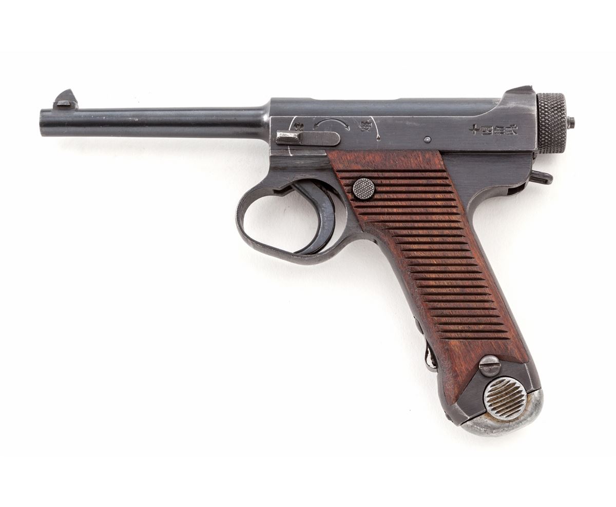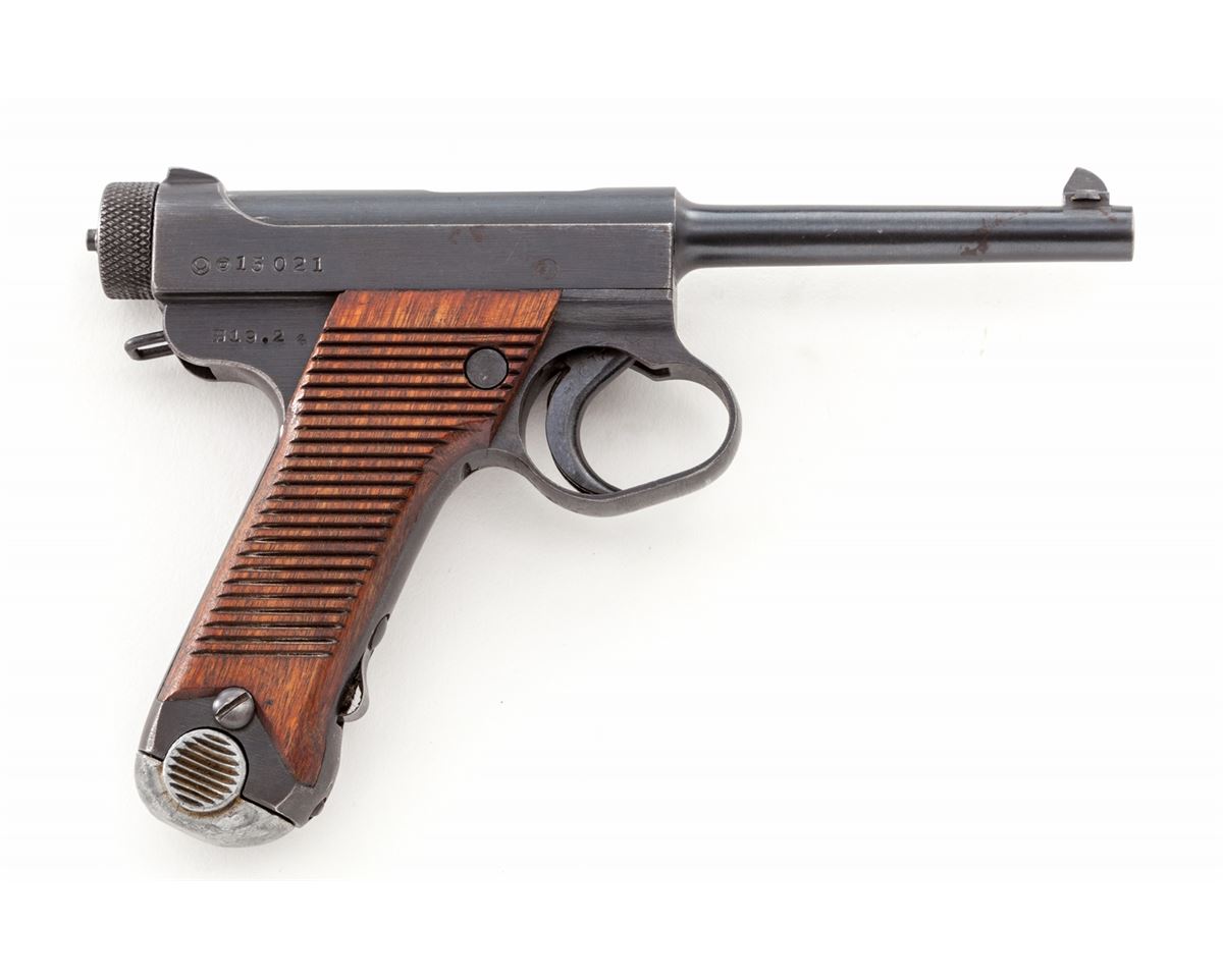 Japanese Type 14 Nambu, by Nagoya, #15021, 8mm, 4-1/2'' barrel, blue finish, grooved Asian hardwood grips, with one matching numbered magazine. Pistol is dated 19.2 (Feb. 1944). Condition is excellent retaining approx. 92%+ original finish, with strong colors to both front and backstrap. Radius scratches to safety area, common to this model, are visible. Grips and action are crisp, bore is bright. Interior of pistol with old preservative visible. Est.: $600-$800. (C&R)