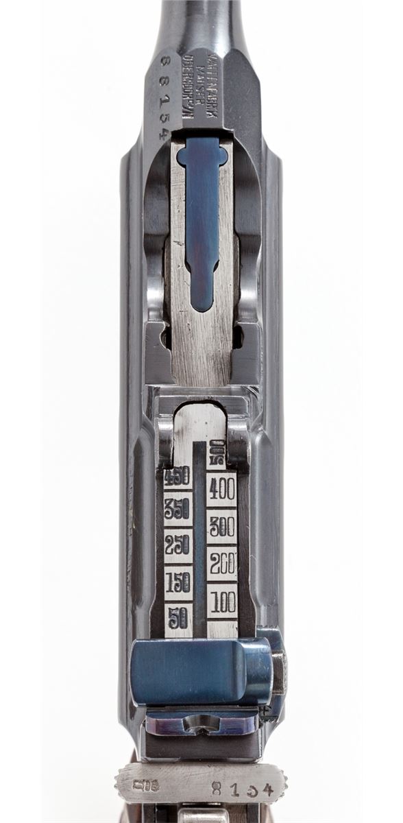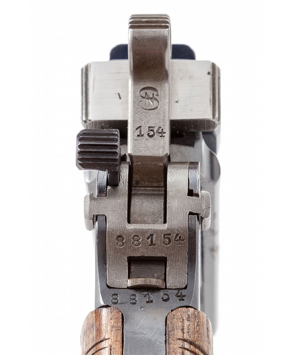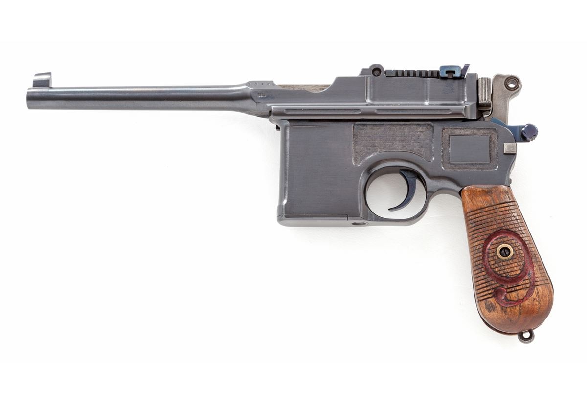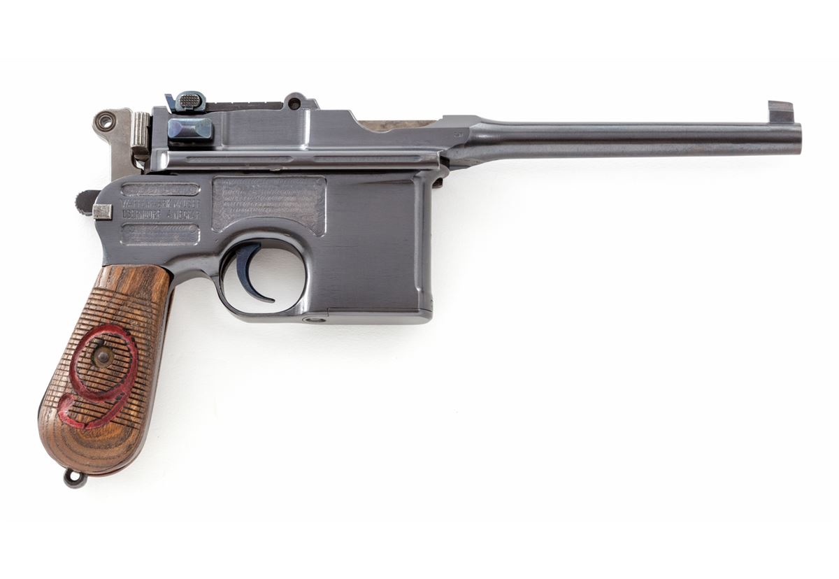 Mauser C-96 Red 9 Military Contract Broomhandle Semi-Automatic Pistol, #88154, 9mm, 5-1/2'' barrel, blue finish, Red 9 marked 24-groove walnut grip. Front of magazine well with Imperial German eagle. Condition is excellent as professionally restored, retaining approx. 99% correct type blue. Grips, action and bore are excellent. Est.: $1,800-$2,400. (C&R)