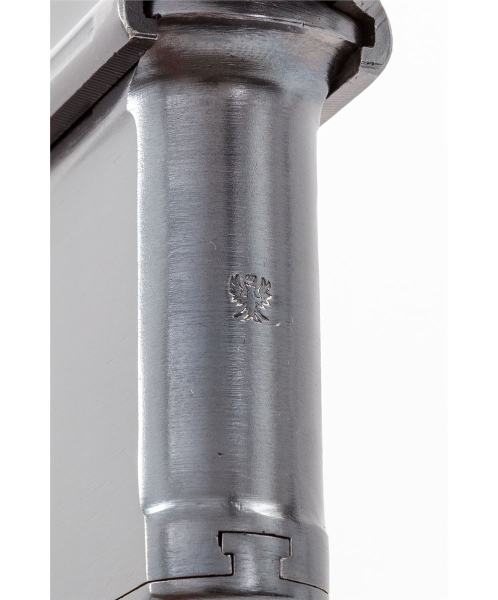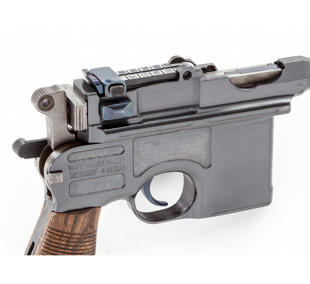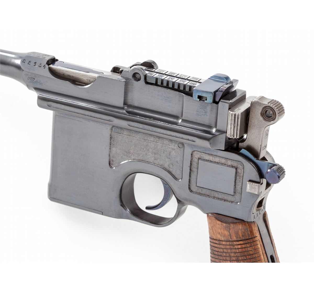 Mauser C-96 Red 9 Military Contract Broomhandle Semi-Automatic Pistol, #88154, 9mm, 5-1/2'' barrel, blue finish, Red 9 marked 24-groove walnut grip. Front of magazine well with Imperial German eagle. Condition is excellent as professionally restored, retaining approx. 99% correct type blue. Grips, action and bore are excellent. Est.: $1,800-$2,400. (C&R)