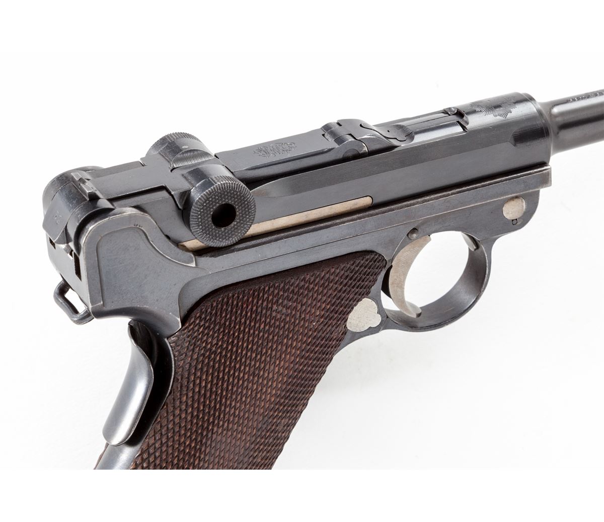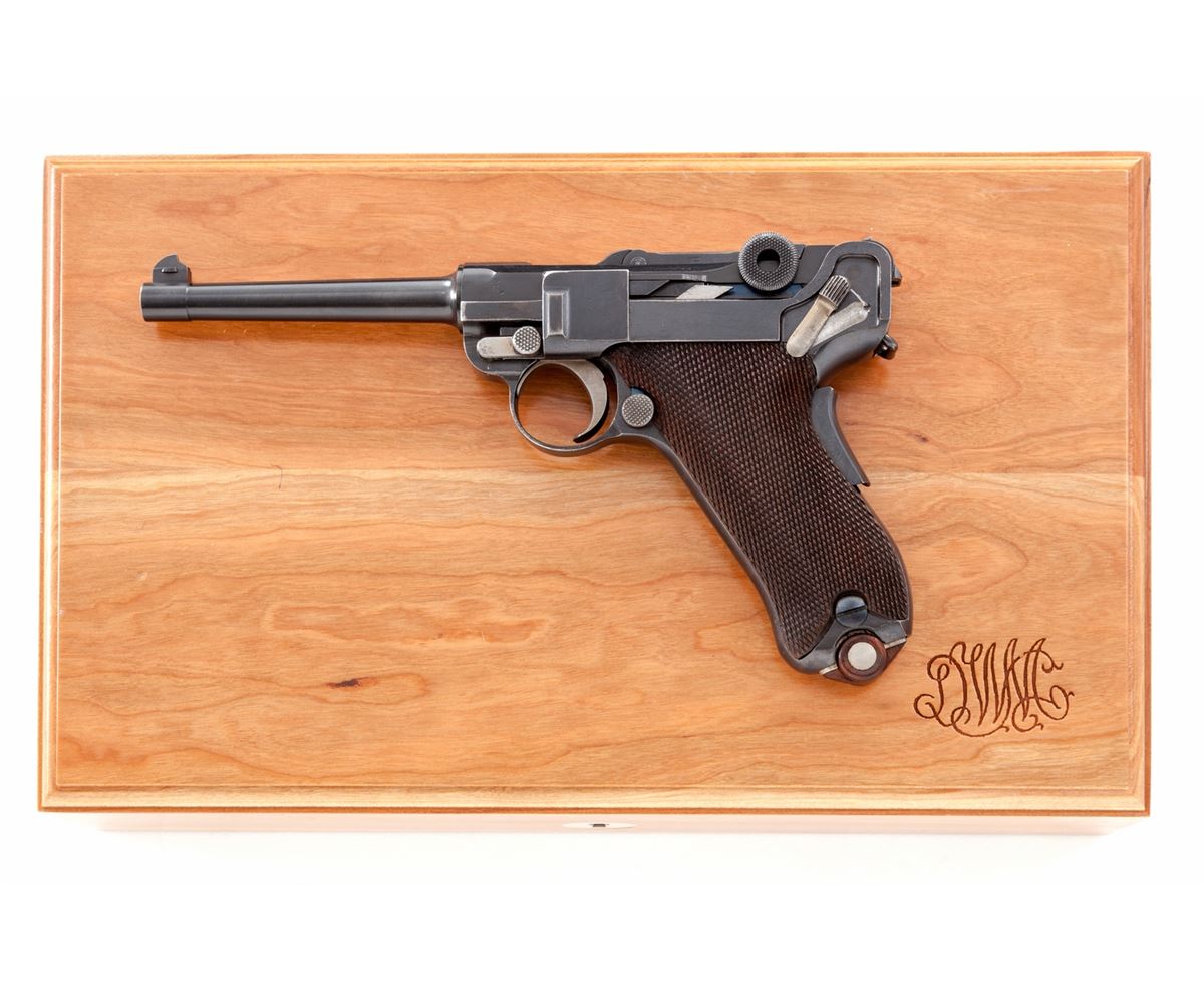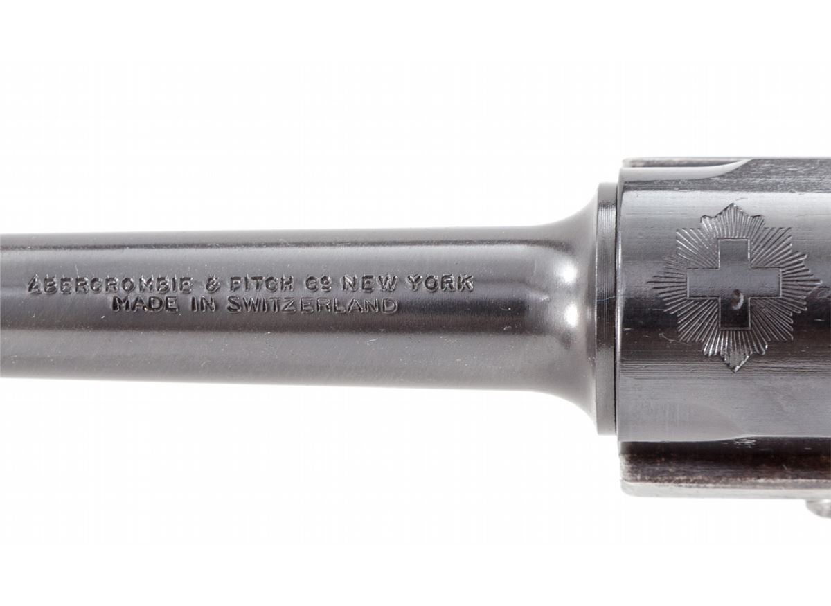 Abercrombie & Fitch marked Model 1922 Luger, #2052i, .30 Luger cal., 4-3/4'' barrel, blue finish with straw small parts, factory checkered walnut grips, with one correct tin-plated magazine with walnut base having bright metal insert. Lower portion of safety area polished bright, extractor marked ''Geladen'', Swiss cross in sunburst to chamber area, DWM to central toggle link. Top of barrel marked ''Abercrombie & Fitch Co., New York/Made in Switzerland''. Considered quite scarce with only approx. 50 mfg'd in this caliber. Condition is fine to near excellent with some evidence of touchup. ''A&F'' logo has been rolled before the finish was applied. Approx. 96% blue is retained and straw parts have thinned to 75%. Grips with minor flattening. Action is crisp, bore is bright. In modern made red velvet lined wooden display case. Est.: $3,500-$5,000. (C&R)