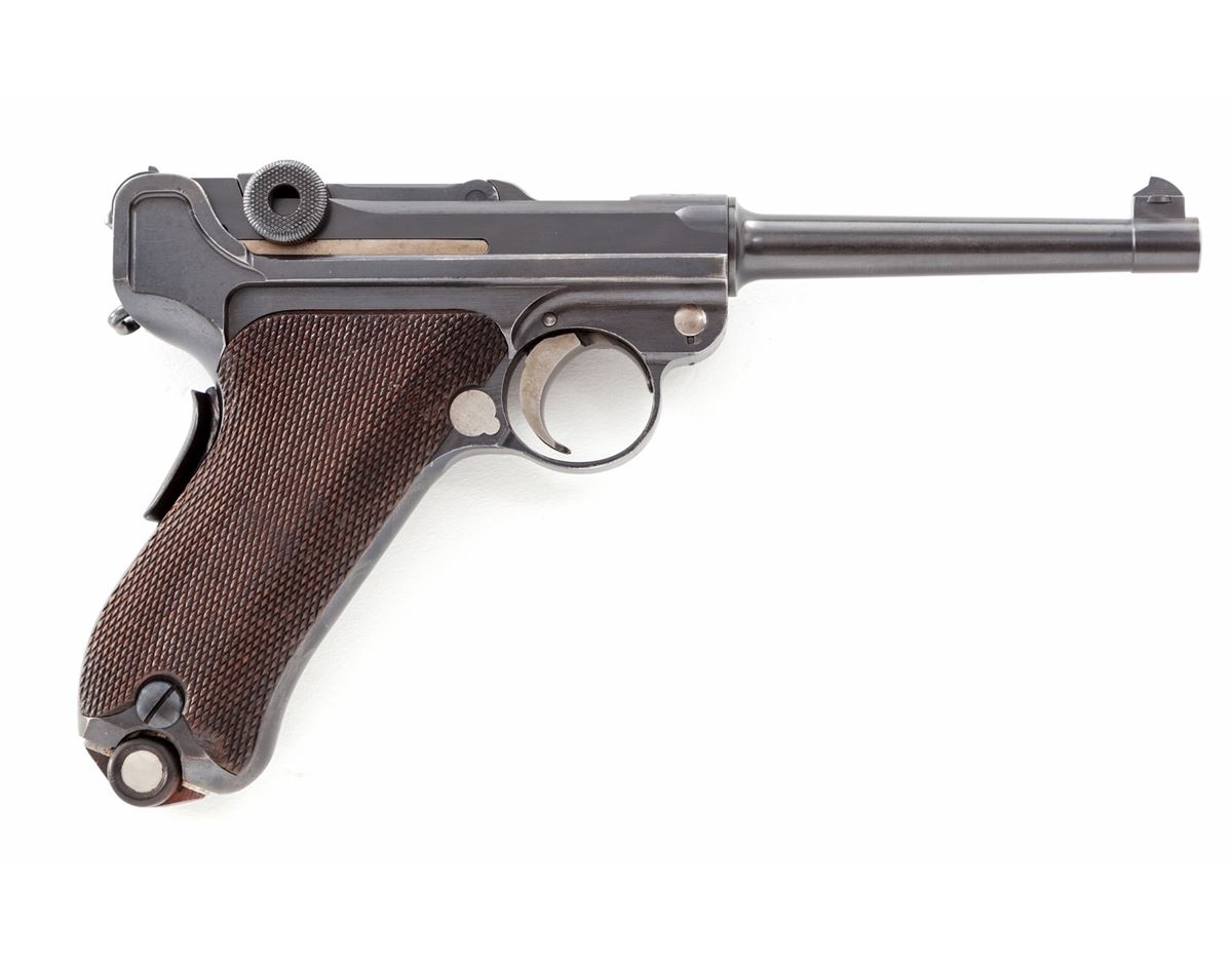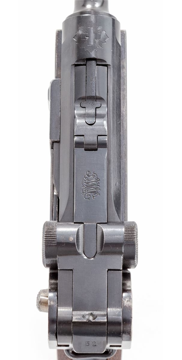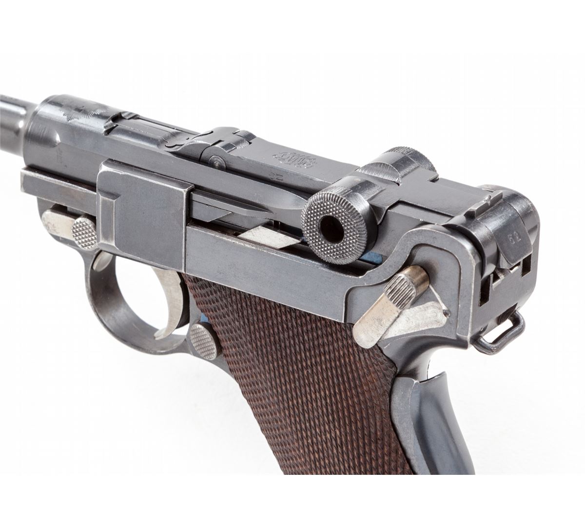 Abercrombie & Fitch marked Model 1922 Luger, #2052i, .30 Luger cal., 4-3/4'' barrel, blue finish with straw small parts, factory checkered walnut grips, with one correct tin-plated magazine with walnut base having bright metal insert. Lower portion of safety area polished bright, extractor marked ''Geladen'', Swiss cross in sunburst to chamber area, DWM to central toggle link. Top of barrel marked ''Abercrombie & Fitch Co., New York/Made in Switzerland''. Considered quite scarce with only approx. 50 mfg'd in this caliber. Condition is fine to near excellent with some evidence of touchup. ''A&F'' logo has been rolled before the finish was applied. Approx. 96% blue is retained and straw parts have thinned to 75%. Grips with minor flattening. Action is crisp, bore is bright. In modern made red velvet lined wooden display case. Est.: $3,500-$5,000. (C&R)