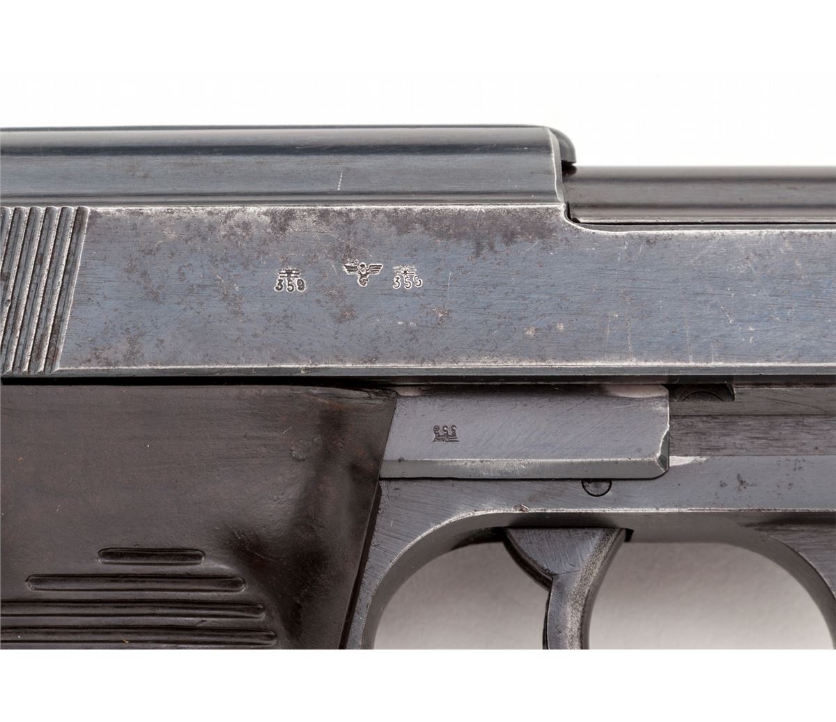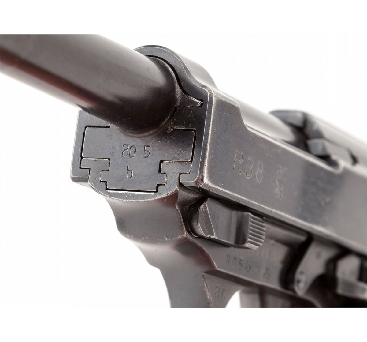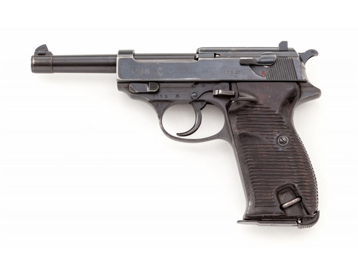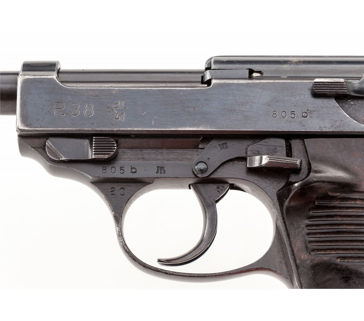 1st Variation ac-41 Walther P-38 Semi-Automatic Pistol, #805b, 9mm, 4-7/8'' barrel, blue finish, grooved phenolic resin grips, with one ''ac'' marked magazine, ''ac'' marked to front left triggerguard bow, and ''(stick eagle)/359'' ampt to small parts. Condition is fine to near excellent retaining approx. 90%-92% blue. Grips show light general wear. Action is crisp, bore is good with mild frosting in the grooves. Est.: $1,000-$1,500. (C&R)