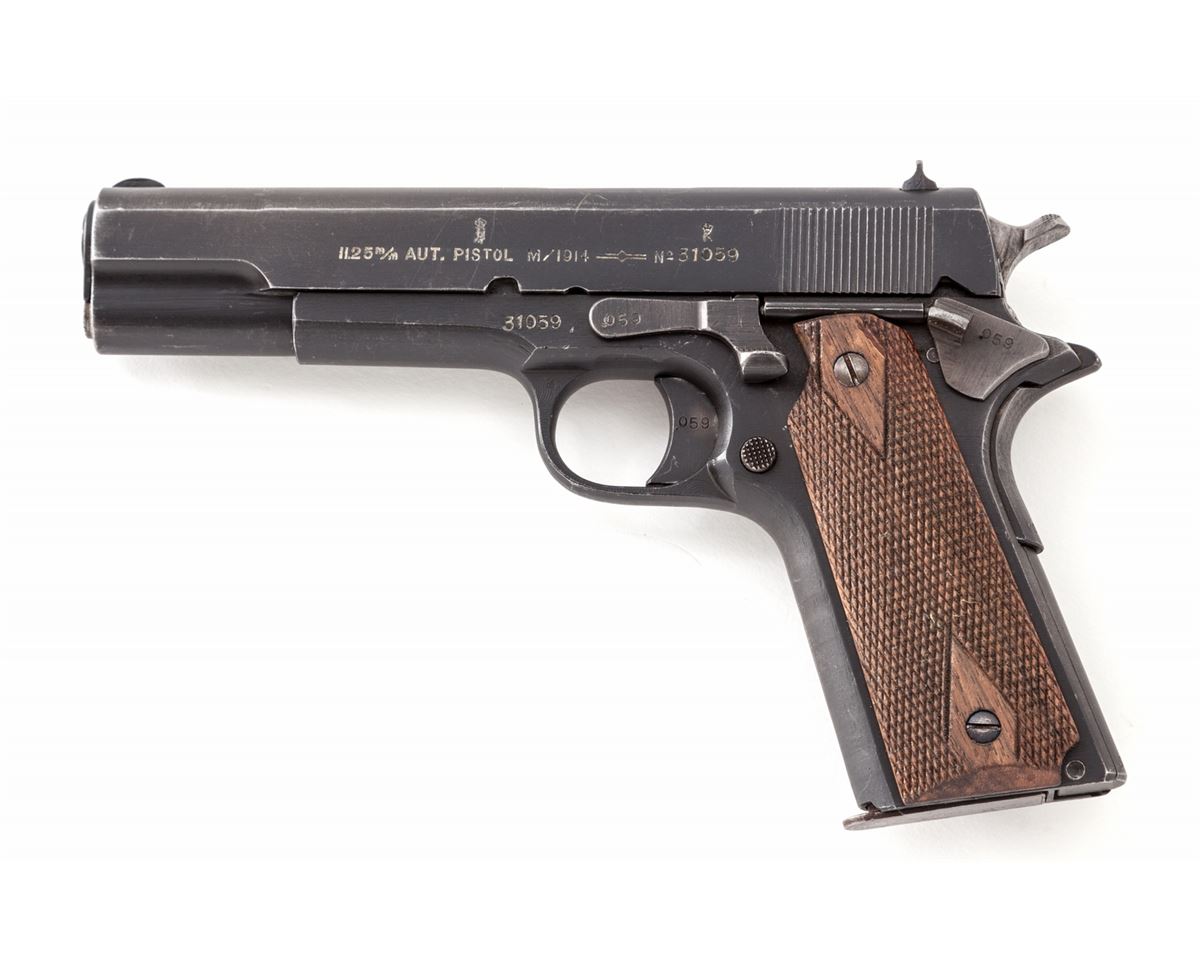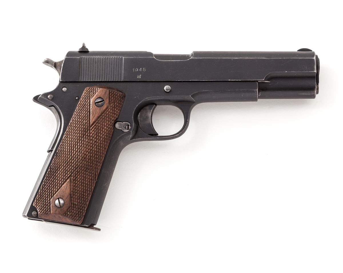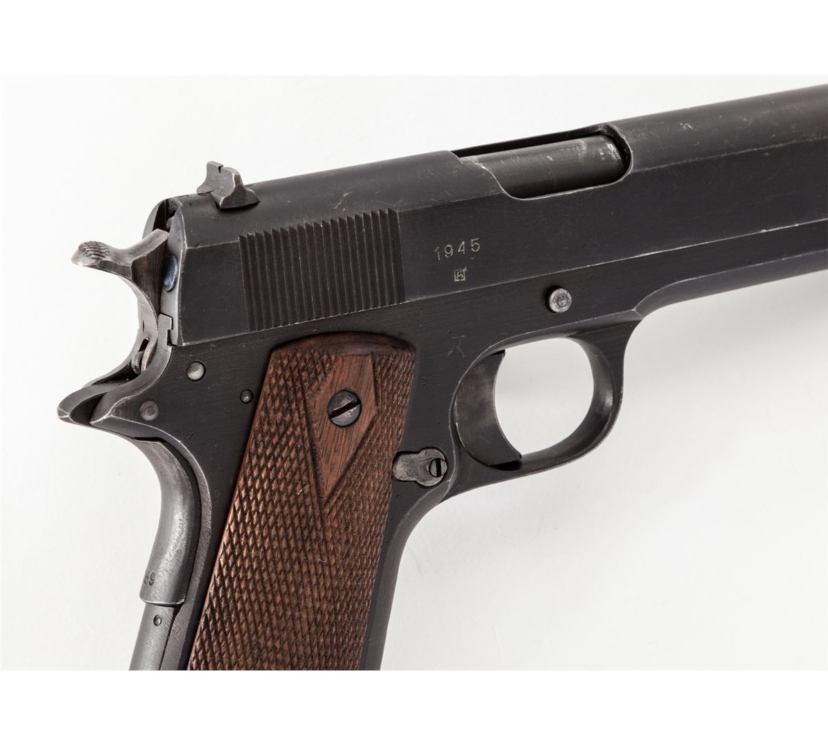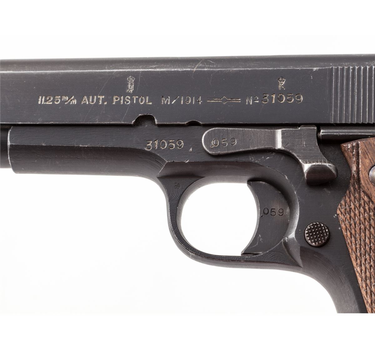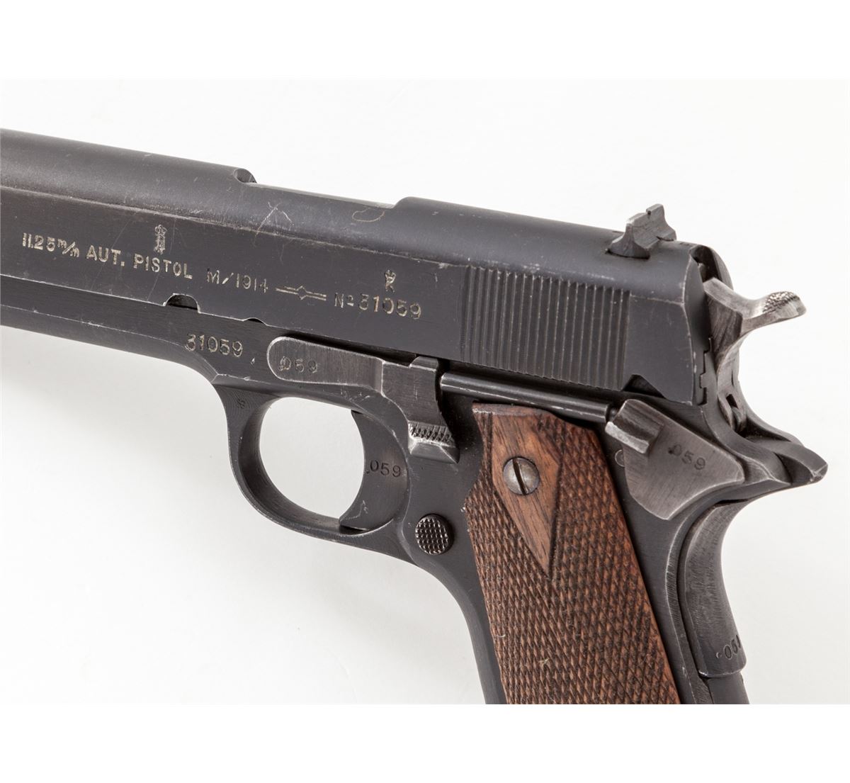 Norwegian Model 1914 Semi-Automatic Pistol, #31059, .45 ACP cal., 5'' barrel, phosphate finish, with replacement diamond checkered walnut grips, and Norwegian magazine. Matching slide and visible parts including barrel, with 1945 date to right side of slide. Condition is excellent retaining approx. 92% original thinning finish. Grips and action are crisp, bore is bright. Est.: $1,800-$2,400. (C&R/PPT)