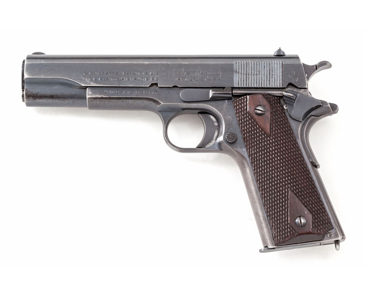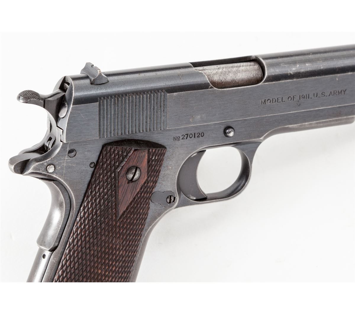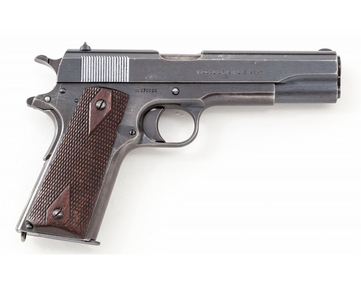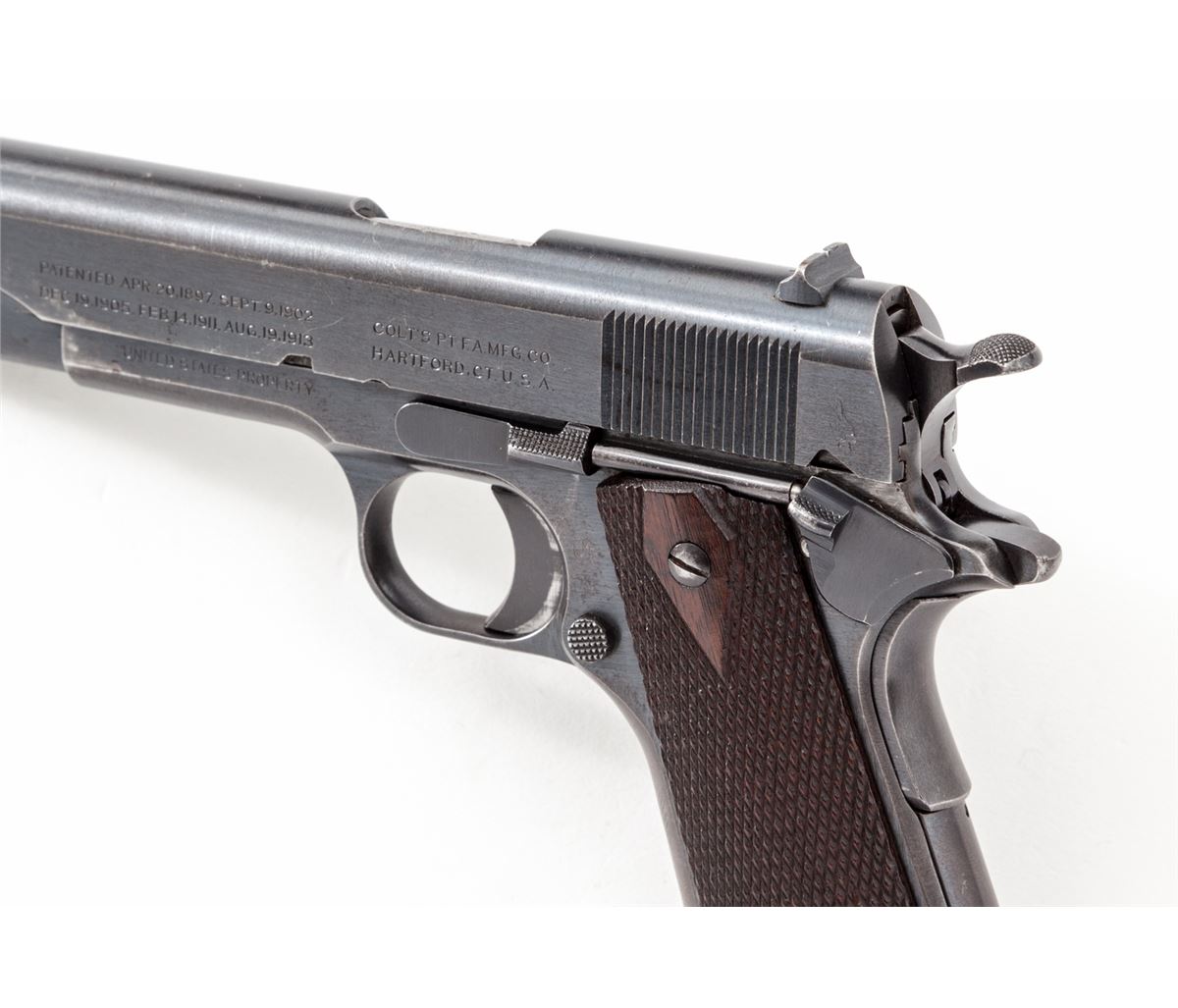 Colt Model of 1911 Semi-Automatic Pistol, #270120, .45 ACP cal., 5'' original barrel with ''P-H'' inspector's mark, blue finish, factory checkered large diamond walnut grips, with one loopless two-tone magazine and ''JMG'' inspector's mark. Mfg'd 1918. Condition is fine retaining approx. 95% original blue with thinning at high edges, forward portion of frame, front strap and mainspring housing. Grips show mild flattening, somewhat more pronounced to right side. Crisp action, bright bore. Est.: $1,800-$2,400. (C&R/PPT)