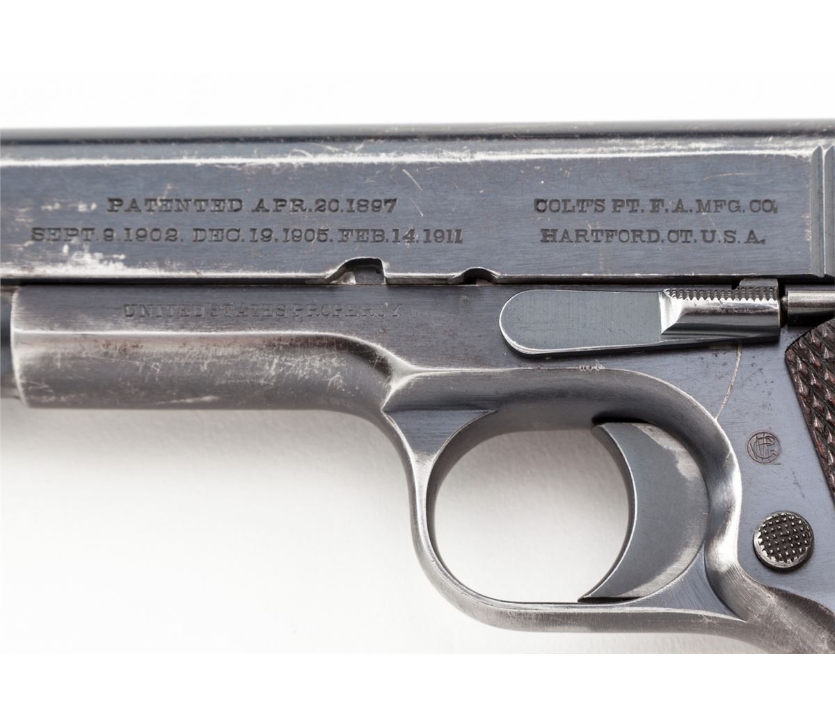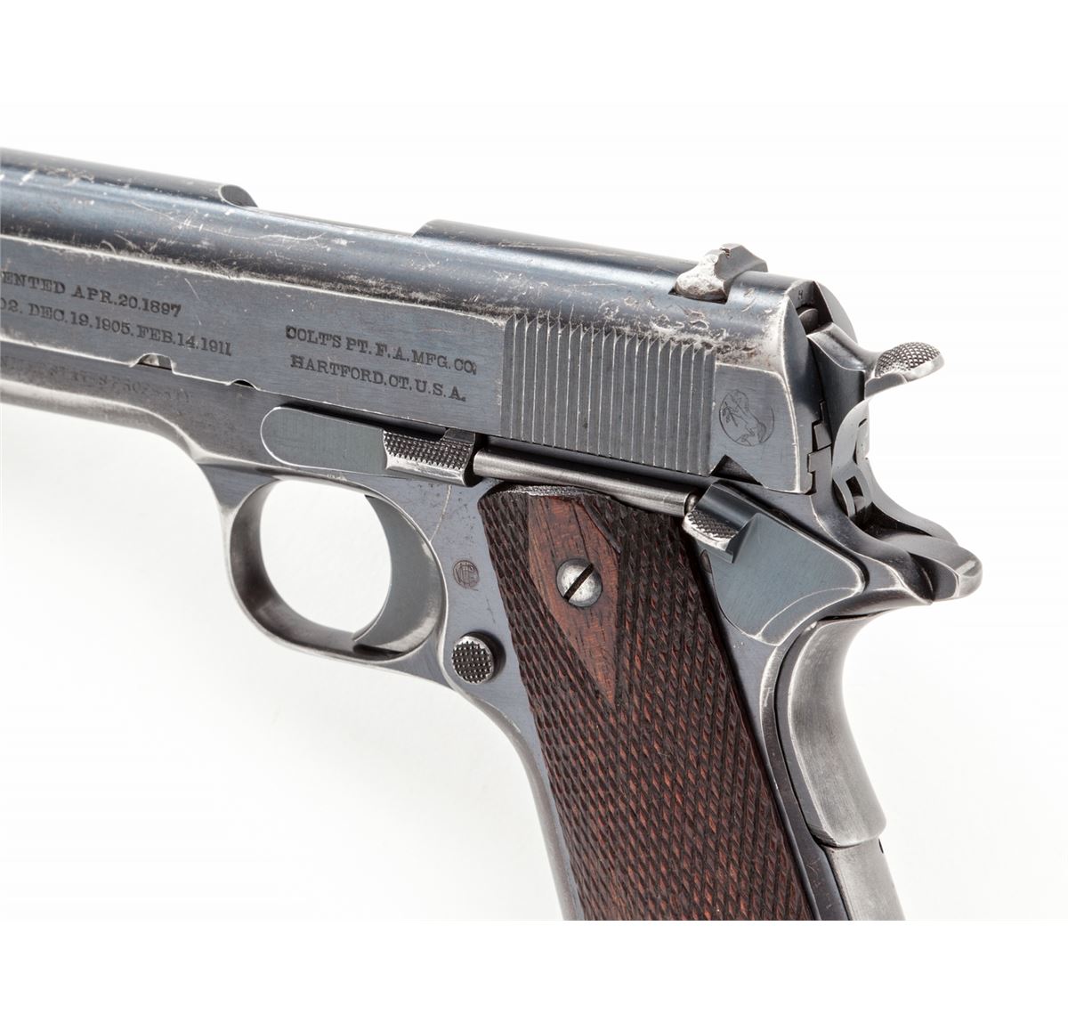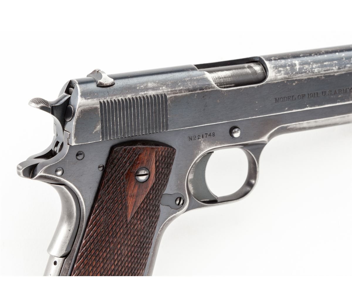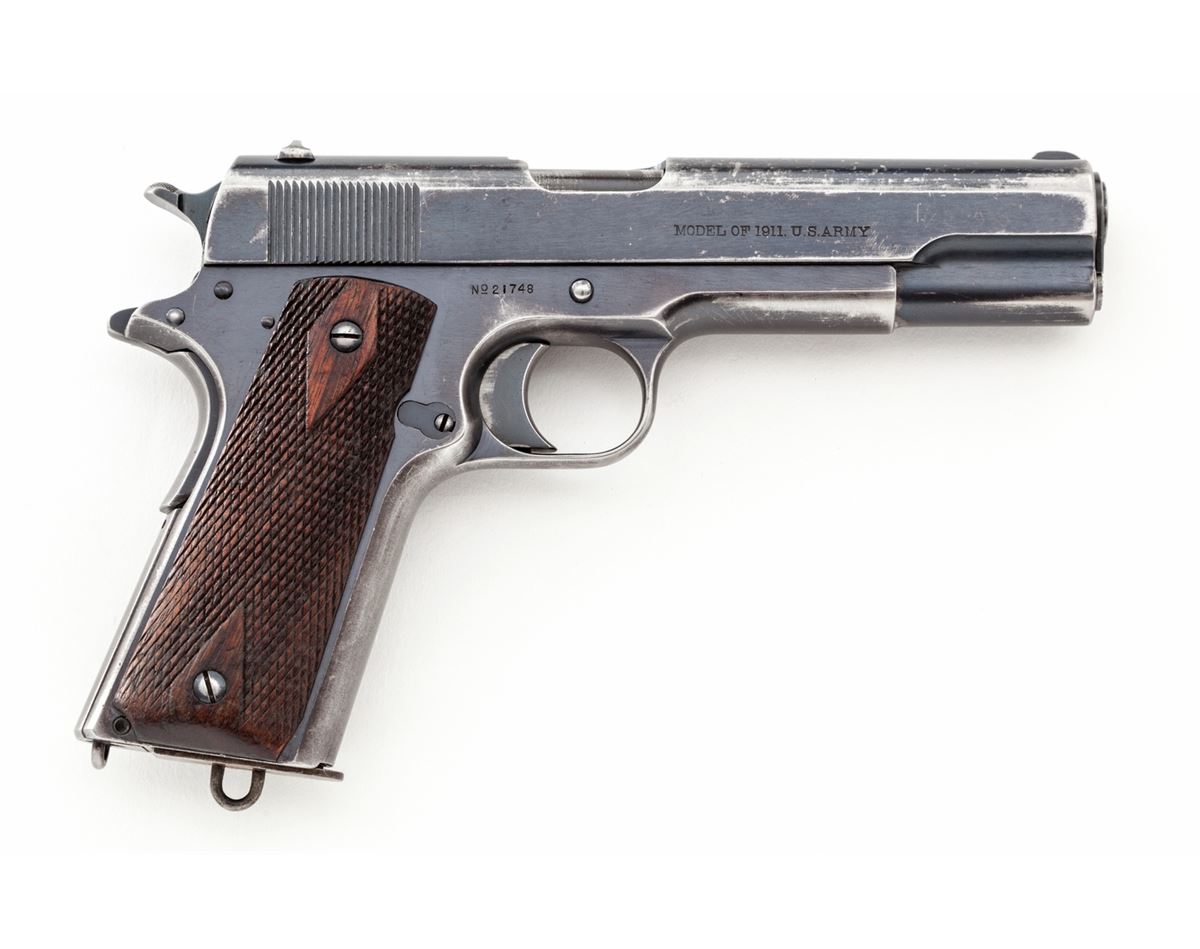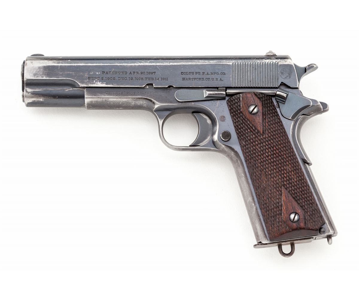 Colt Model 1911 Semi-Automatic Pistol, #21748, .45 ACP cal., 5'' barrel, blue finish, factory checkered large diamond walnut grips, with one two-tone magazine and early features. Walter G. Penfield inspected, shipped to Rock Island Arsenal, Feb. 13, 1913, with WWII Colt replacement barrel. (See the book, ''Government Models'', by Goddard.) Condition is fine retaining approx. 85%+ original finish with most of the losses to front strap, mainspring housing, and at muzzle area of slide. Early round rear sight with small dings and scuffs to left side. Grips with light to moderate flattening in spots. Action is crisp, bore is fine. Est.: $2,500-$4,000. (C&R)