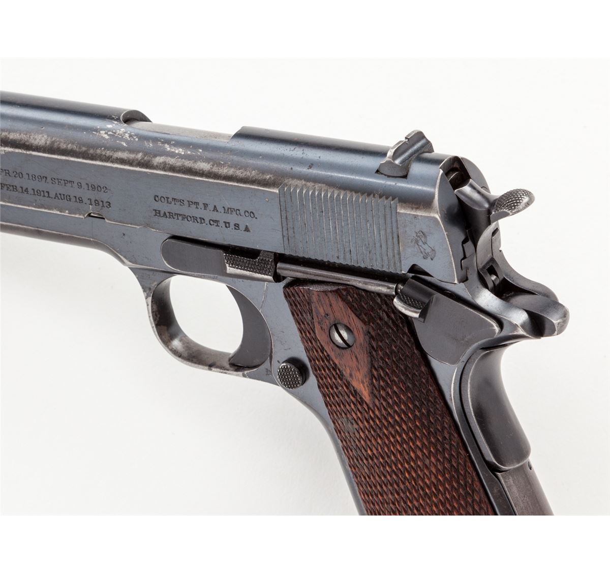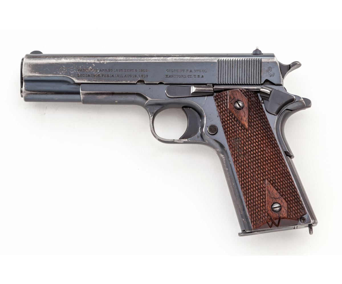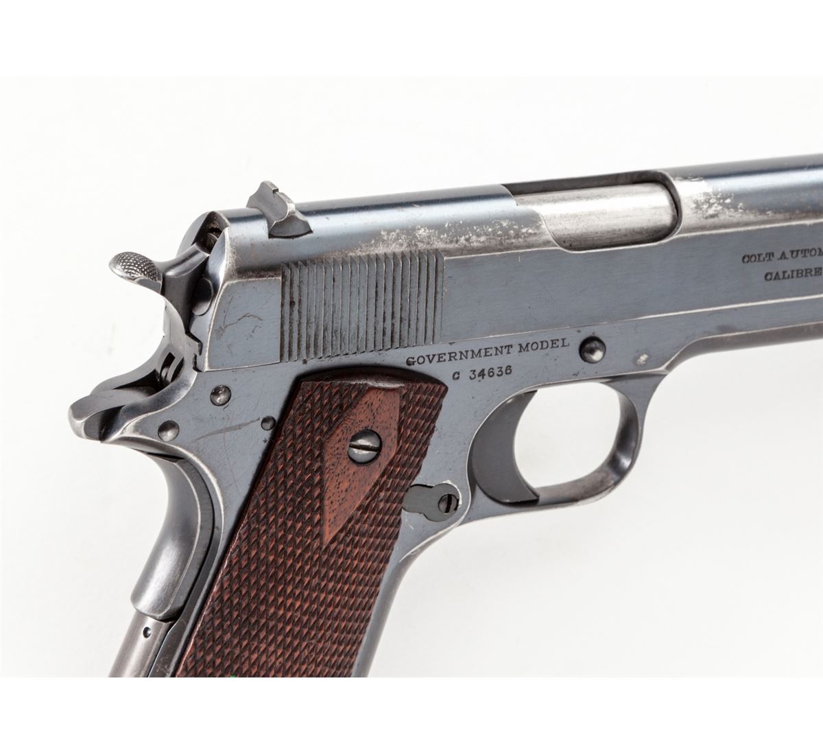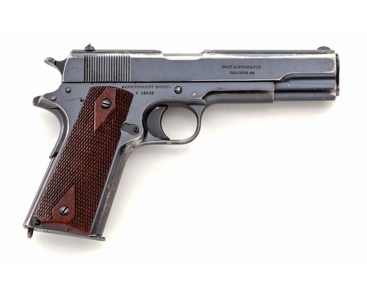Colt Government Model Semi-Automatic Pistol, #C34636, .45 ACP cal., 5'' barrel, factory blue finish, checkered walnut grips, with one two-tone loopless magazine. Mfg'd 1916. Condition is near fine retaining approx. 85% thinning blue, with thinning to front strap and mainspring housing. Grips show just moderate flattening. Action is good, bore is good with light frosting in the grooves near chamber area. Est.: $1,500-$2,000. (C&R/PPT)